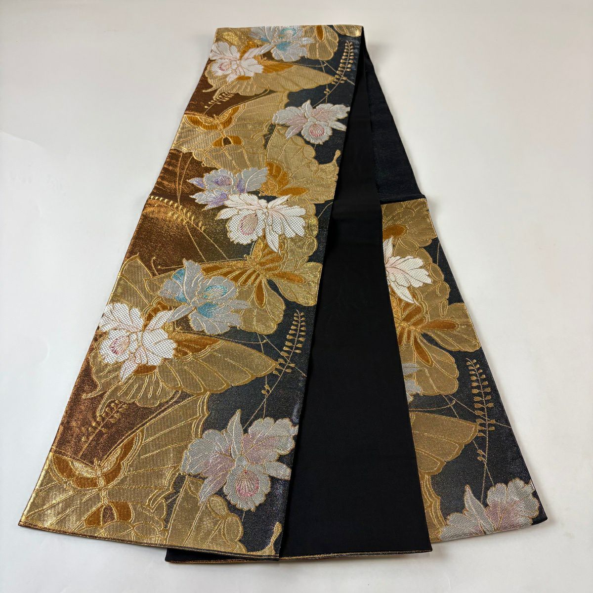 【美品】 袋帯 秀品 蝶 花 金銀糸 箔 金色 六通 正絹