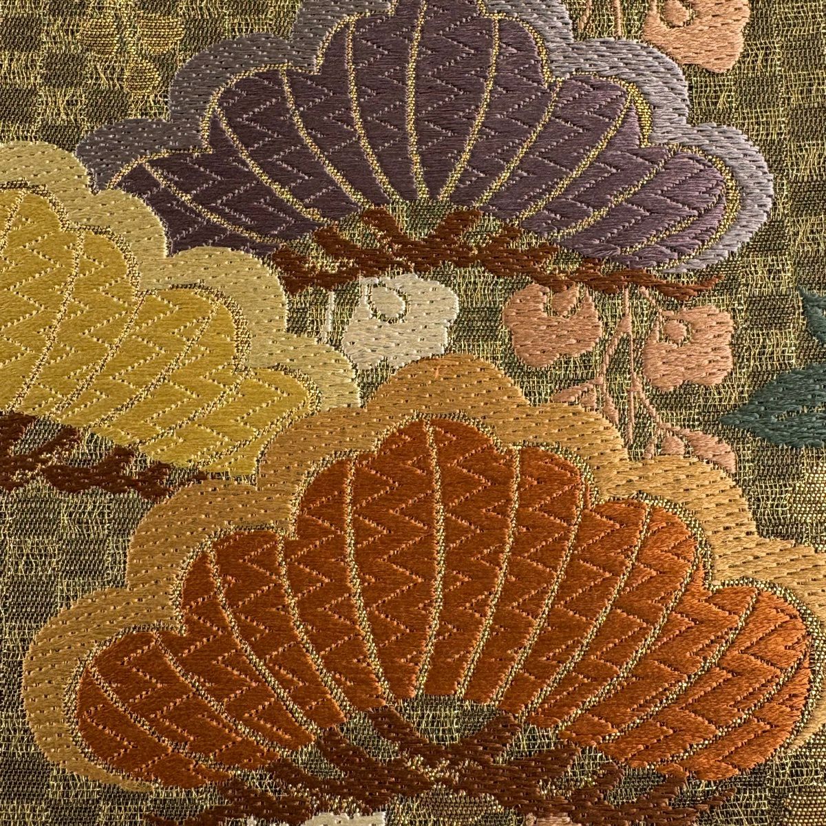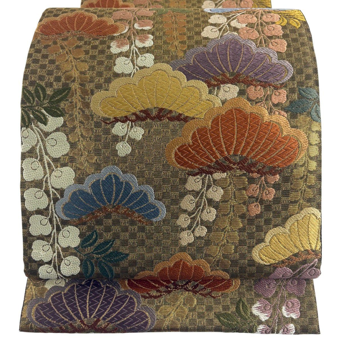 【美品】 袋帯 秀品 若松 舟 金彩 茶緑色 全通 正絹
