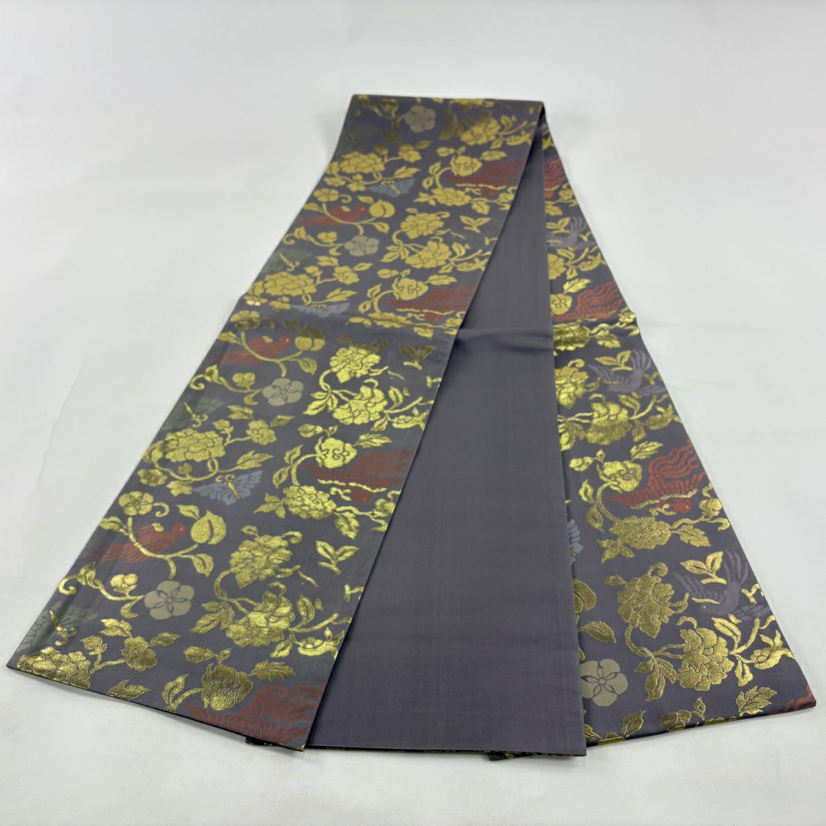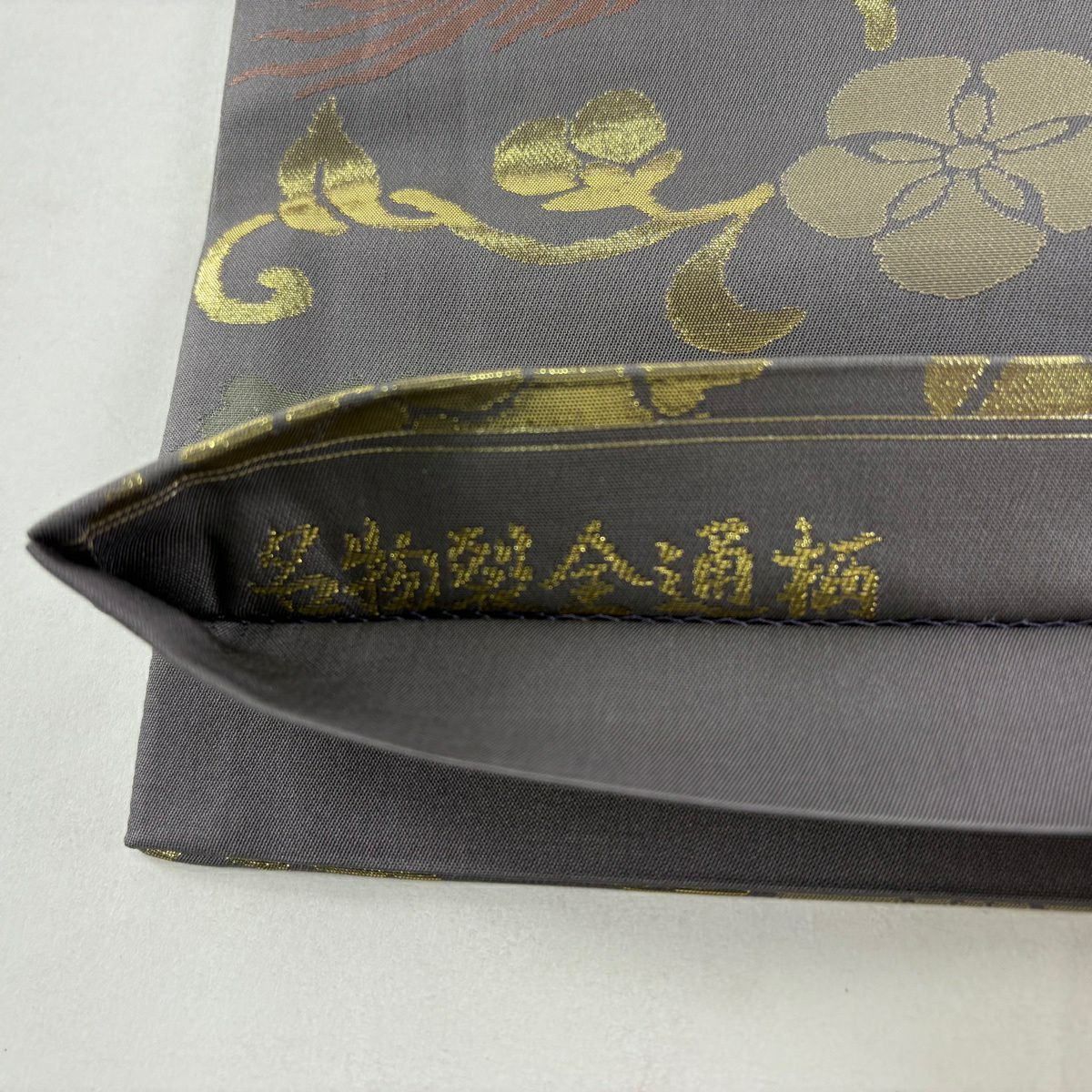 【美品】 袋帯 秀品 草花 金糸 金通し 灰茶 六通 正絹