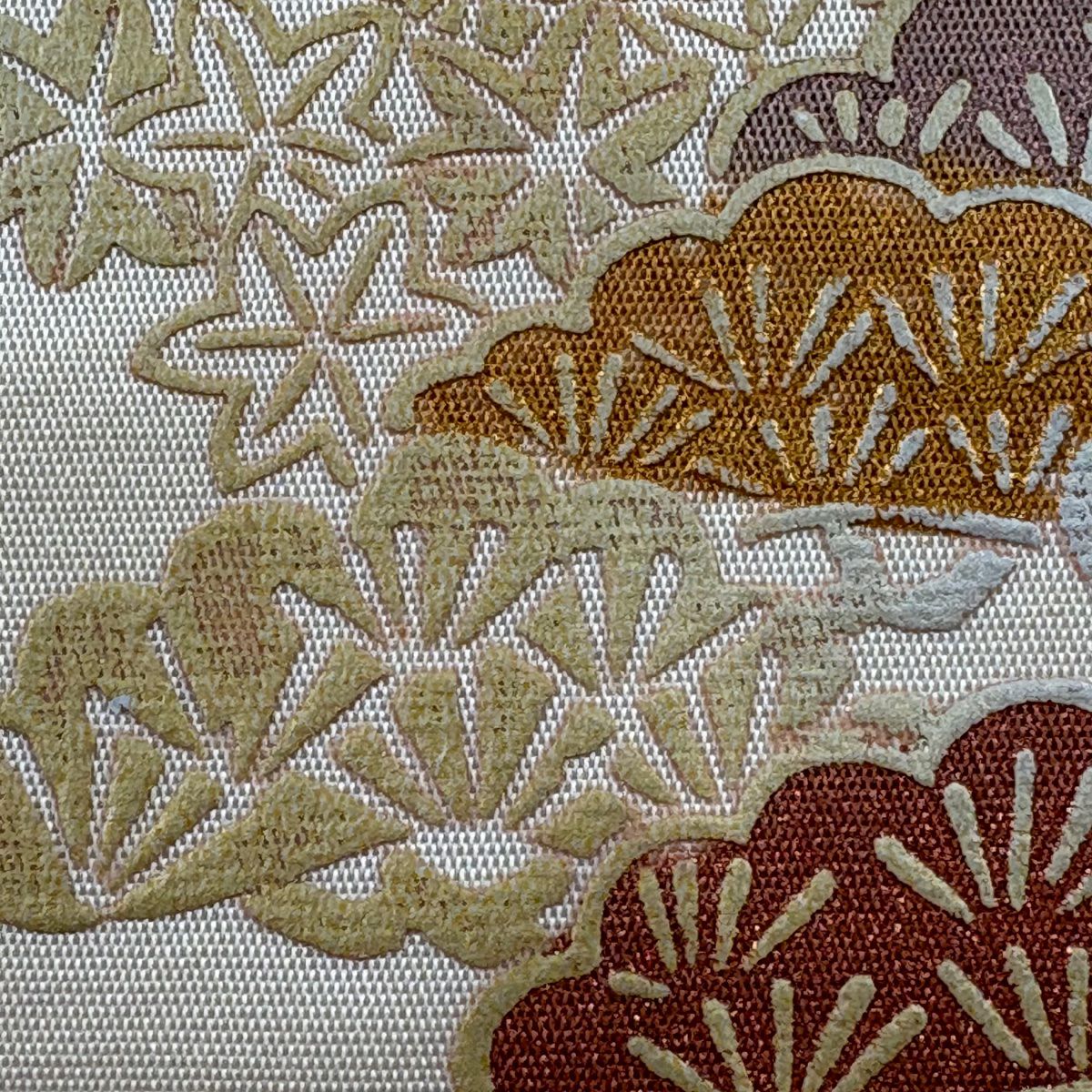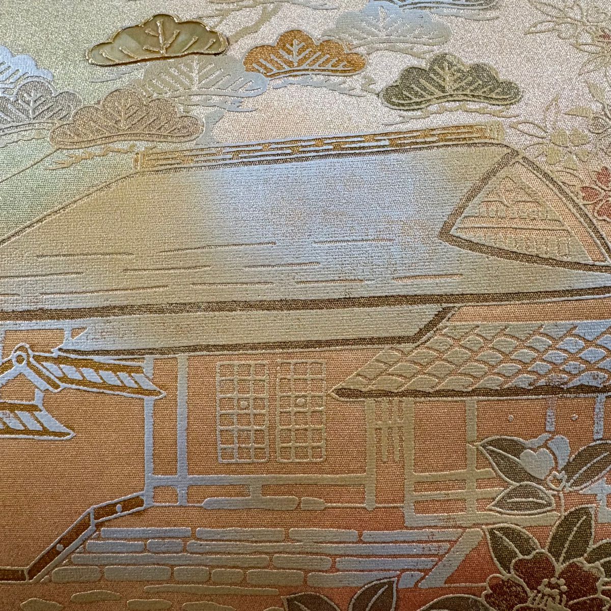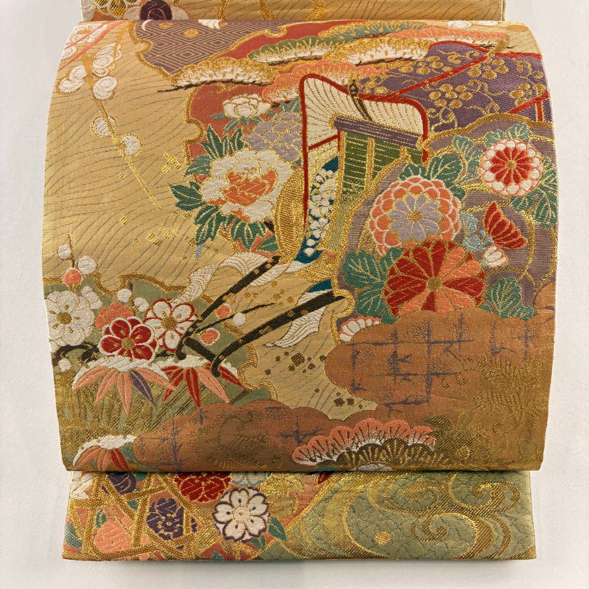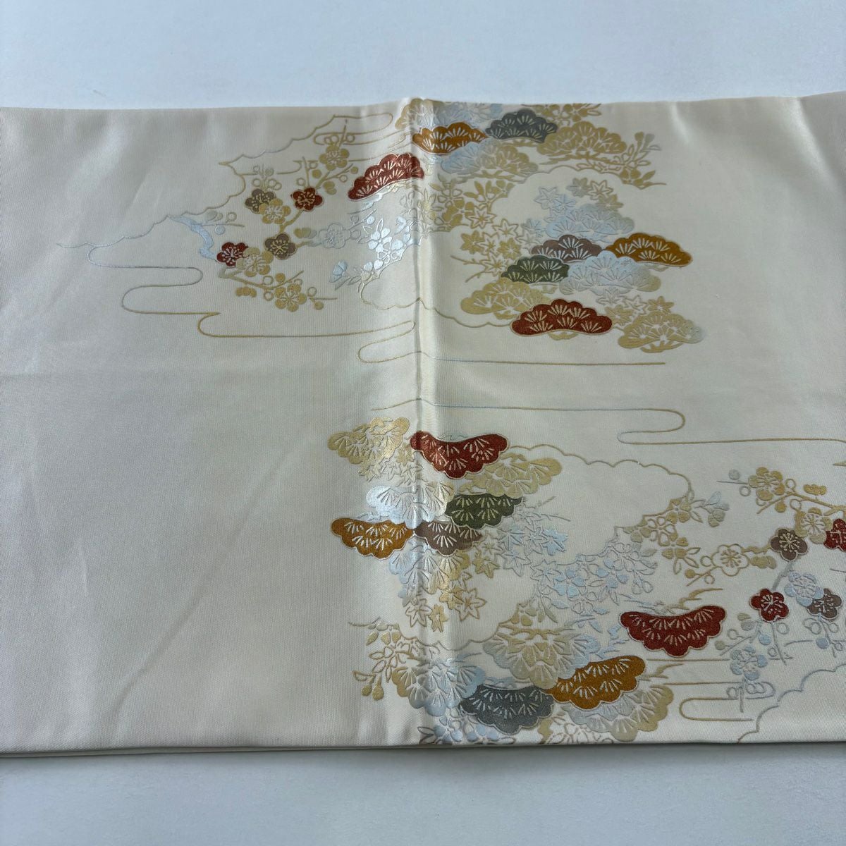 【最終値引き】 70%OFF 袋帯 秀品 建物 松竹梅 螺鈿 金銀彩 クリーム お太鼓柄 正絹 K70
