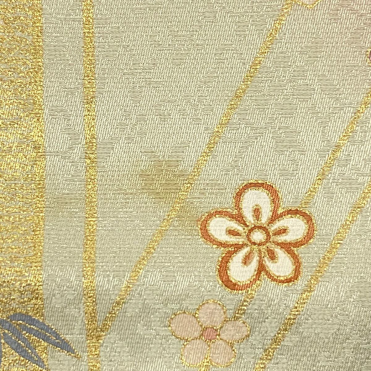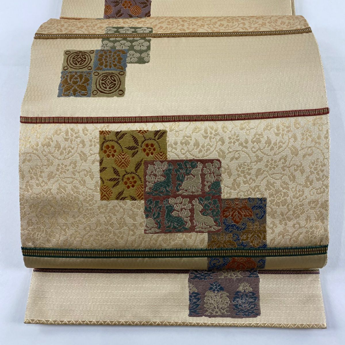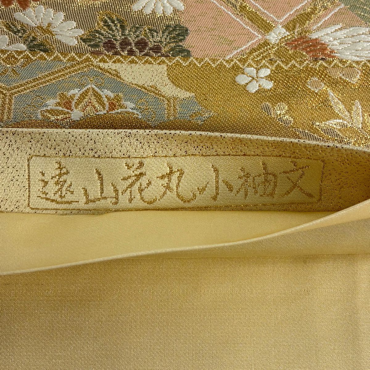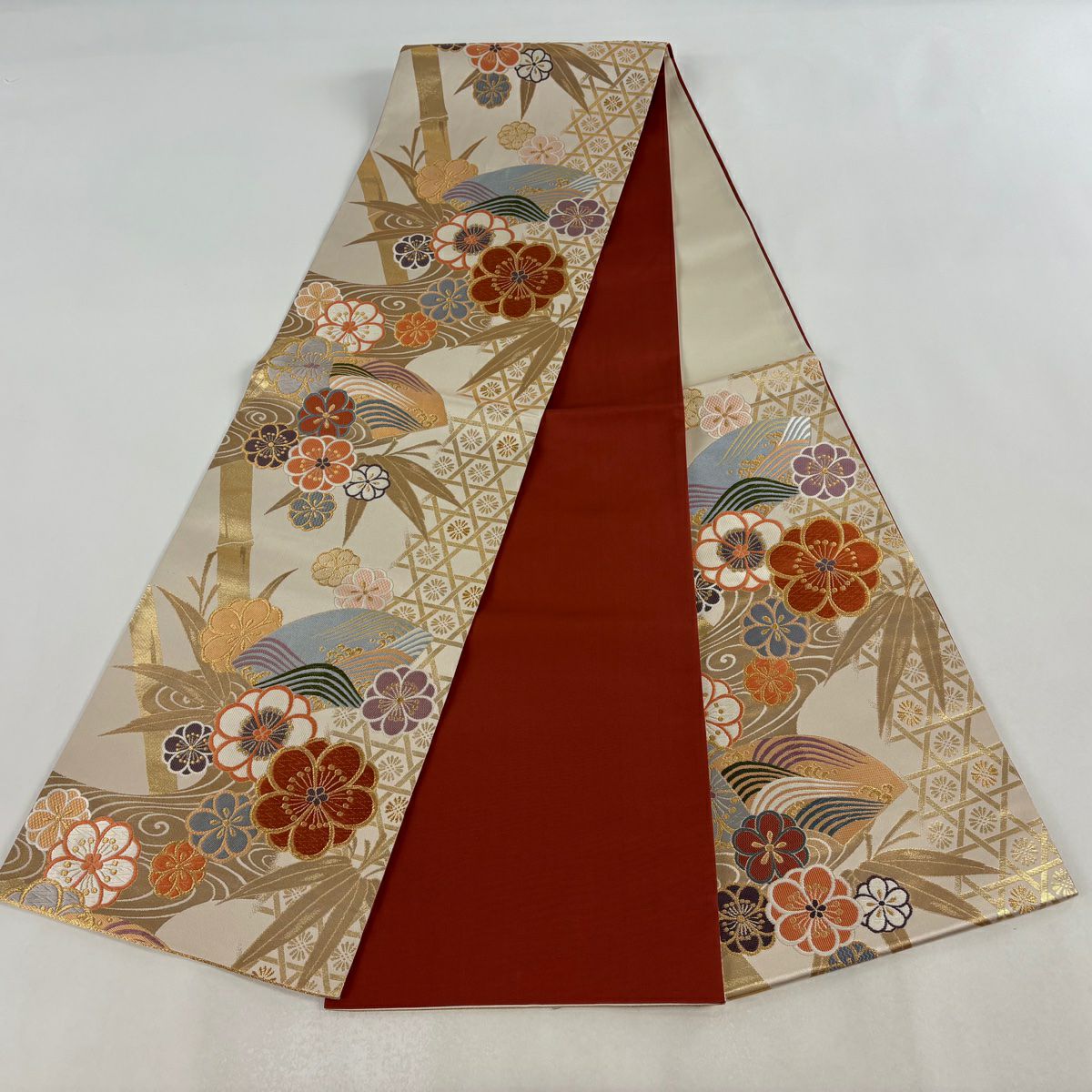 【最終値引き】 70%OFF 袋帯 秀品 建物 松竹梅 螺鈿 金銀彩 クリーム お太鼓柄 正絹 K70