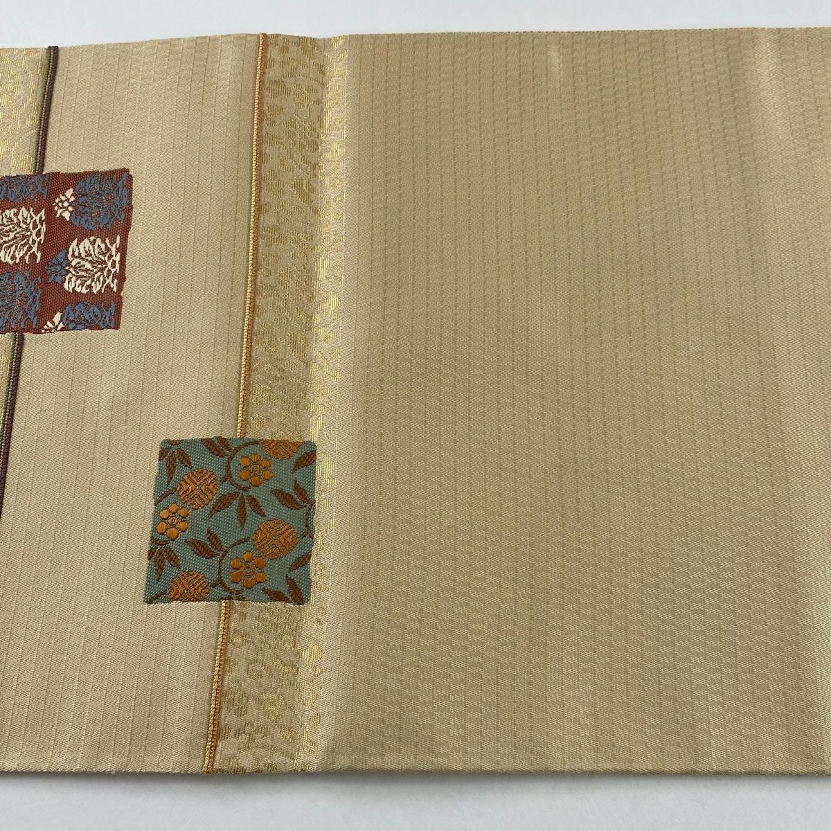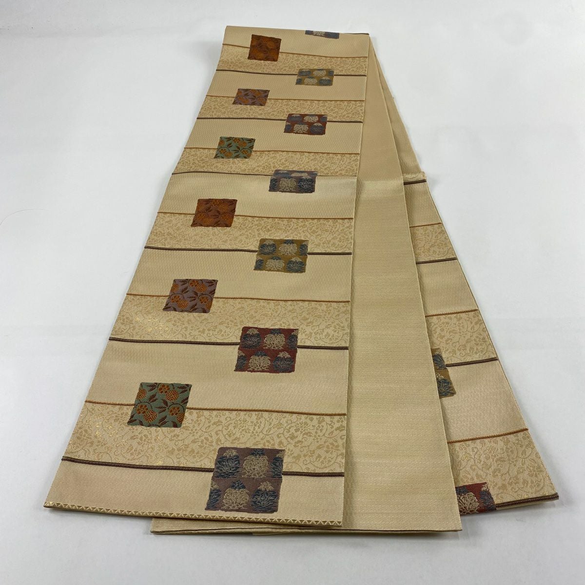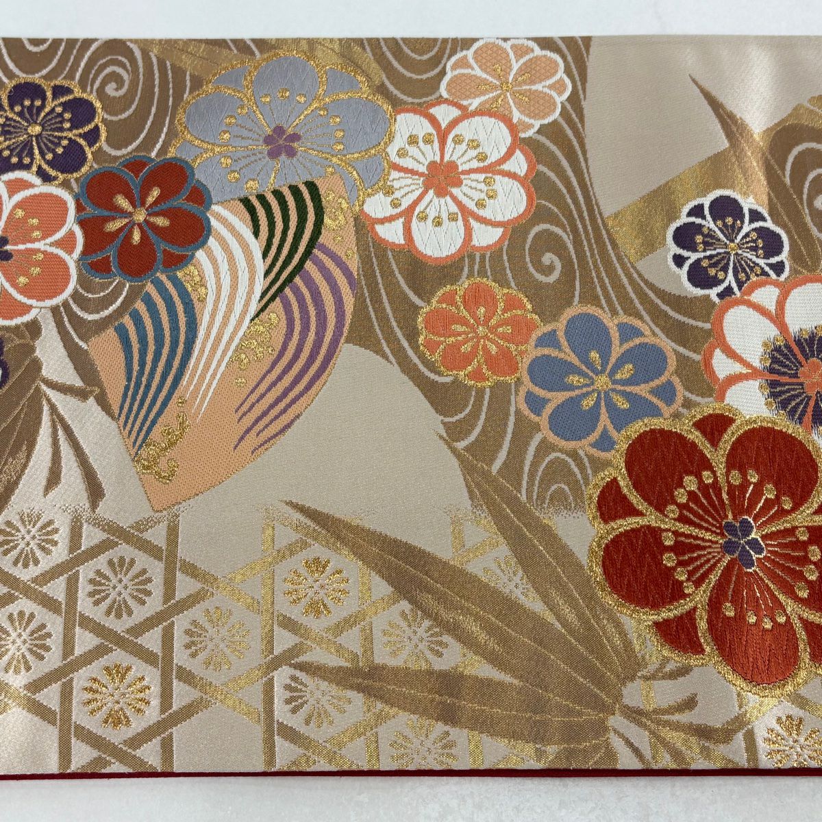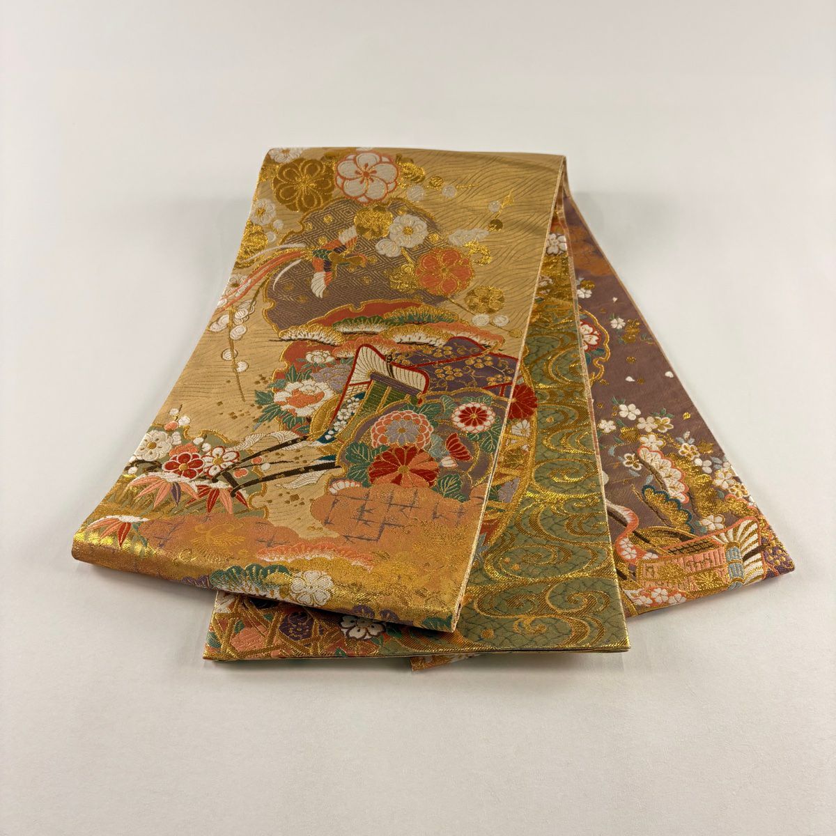 【最終値引き】 70%OFF 袋帯 秀品 建物 松竹梅 螺鈿 金銀彩 クリーム お太鼓柄 正絹 K70