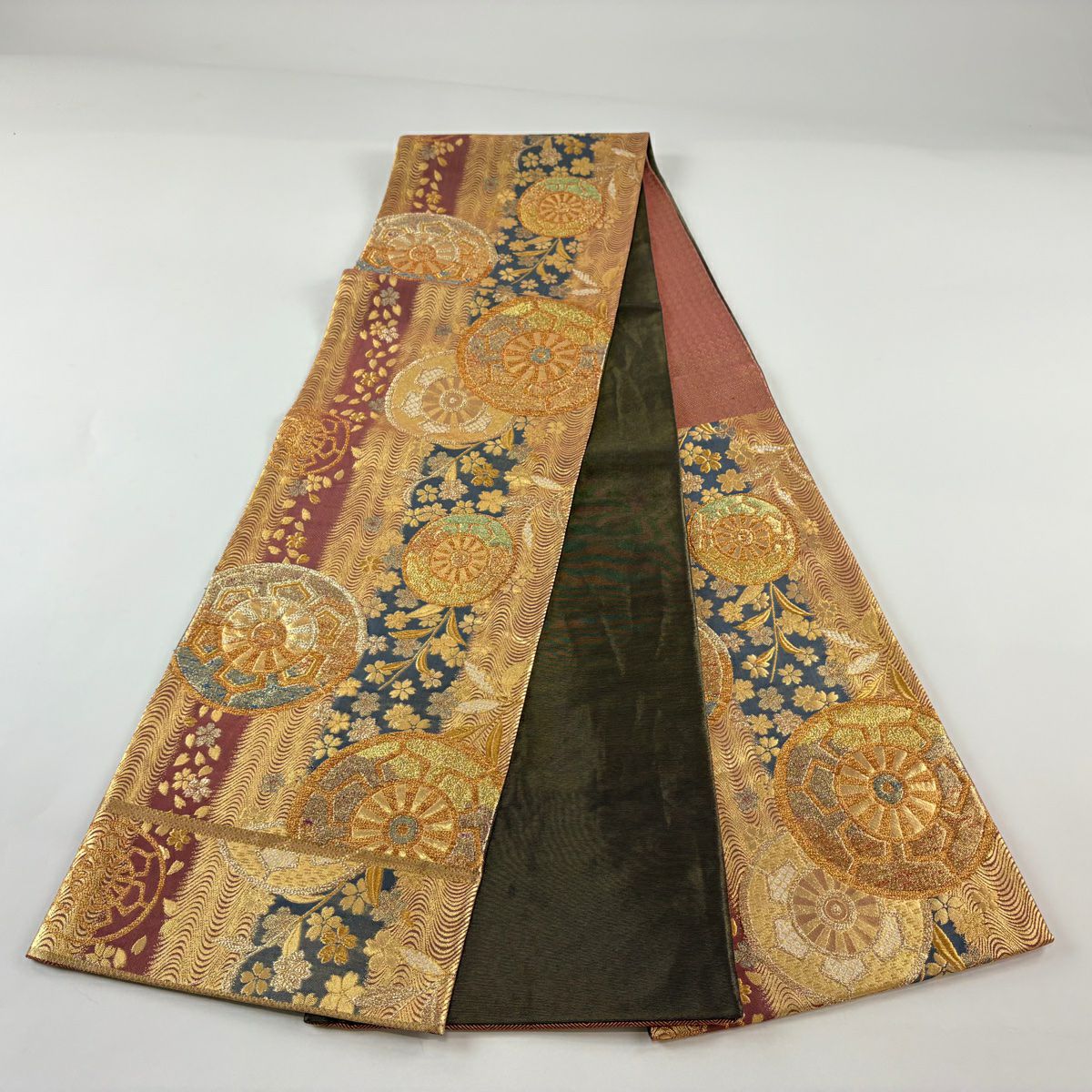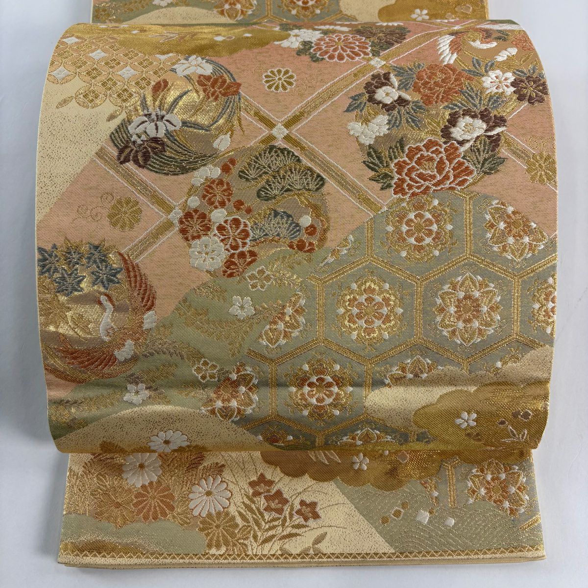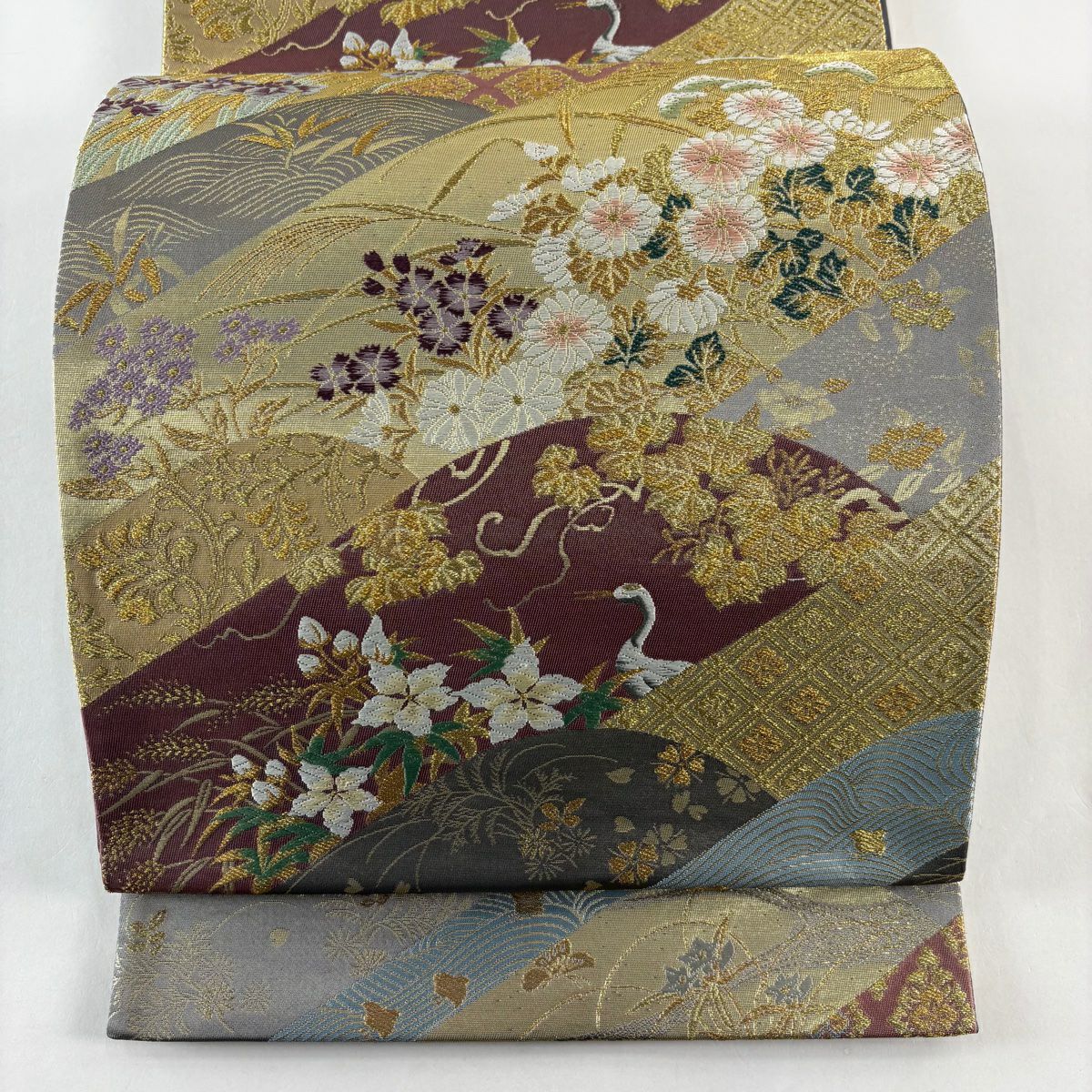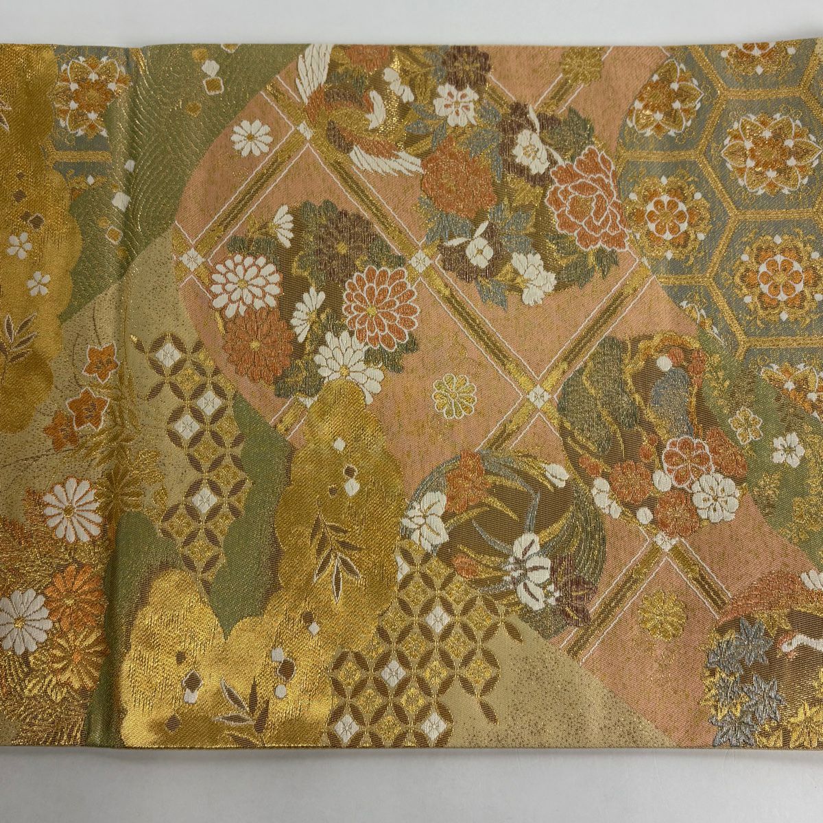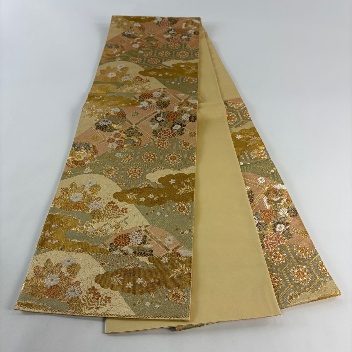 【最終値引き】 77%OFF 【美品】 袋帯 秀品 遠山菊鶴文 秋草 刺繍 金糸 金色 六通 正絹 K70