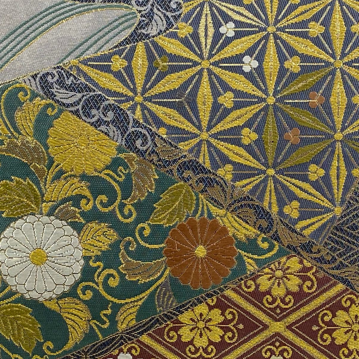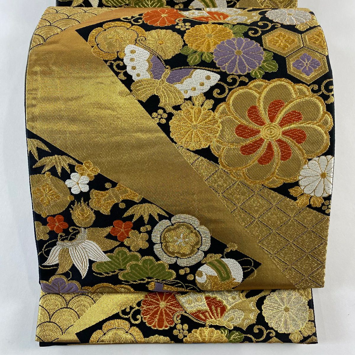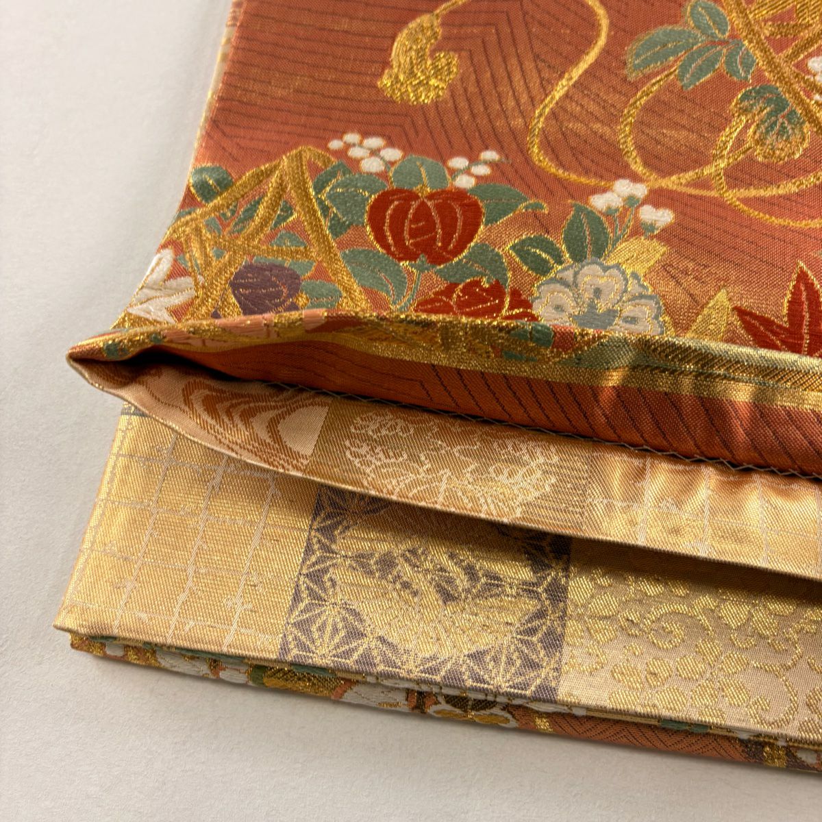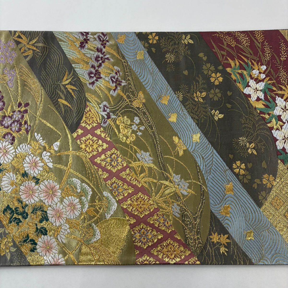 【最終値引き】 77%OFF 【美品】 袋帯 秀品 遠山菊鶴文 秋草 刺繍 金糸 金色 六通 正絹 K70