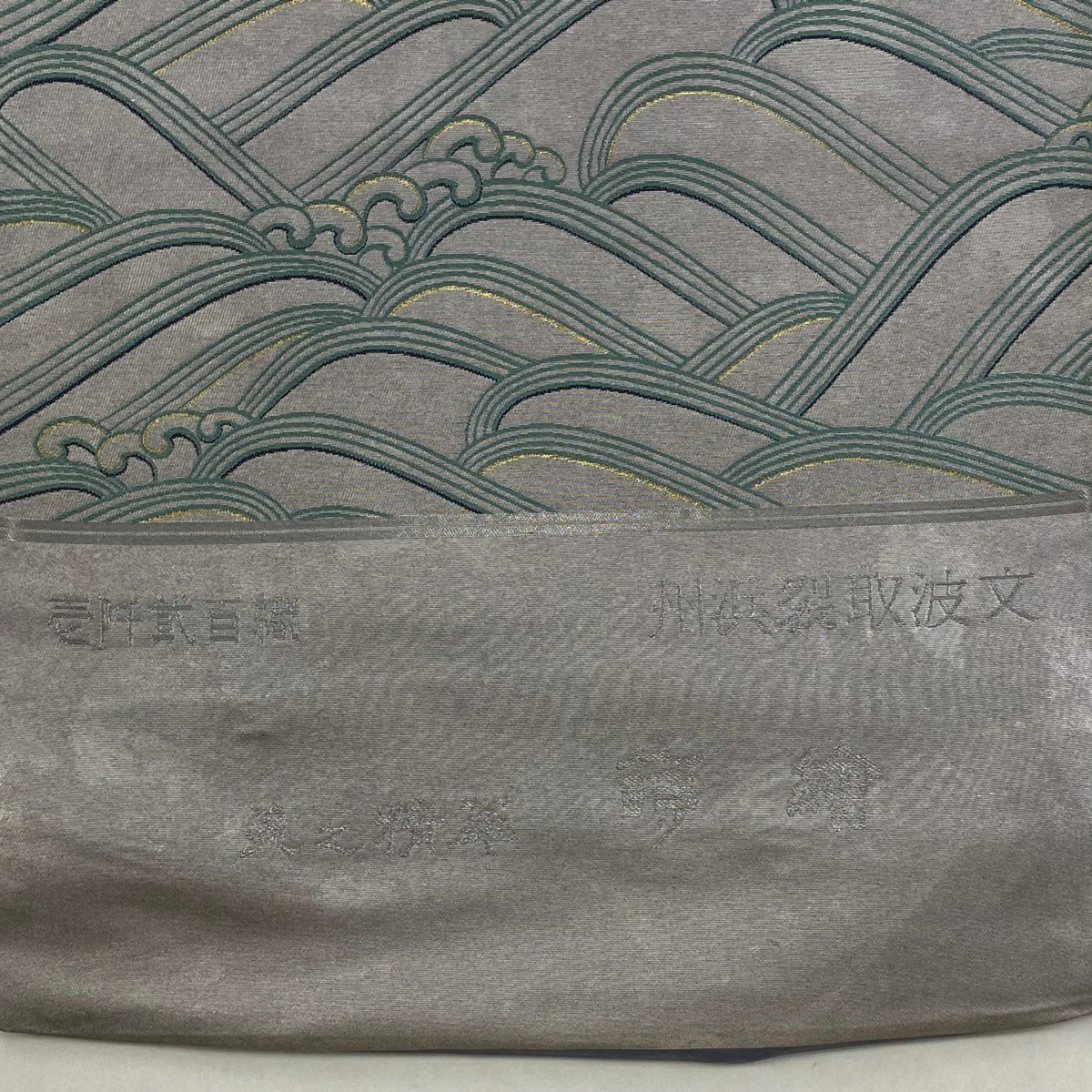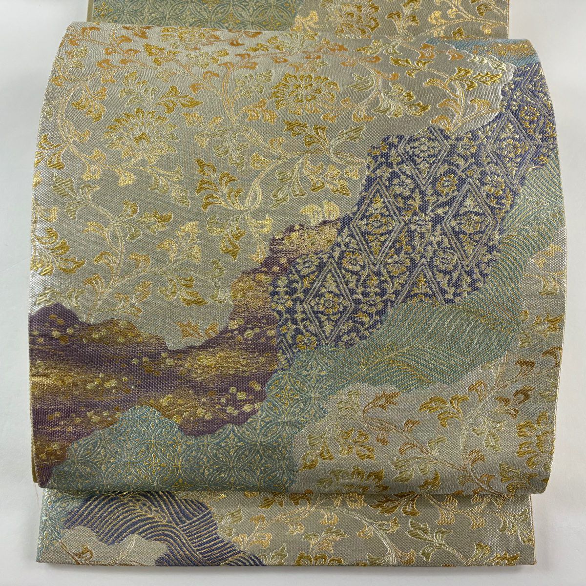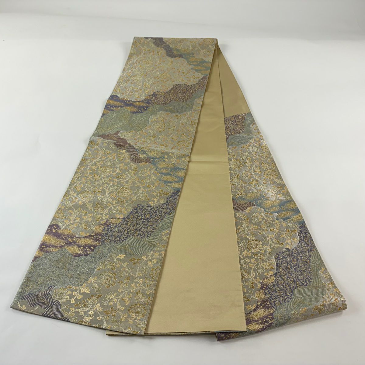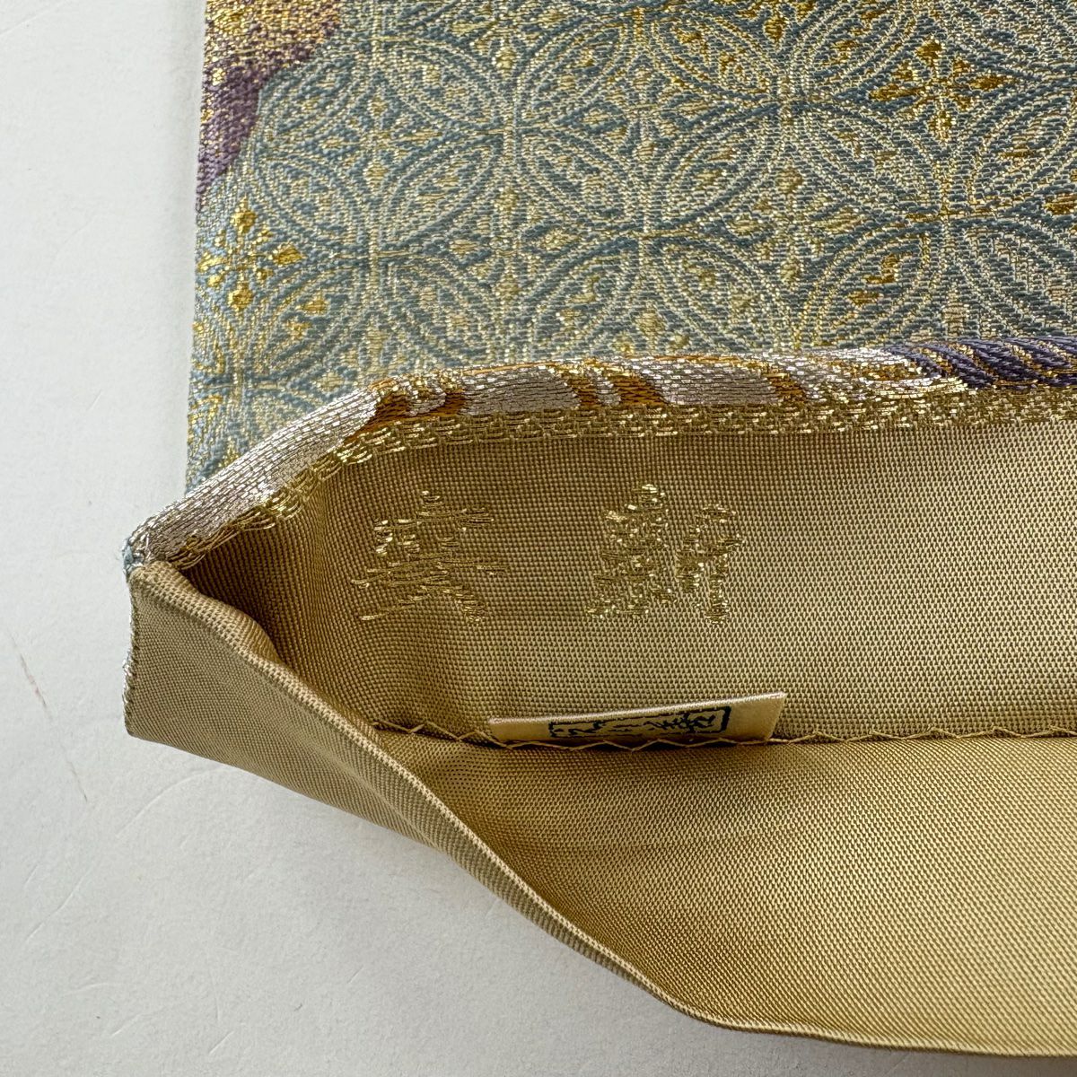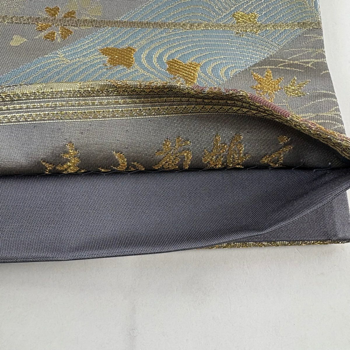 【在庫一掃】 【美品】 袋帯 秀品 証紙あり 州浜裂取波文 花唐草 波頭 金糸 箔 灰紫 お太鼓柄 正絹