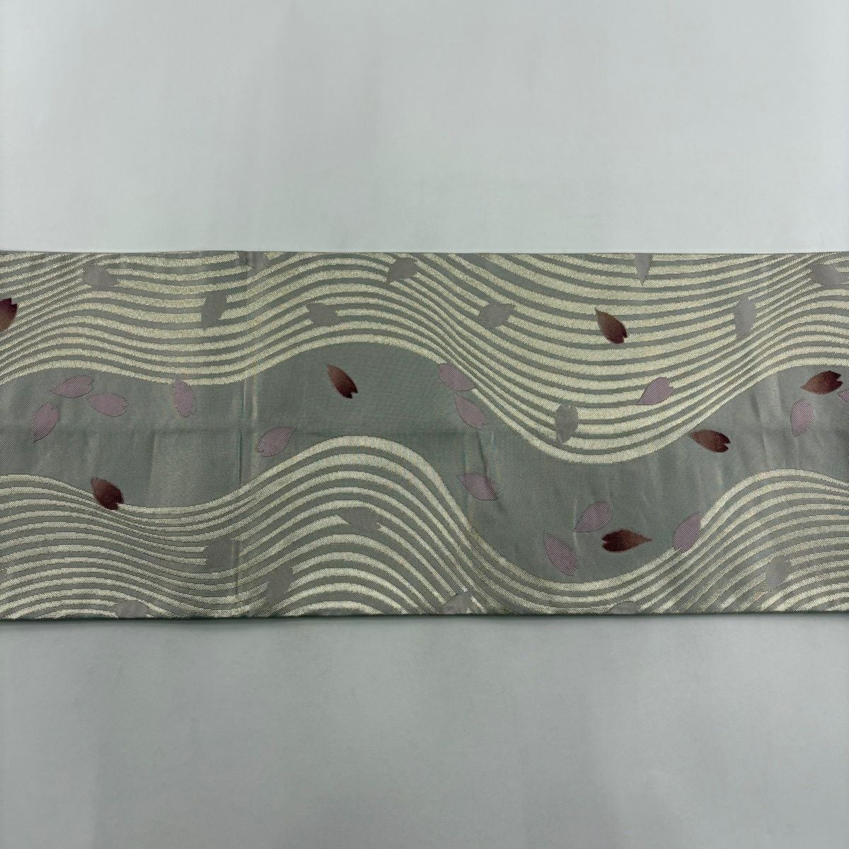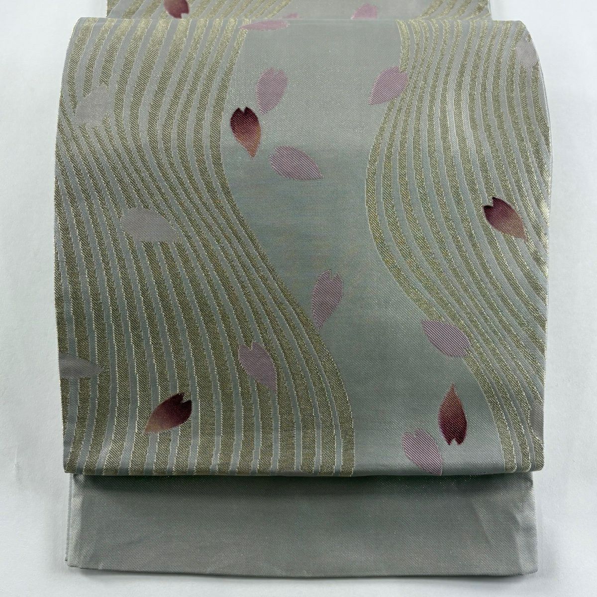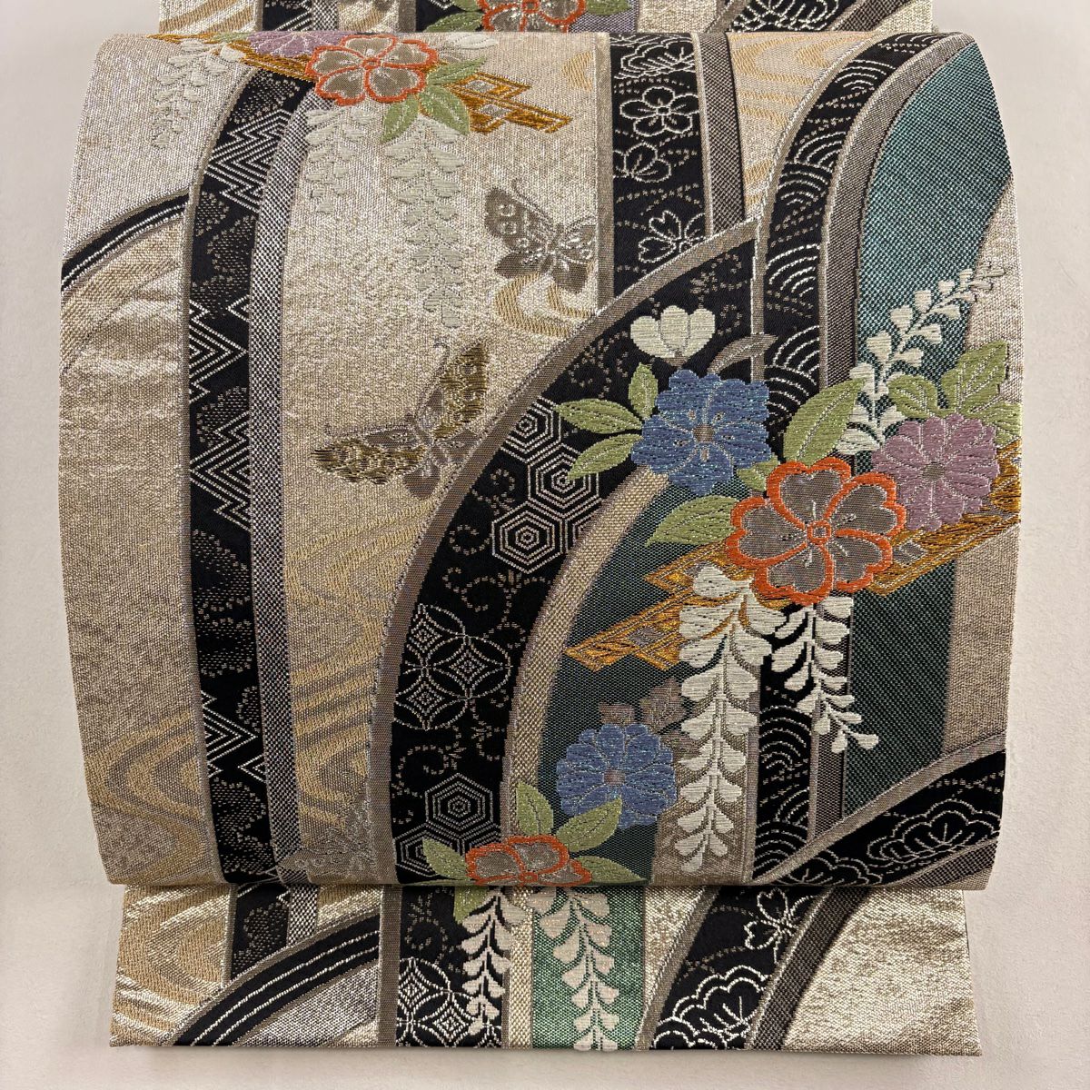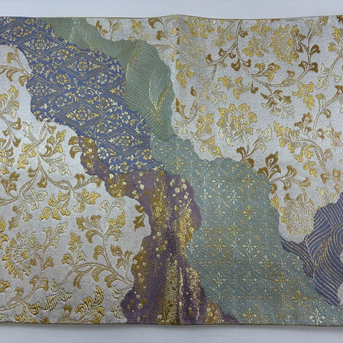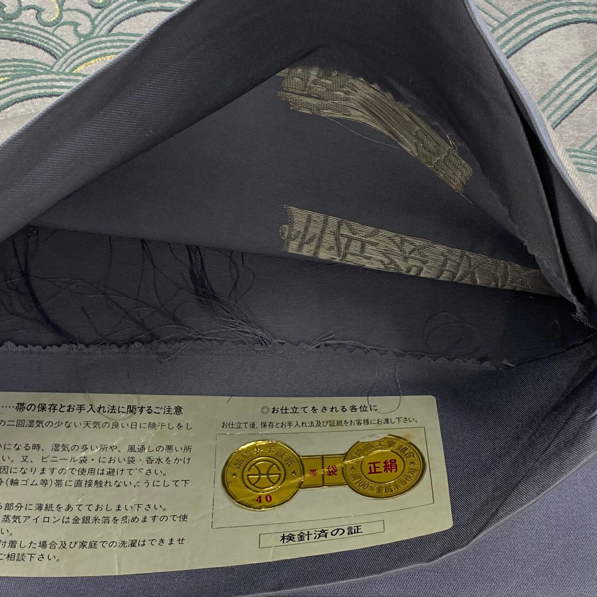 【在庫一掃】 【美品】 袋帯 秀品 証紙あり 州浜裂取波文 花唐草 波頭 金糸 箔 灰紫 お太鼓柄 正絹