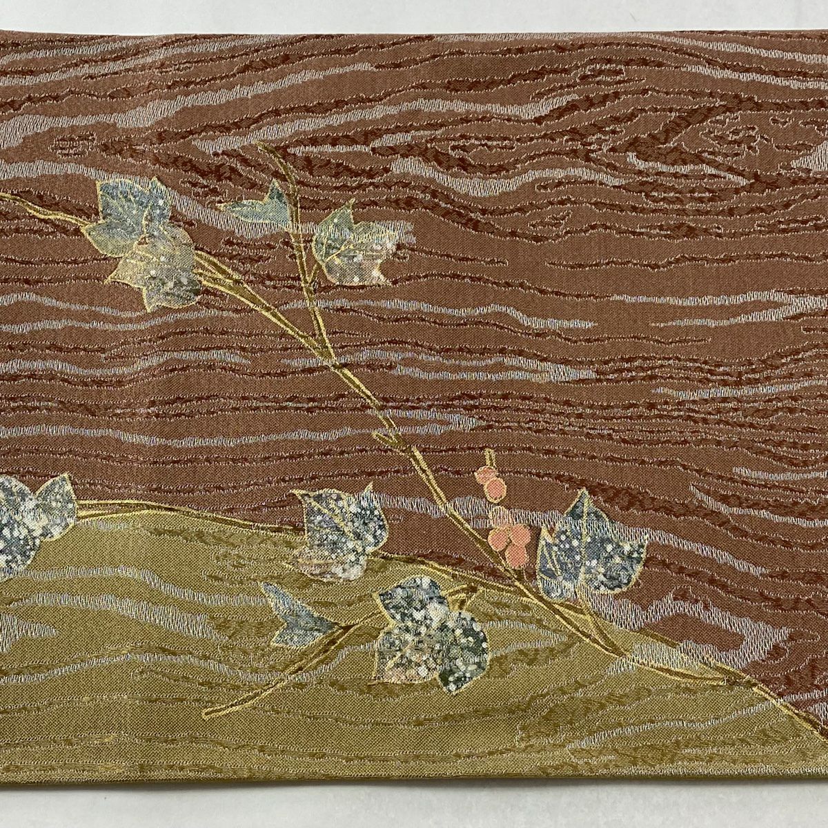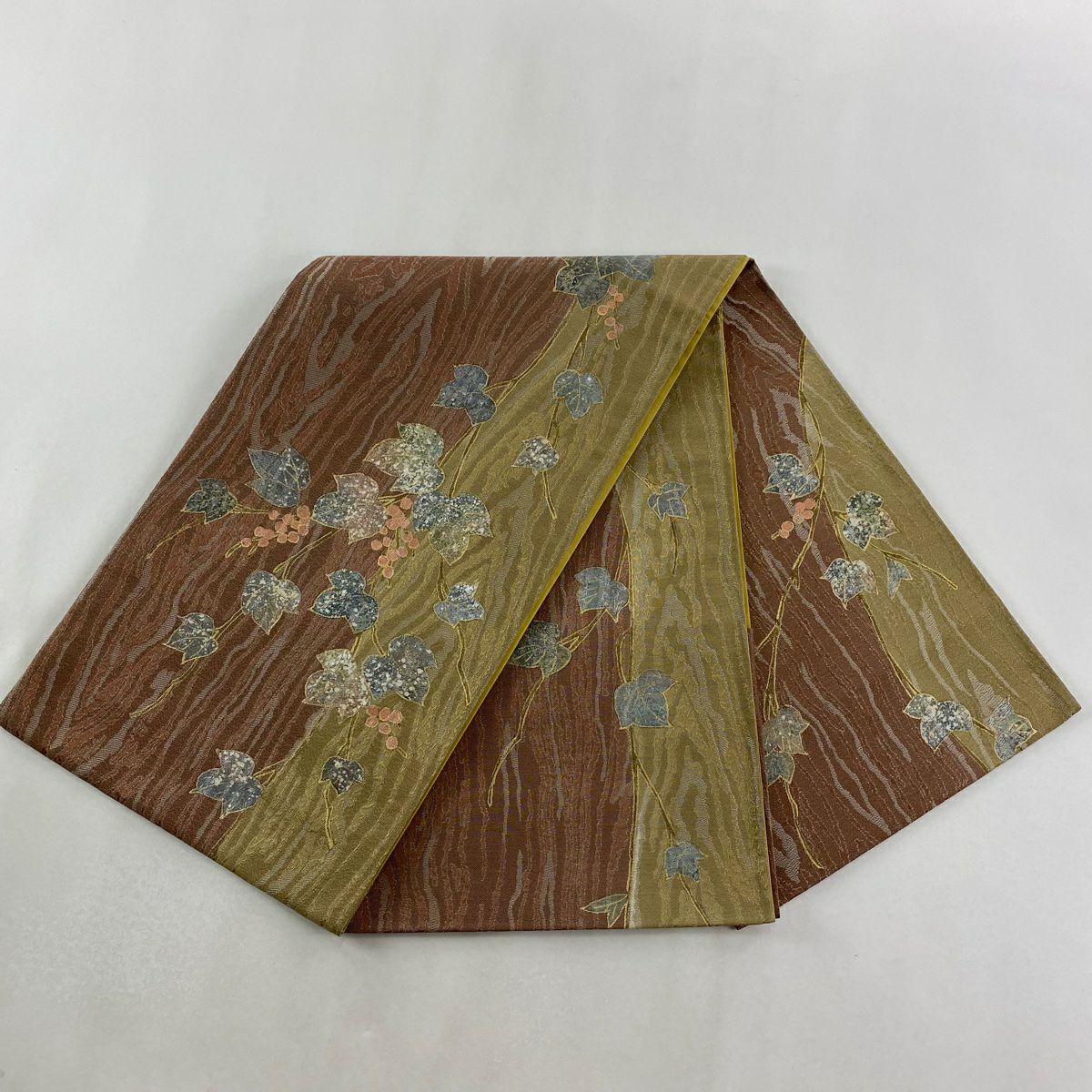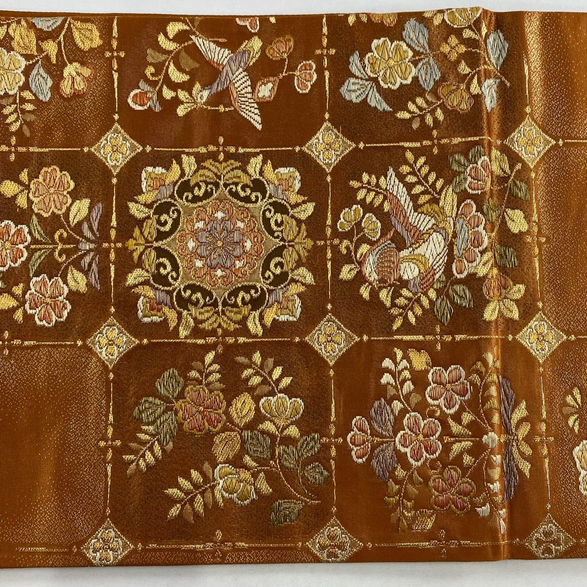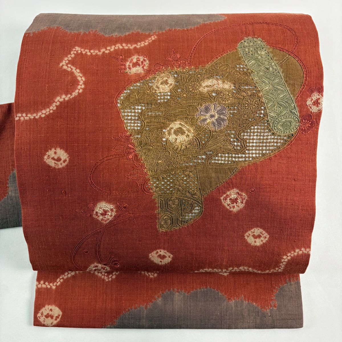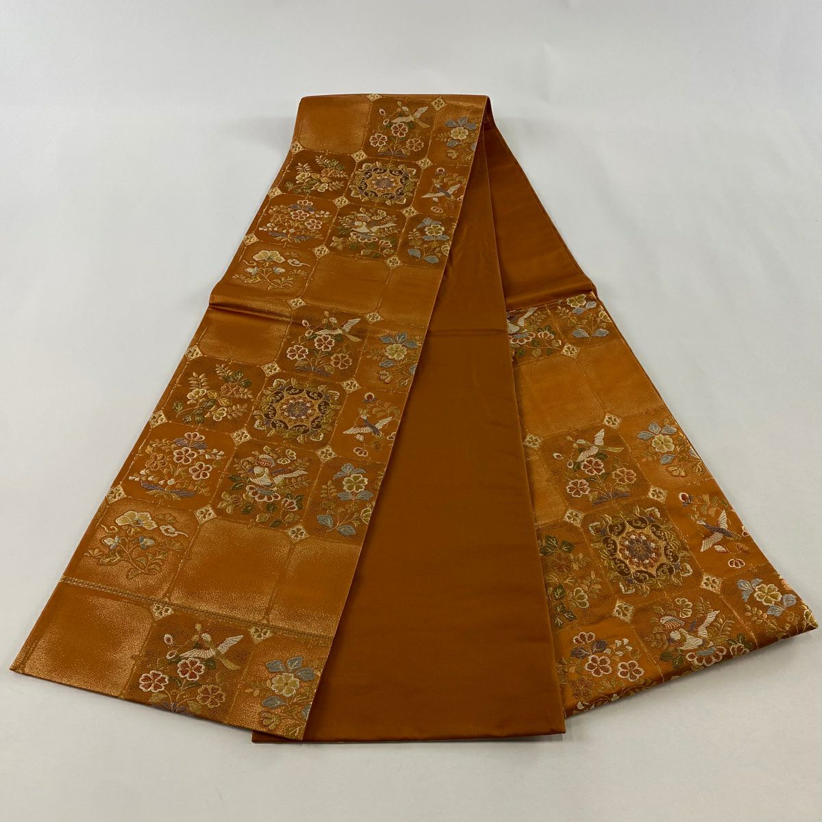 【最終値引き】 83%OFF 【美品】 名古屋帯 秀品 紬地 反物 花鳥 絞り 刺繍 赤茶 正絹 K70
