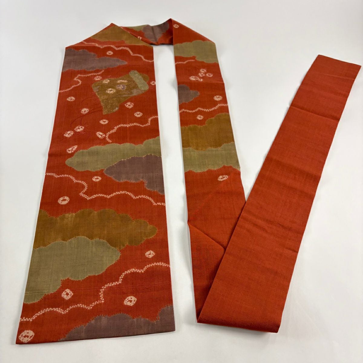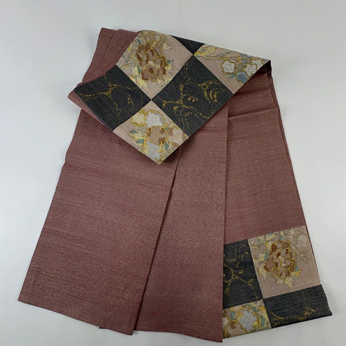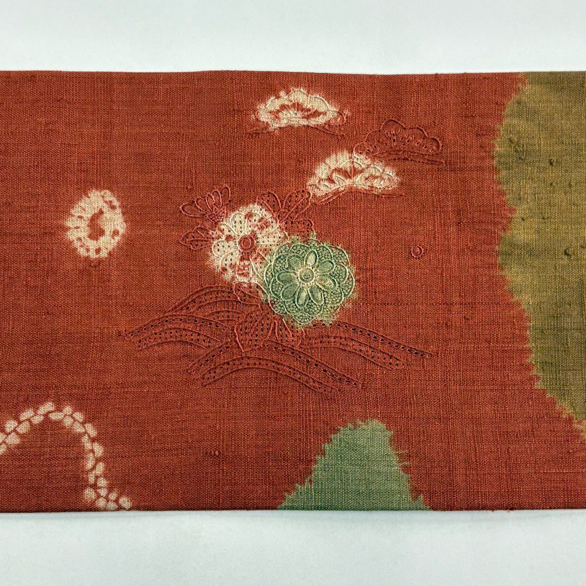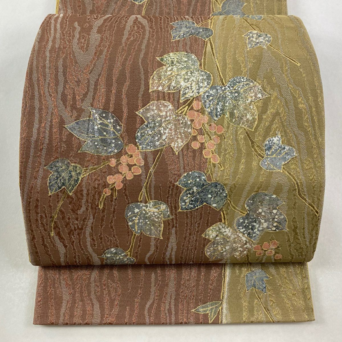 【最終値引き】 83%OFF 【美品】 名古屋帯 秀品 紬地 反物 花鳥 絞り 刺繍 赤茶 正絹 K70