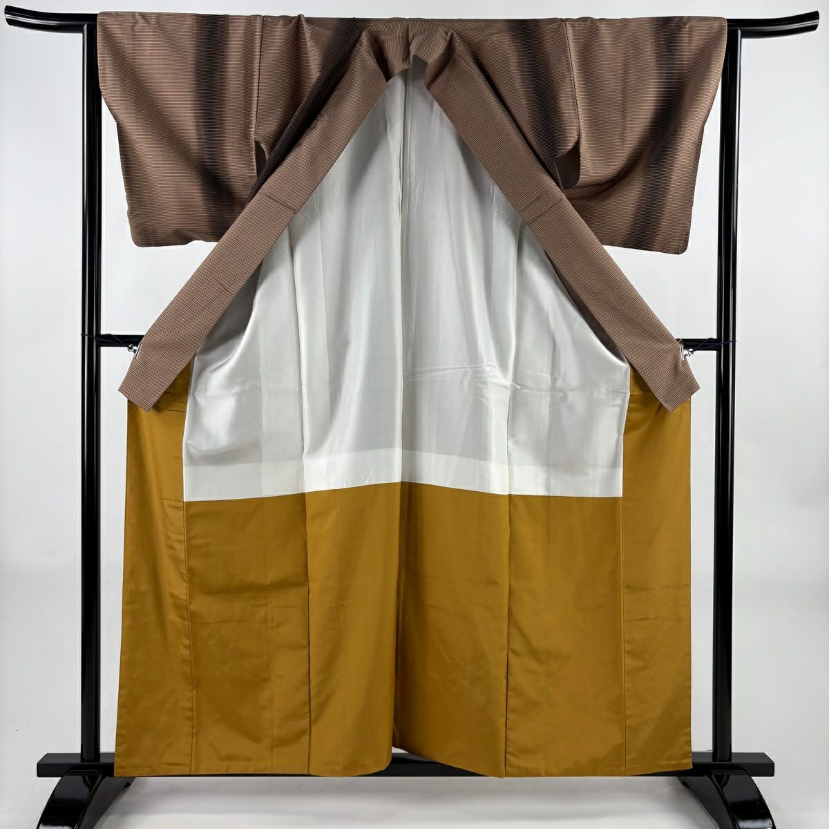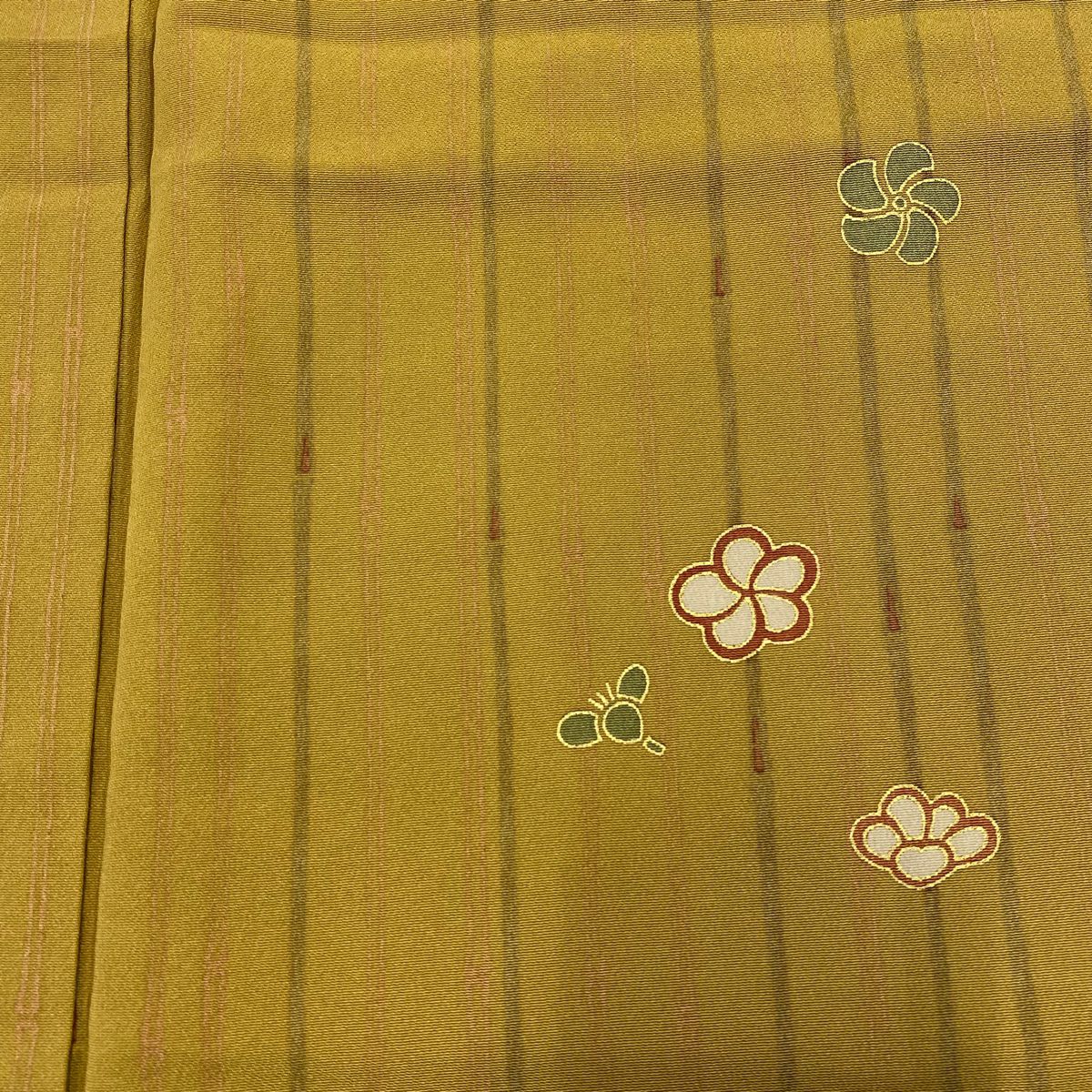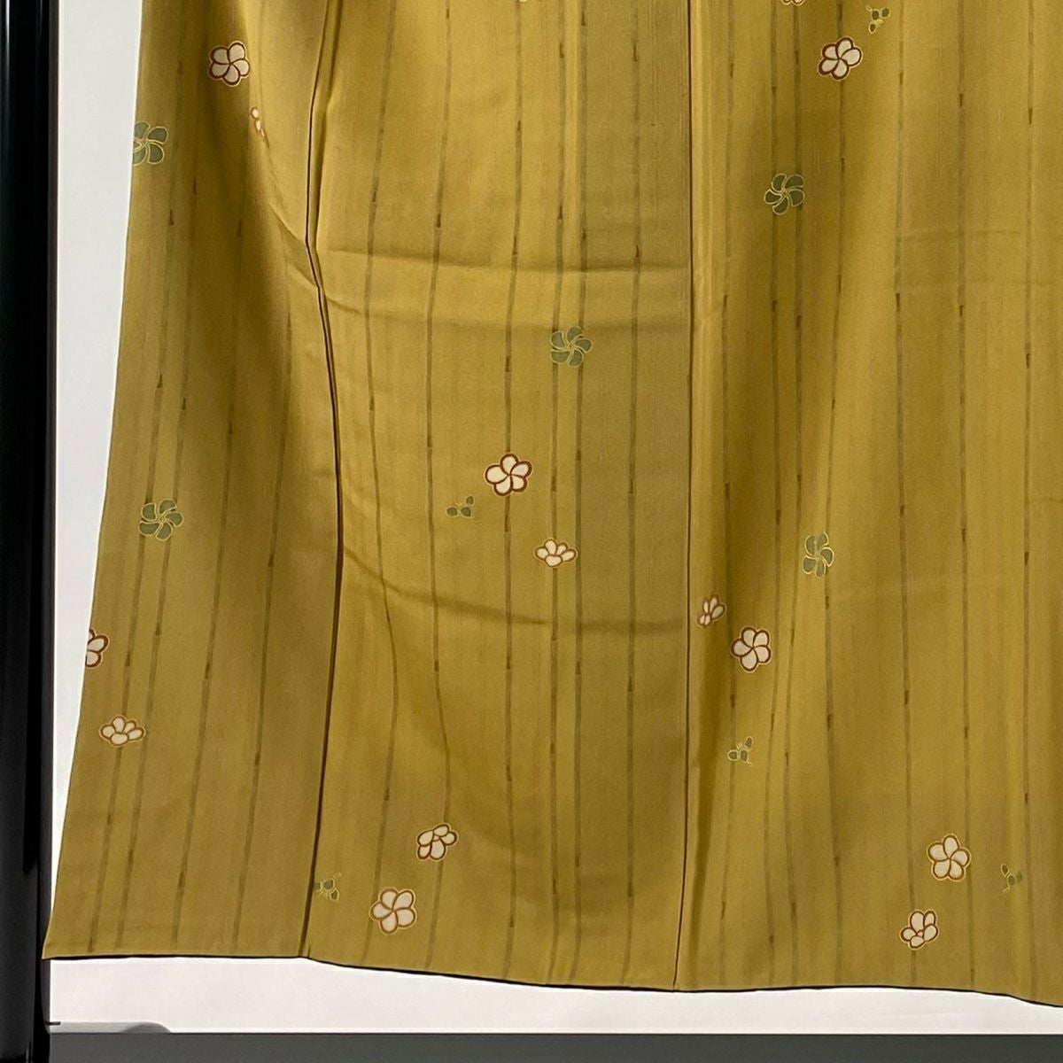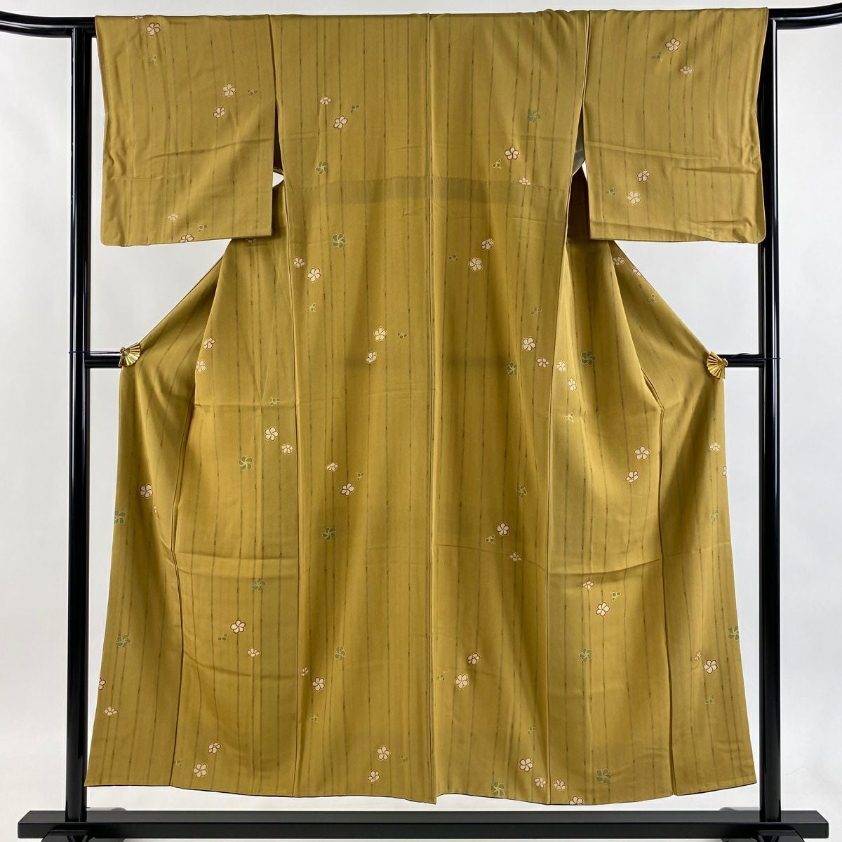【在庫一掃】 【美品】 小紋 身丈151.5cm 裄丈64cm M 袷 梅 縦縞 金彩 黄土色 正絹 秀品