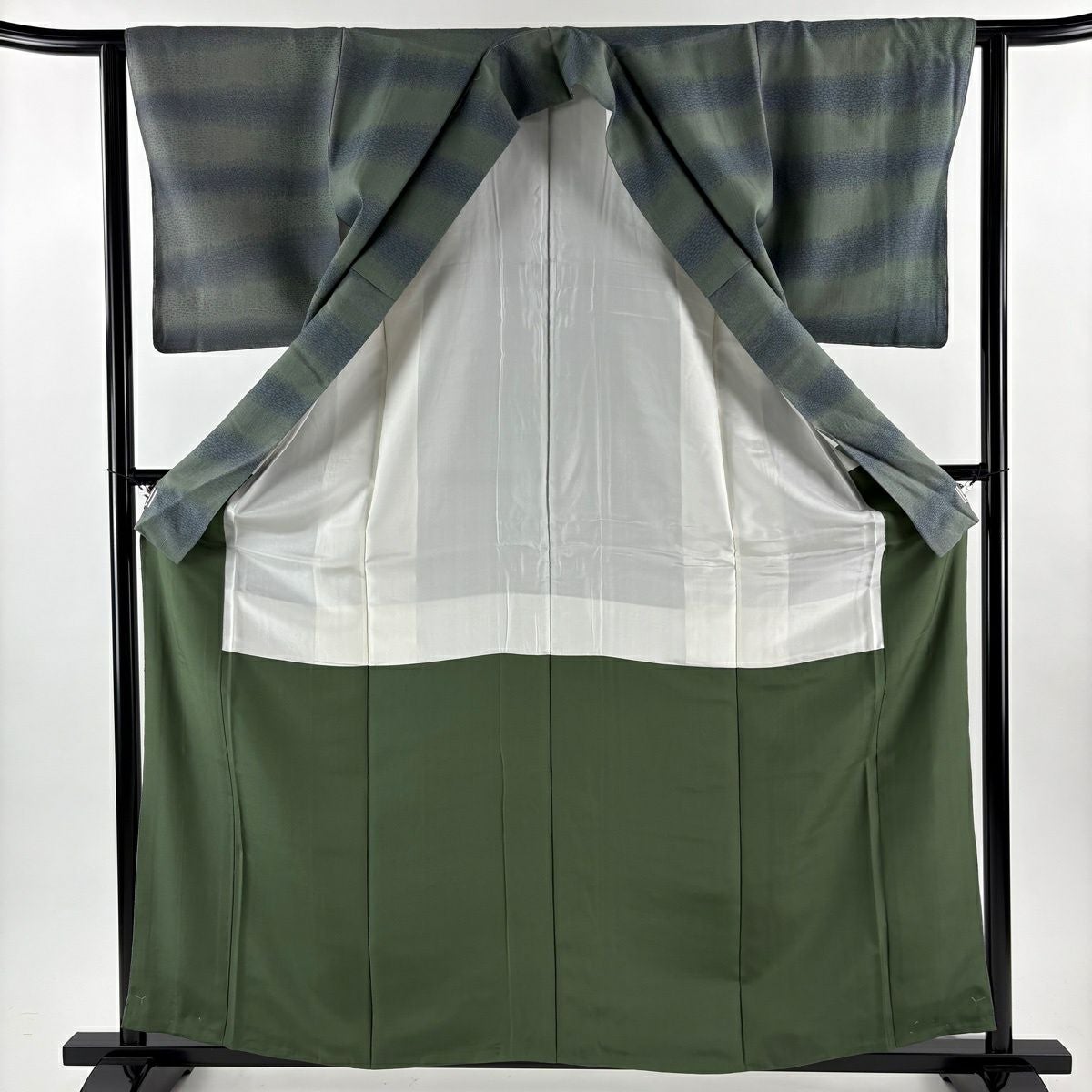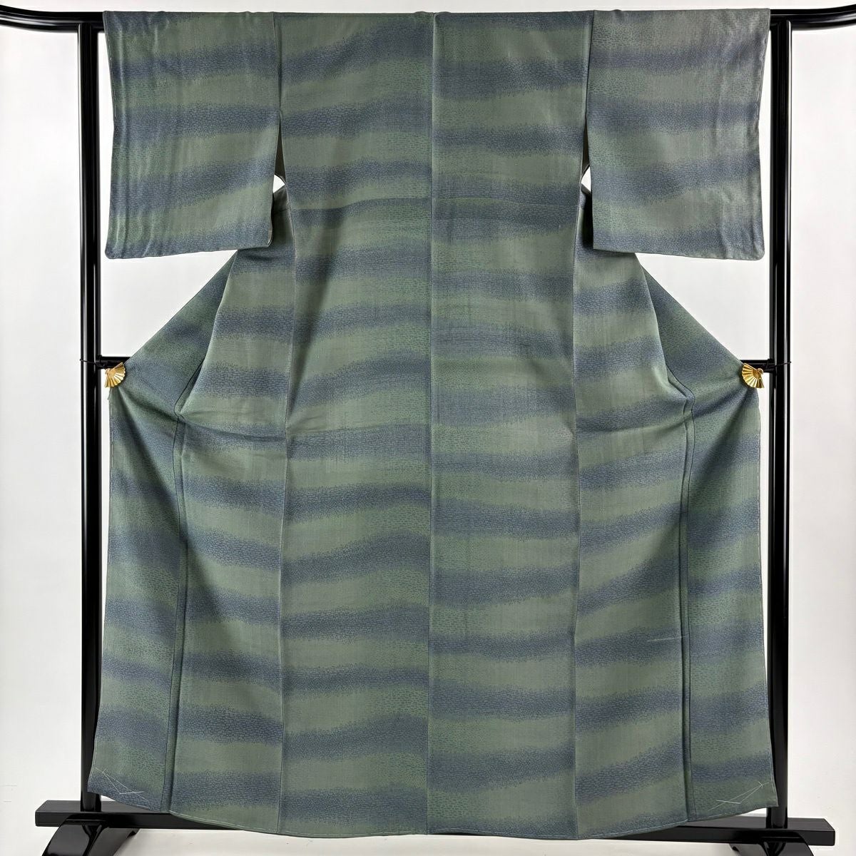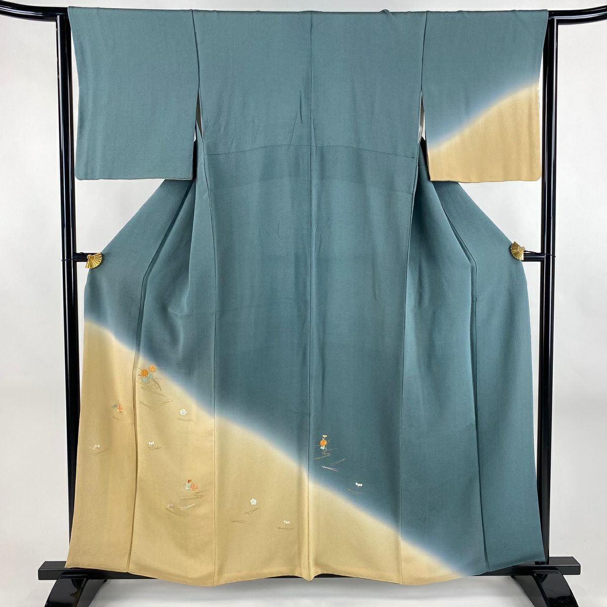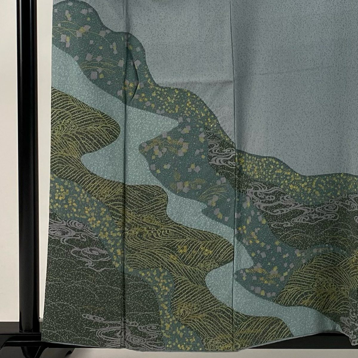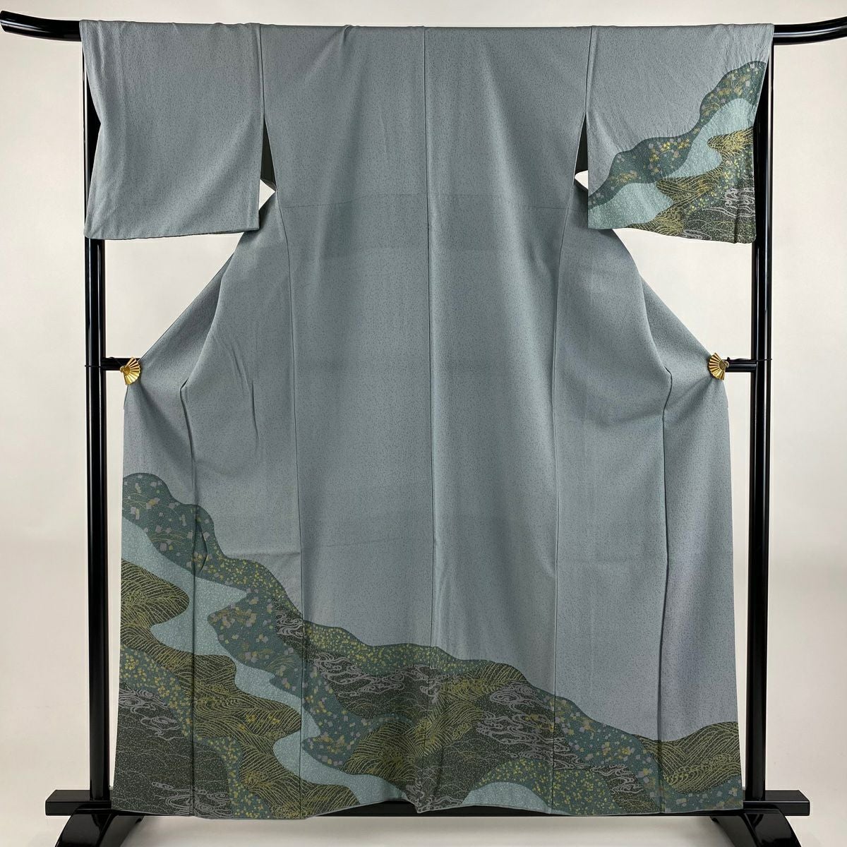 【在庫一掃】 付下げ 身丈160cm 裄丈67cm M 袷 流水 芝 金彩 染め分け 青灰色 正絹 秀品