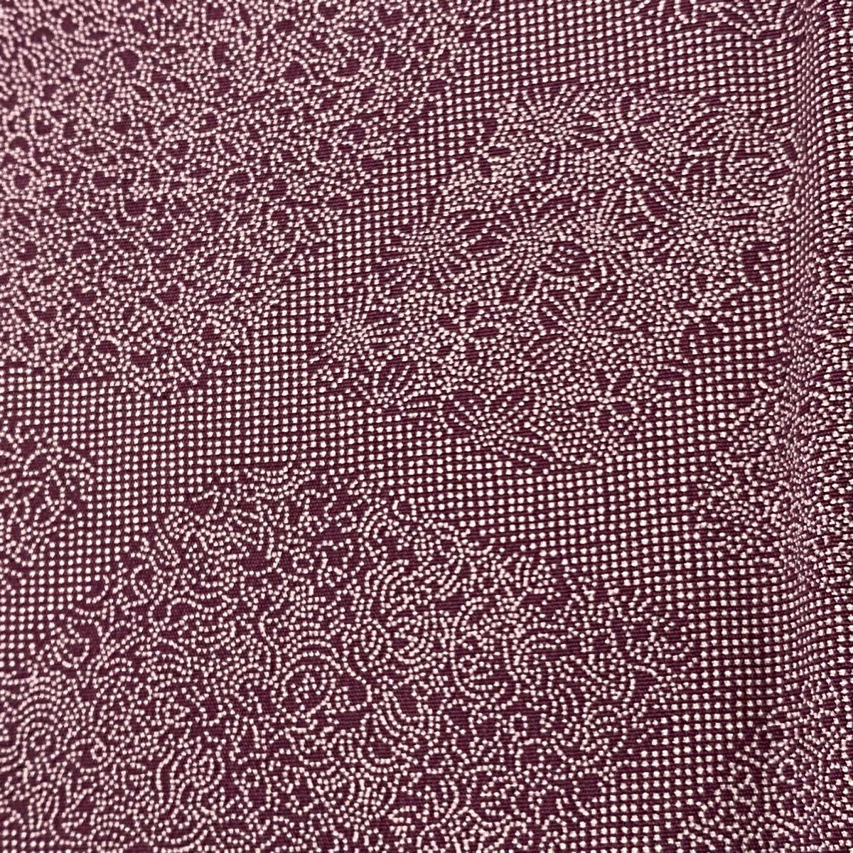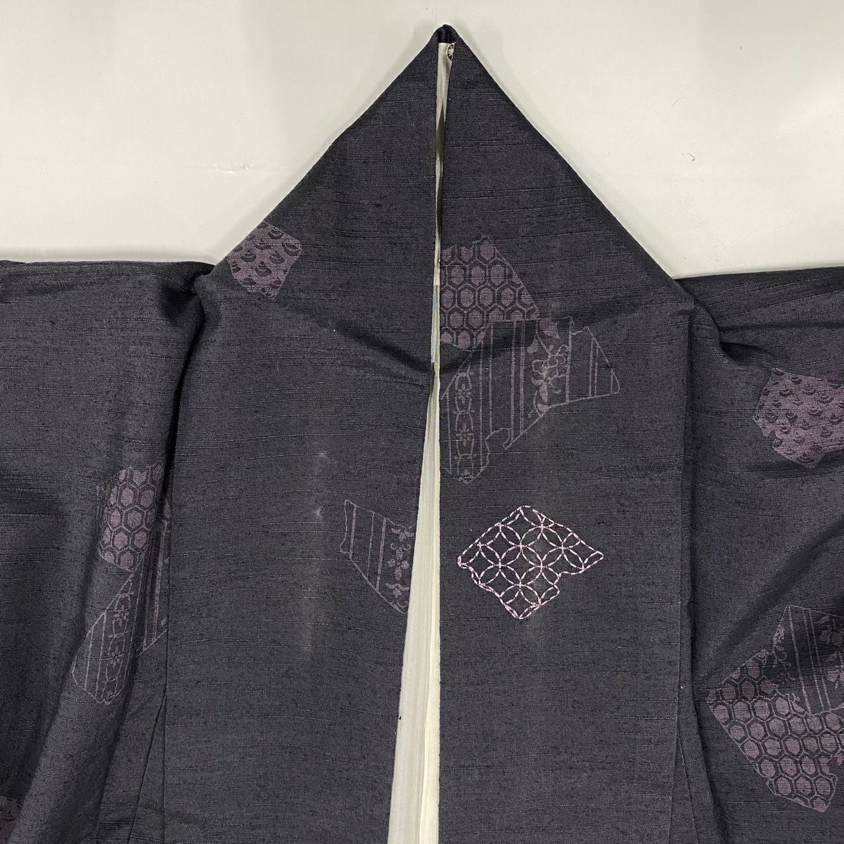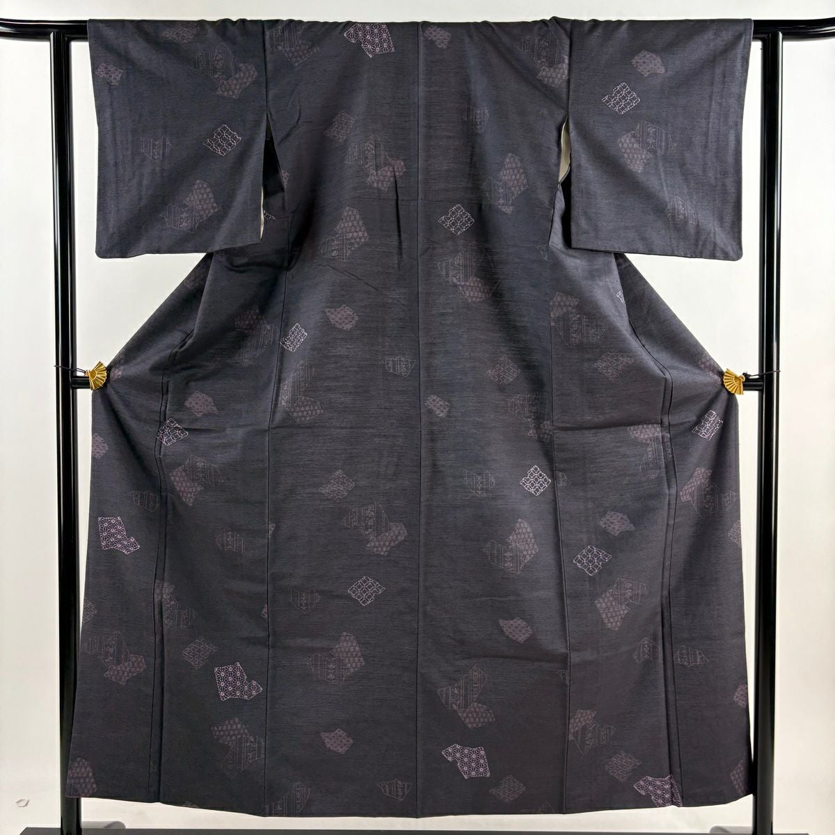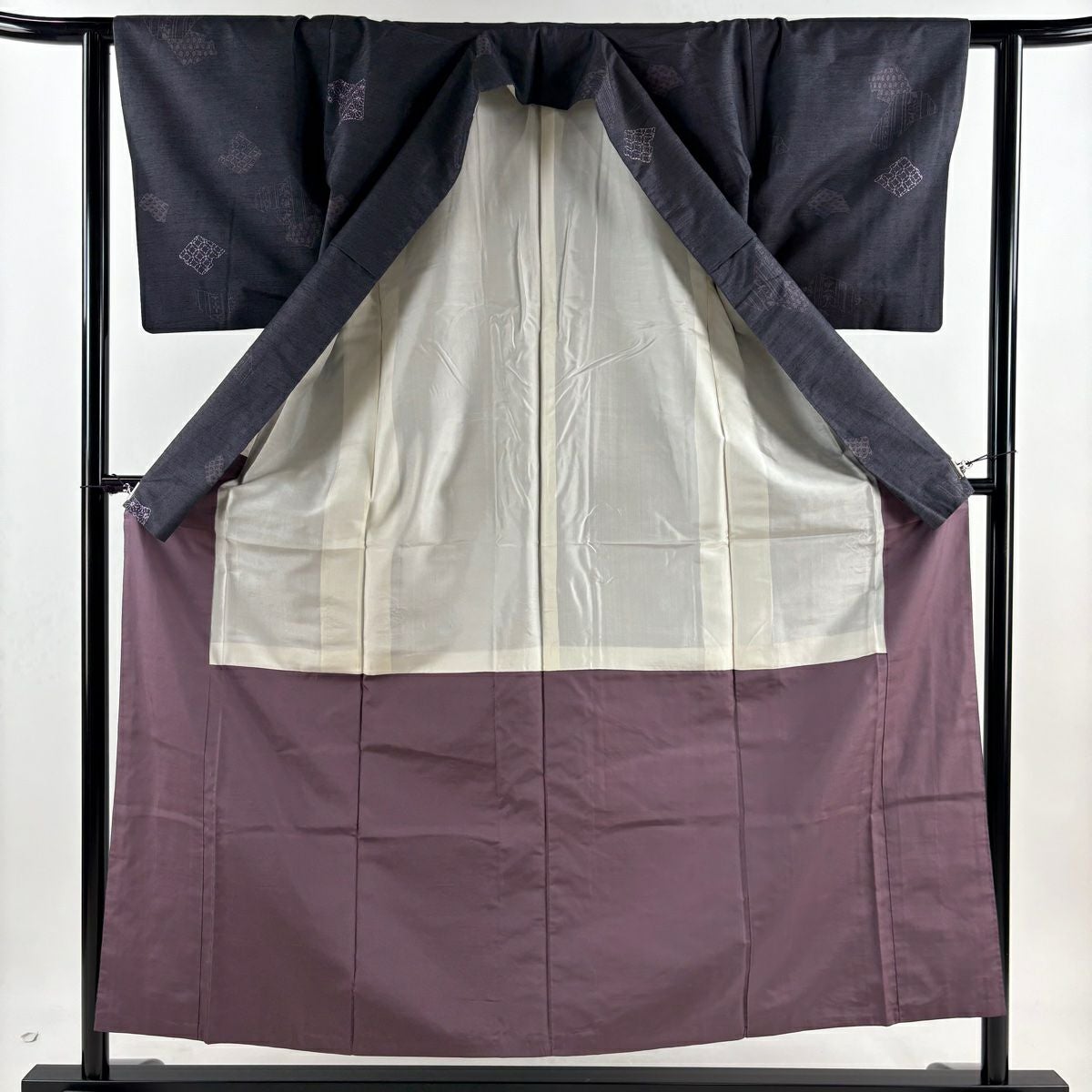 【在庫一掃】 小紋 身丈154.5cm 裄丈60.5cm S 袷 紬地 麻の葉 草花 刺繍 濃紫 正絹 秀品