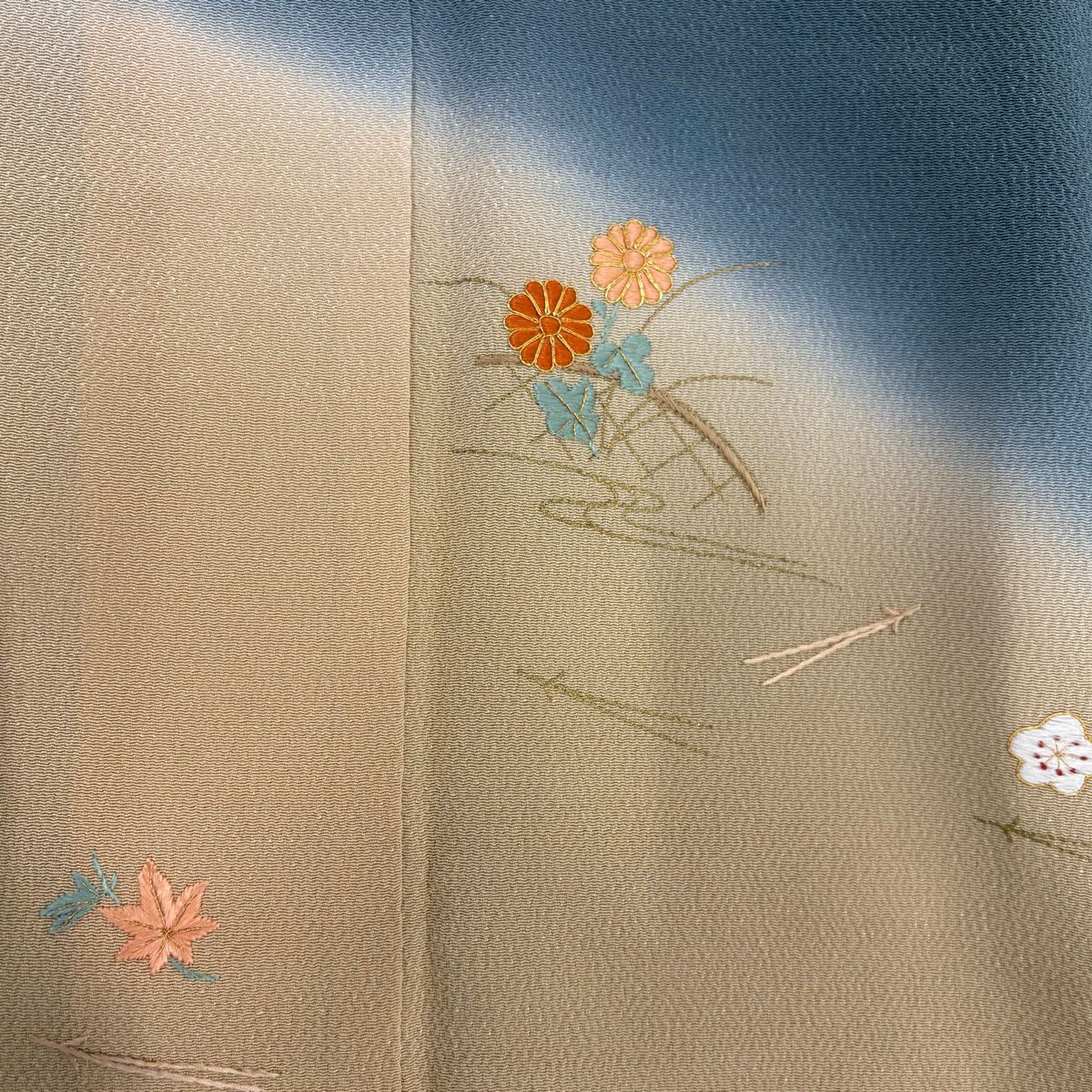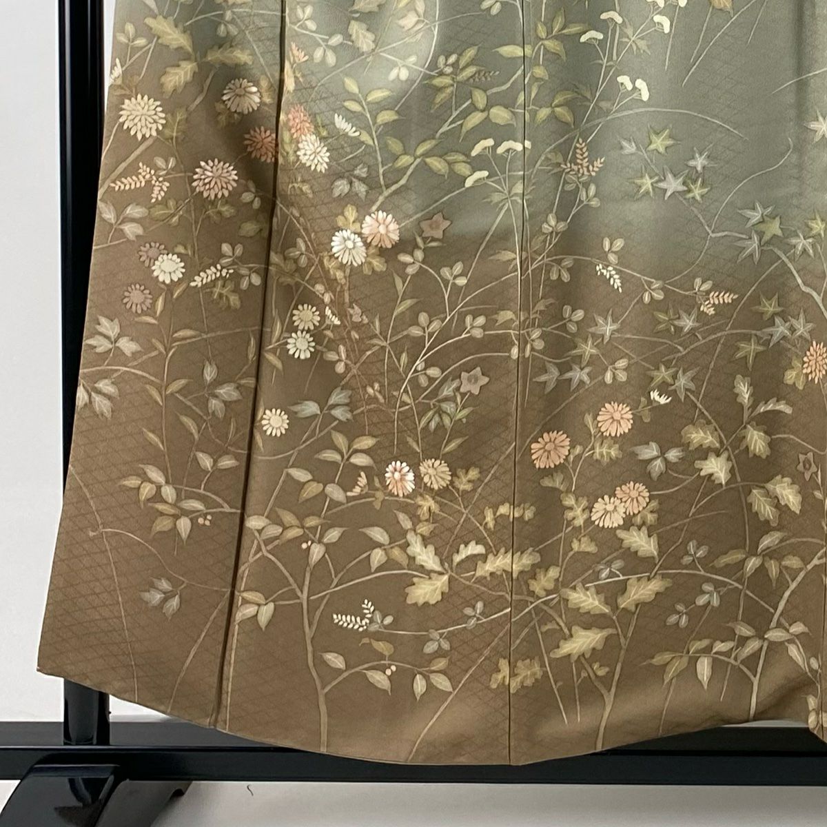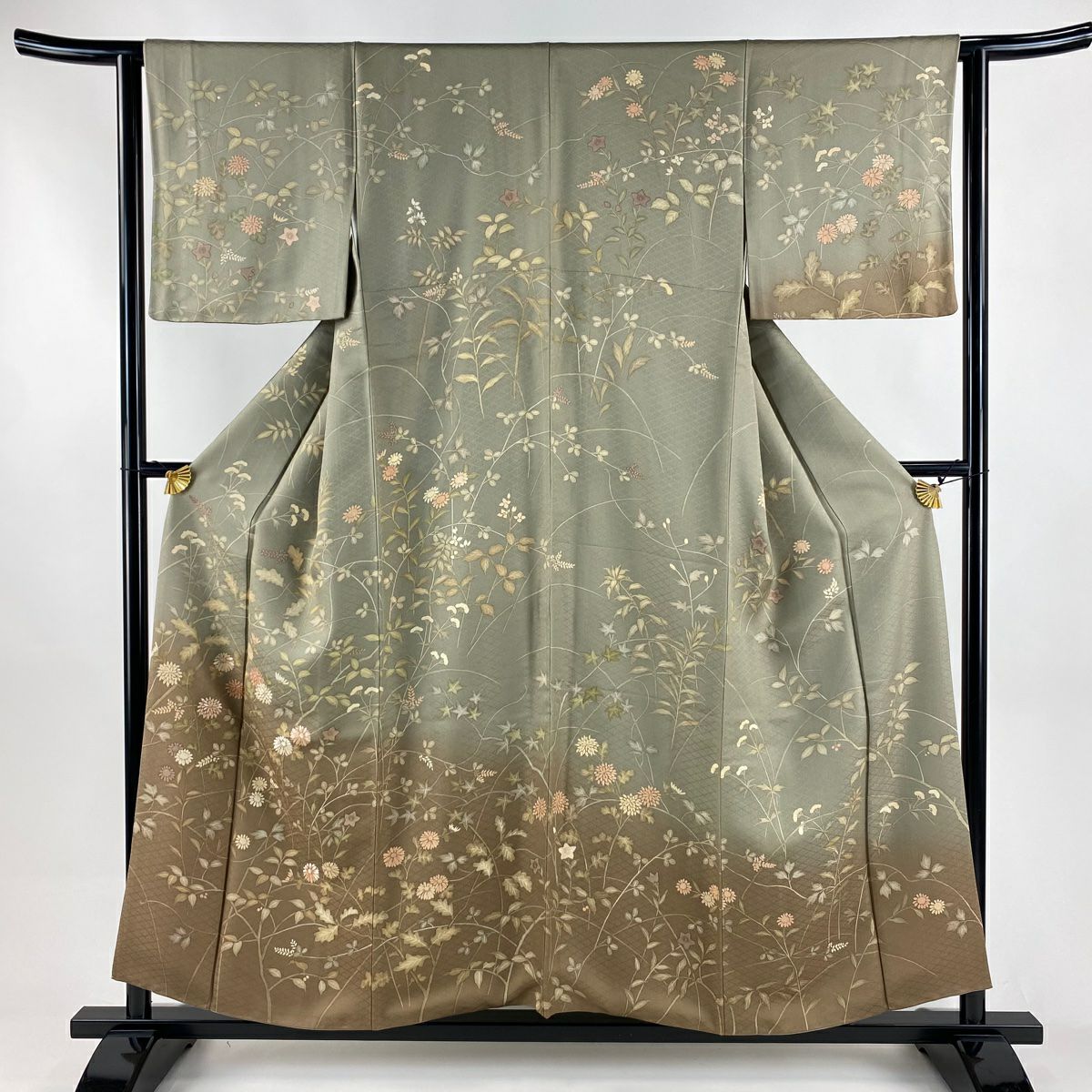 【在庫一掃】 訪問着 身丈156cm 裄丈62cm S 袷 秋草 地紋 刺繍 染め分け 灰茶 正絹 秀品