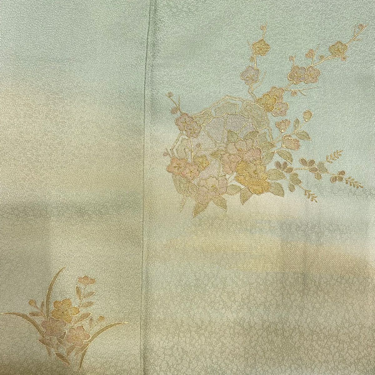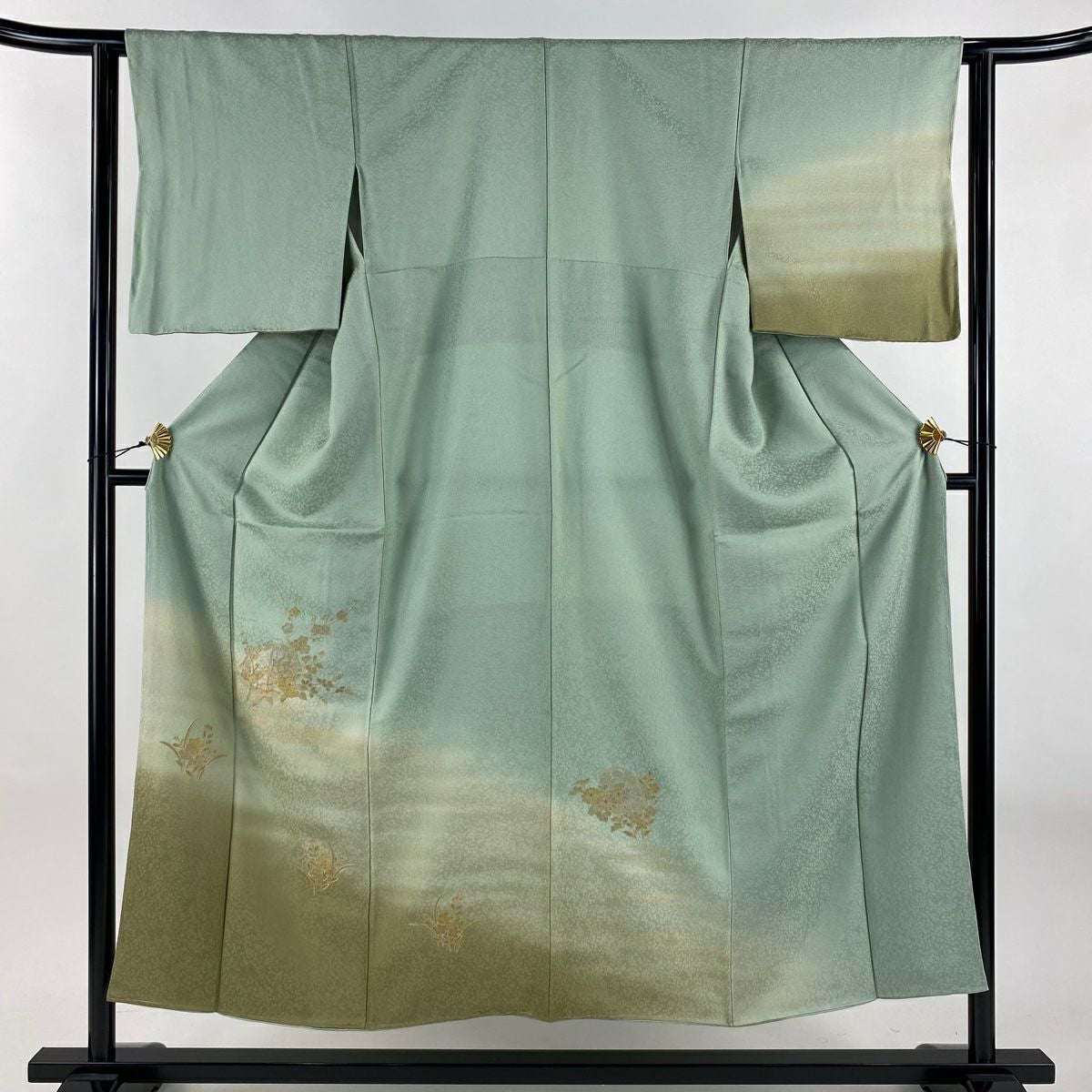 【在庫一掃】 付下げ 身丈152cm 裄丈61.5cm S 袷 枝梅 霞 金銀糸 刺繍 薄緑 正絹 秀品