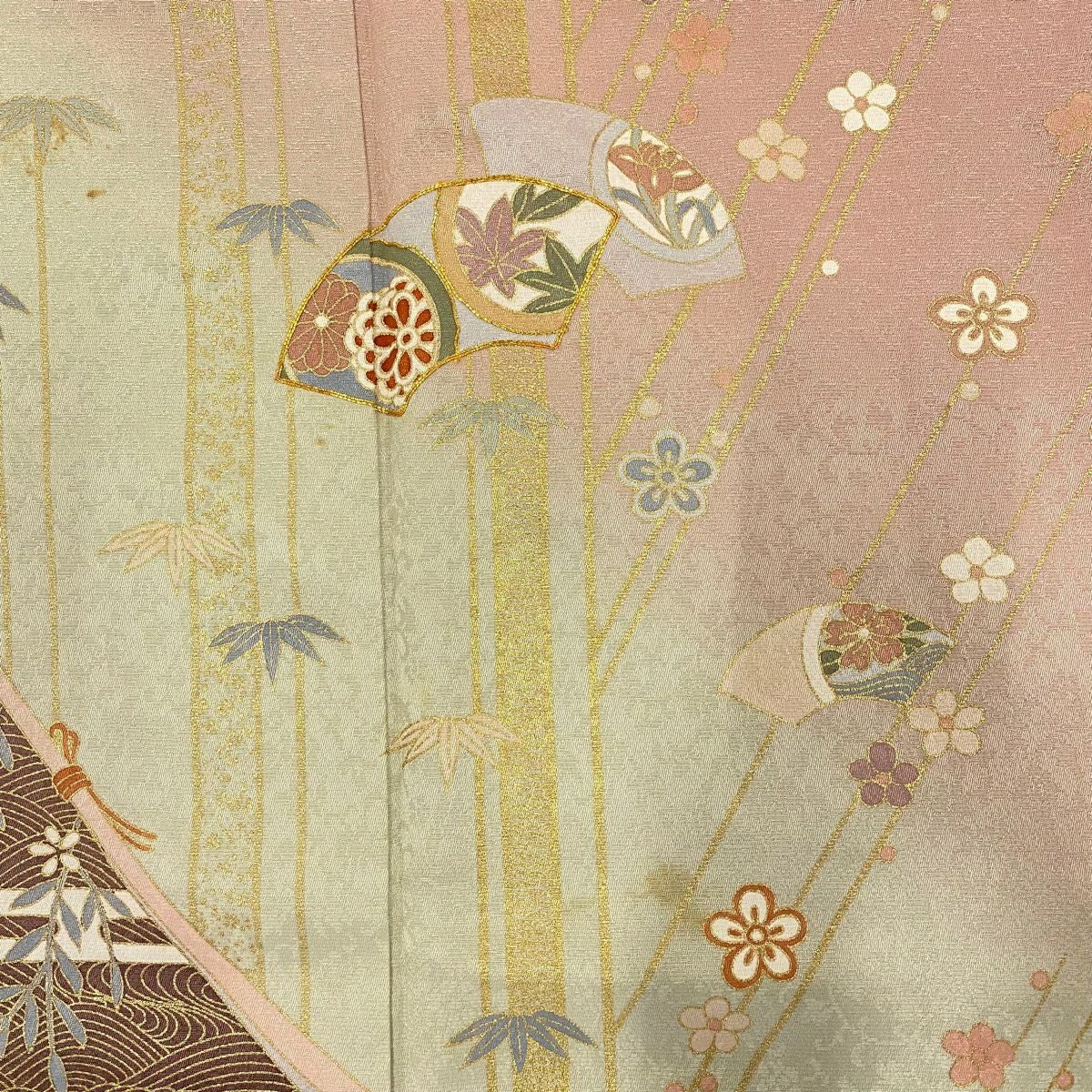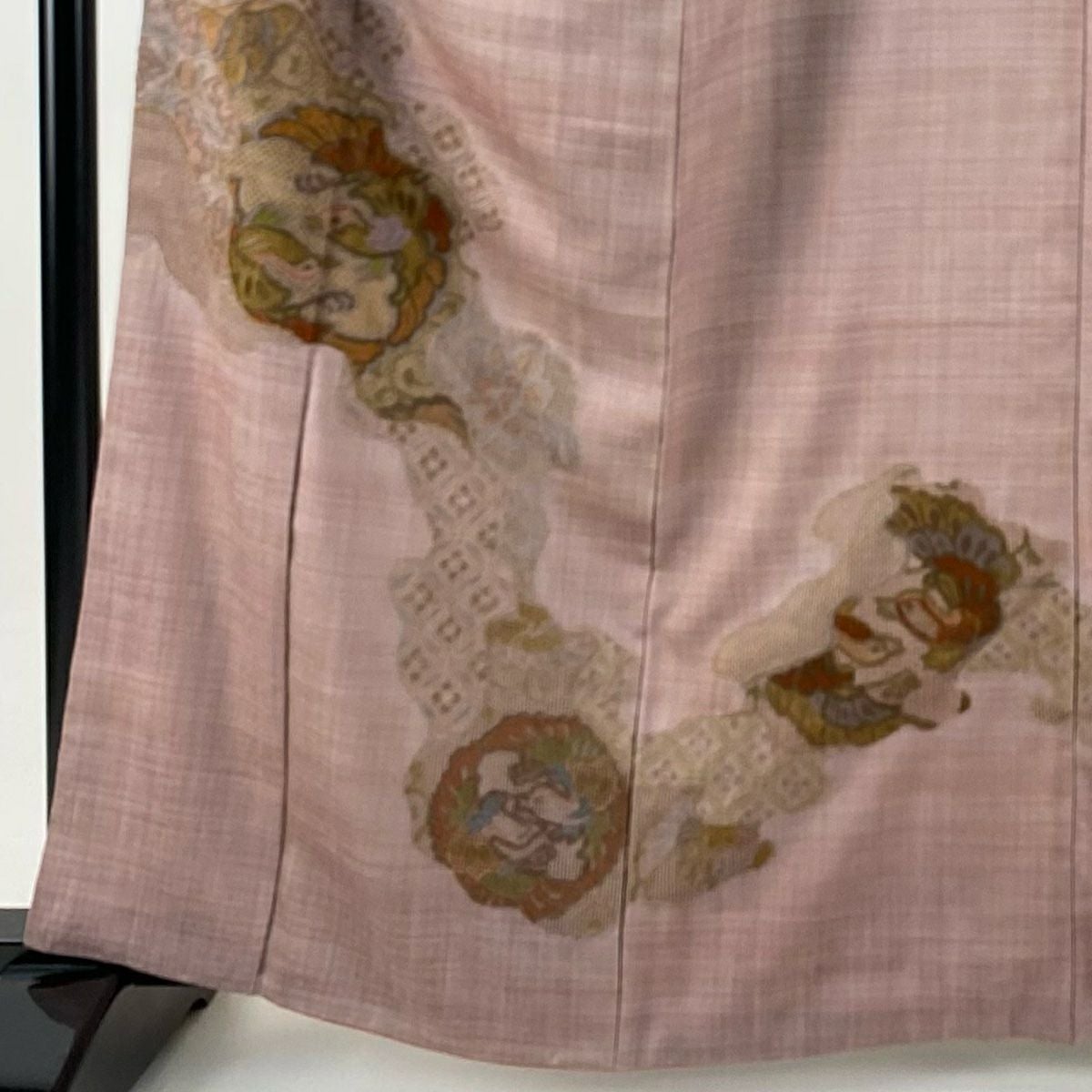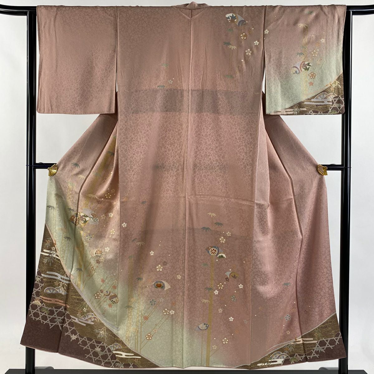 【在庫一掃】 訪問着 身丈151cm 裄丈64cm M 袷 扇面 松竹梅 金糸 金彩 ピンク 正絹 秀品