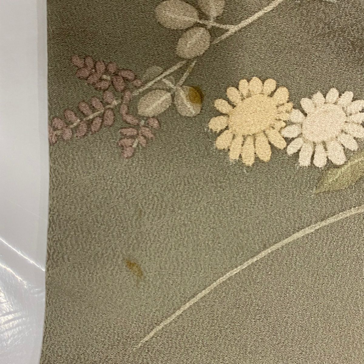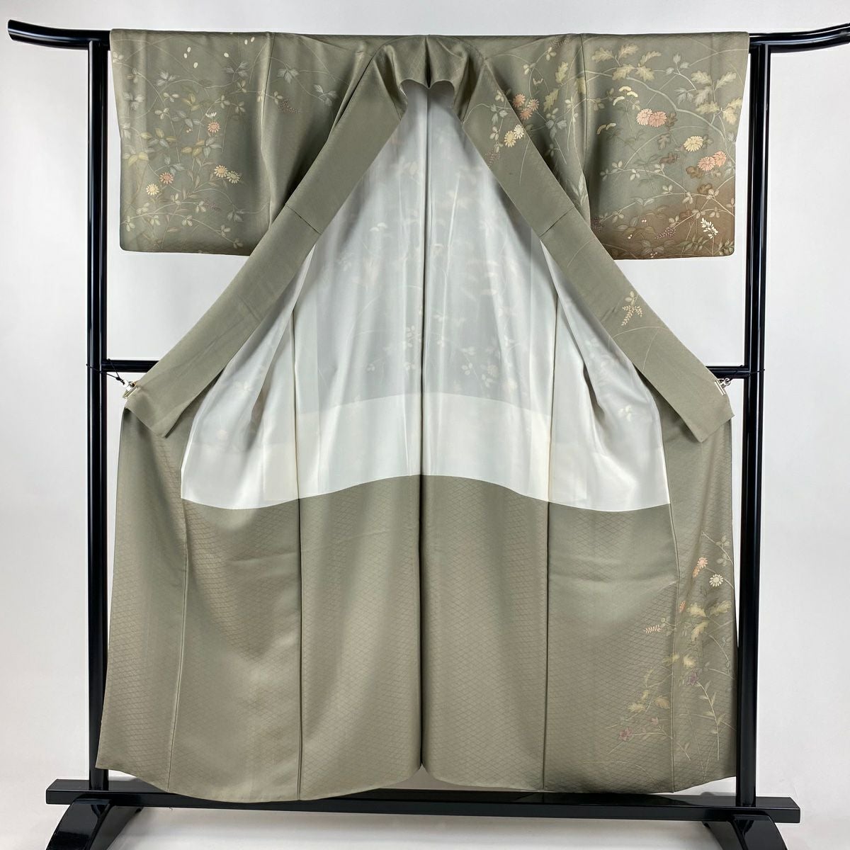【在庫一掃】 付下げ 身丈156cm 裄丈63.5cm S 袷 草花 松葉 金糸 刺繍 灰緑 正絹 秀品