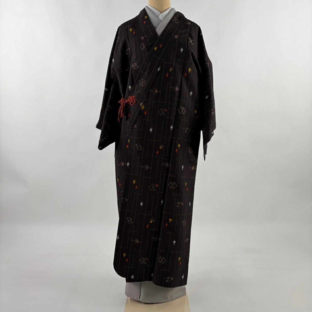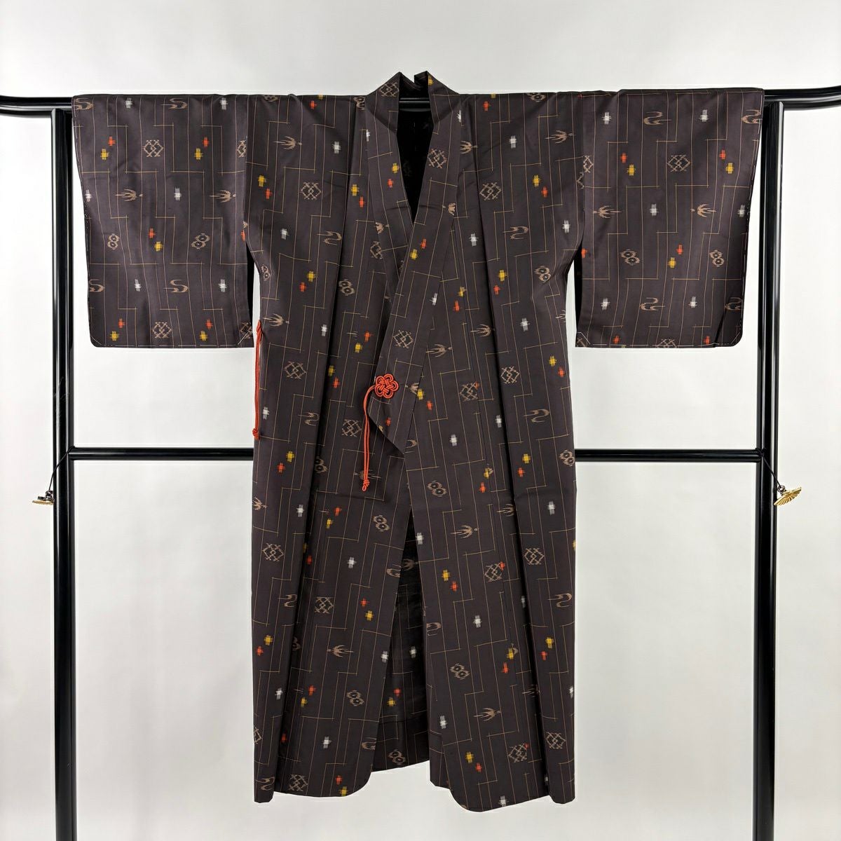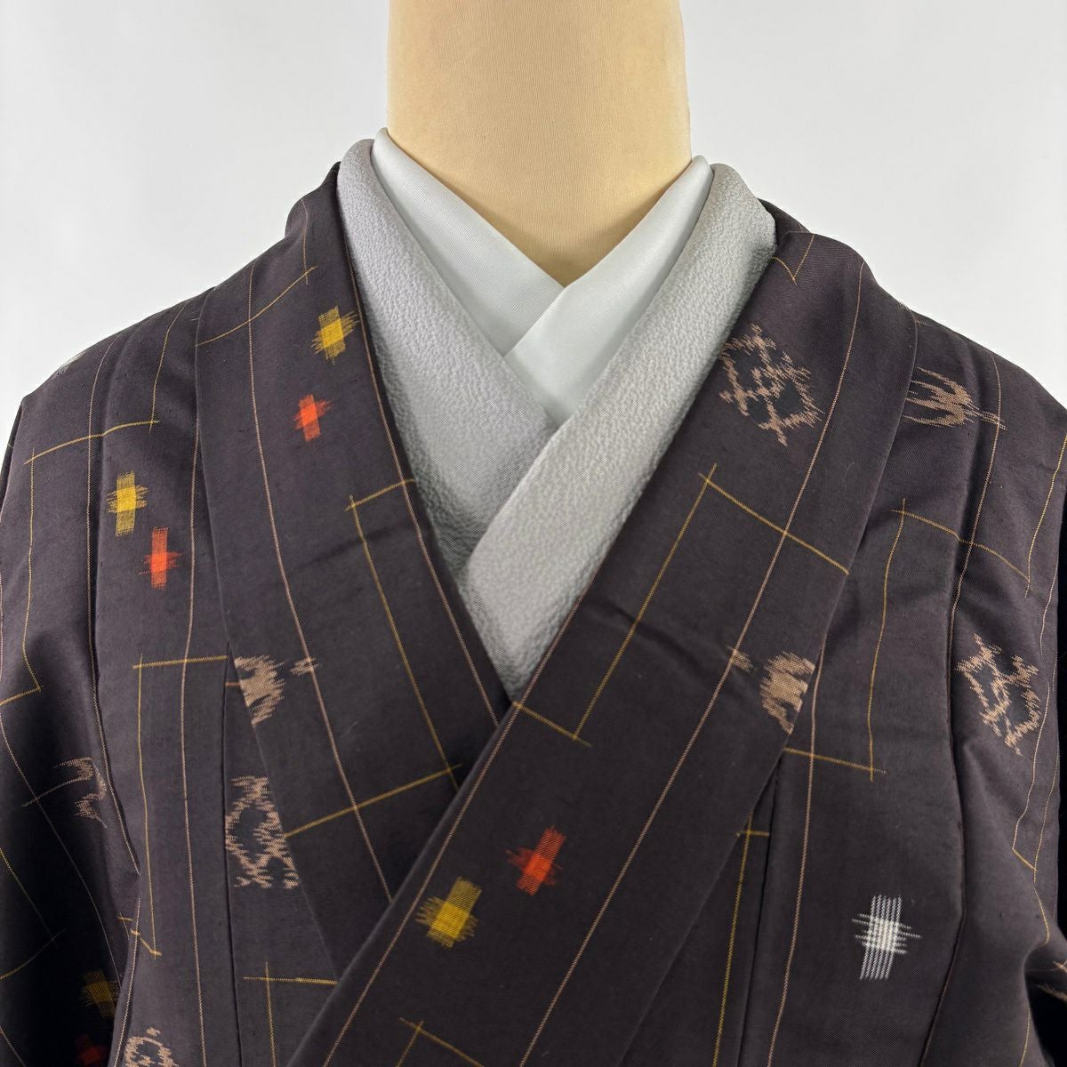 【美品】 道中着 身丈130cm 裄丈64cm M 和装コート 着物衿 紬地 燕 十字絣 茶紫 正絹 秀品