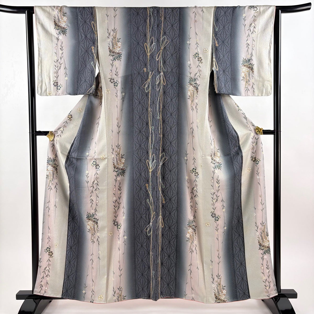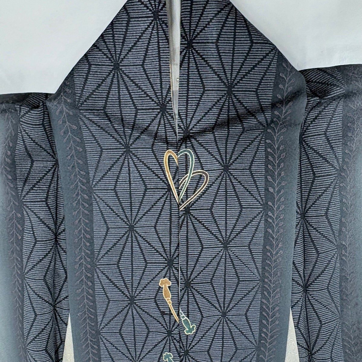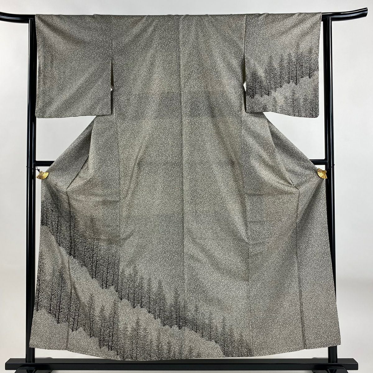 【美品】 小紋 身丈160.5cm 裄丈63cm S 袷 市女笠 麻の葉 金銀彩 ぼかし 灰色 正絹 秀品