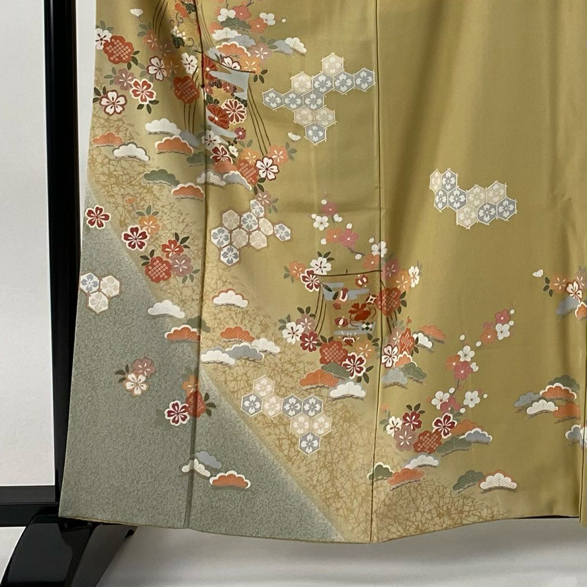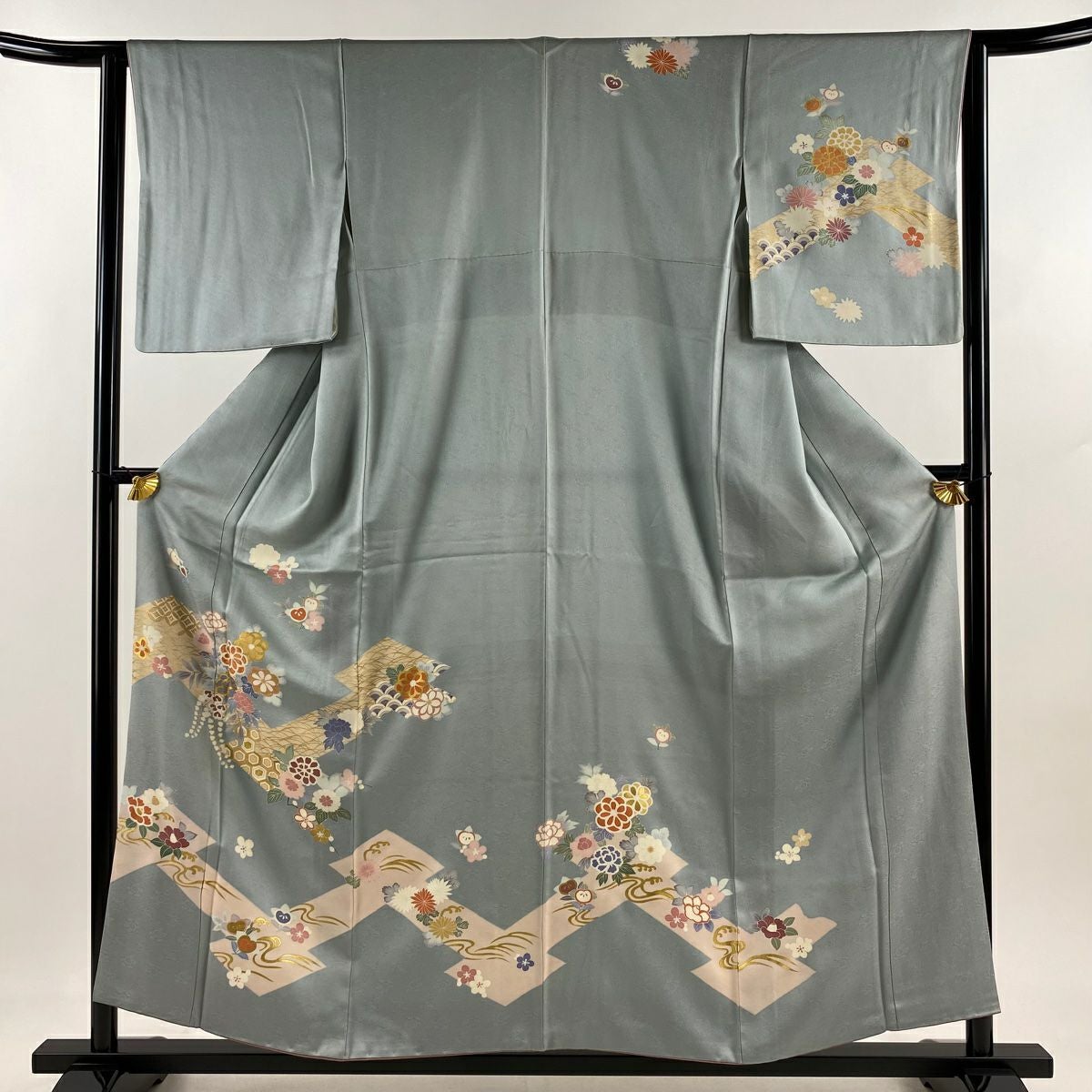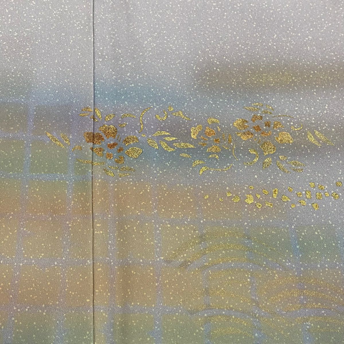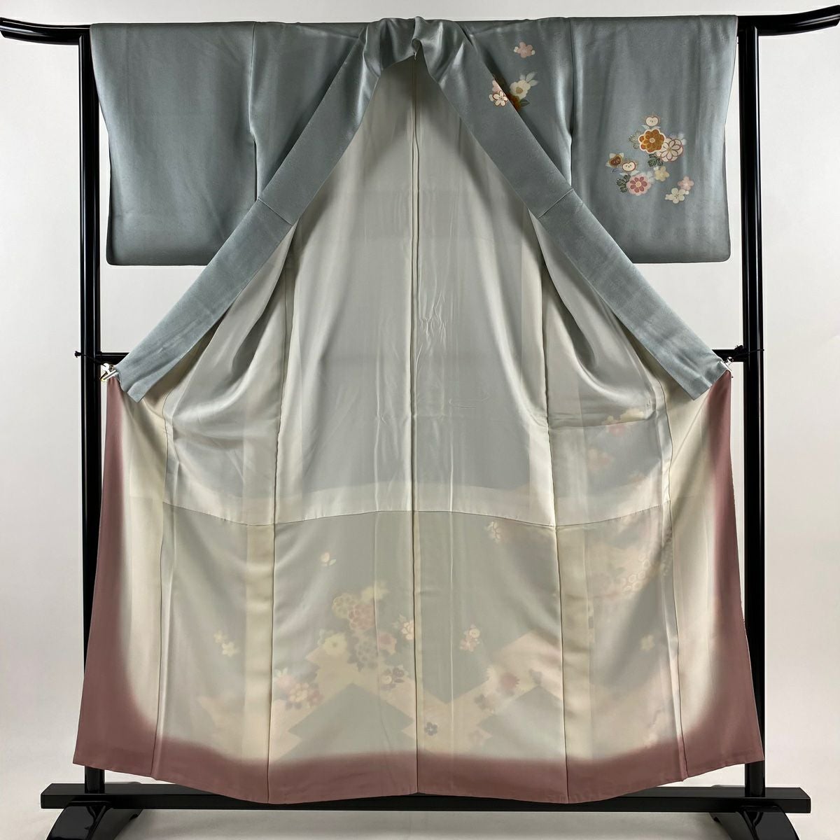 色留袖 身丈154.5cm 裄丈66cm M 袷 草花 幾何学模様 金彩 ぼかし 灰緑 正絹 秀品 一つ紋