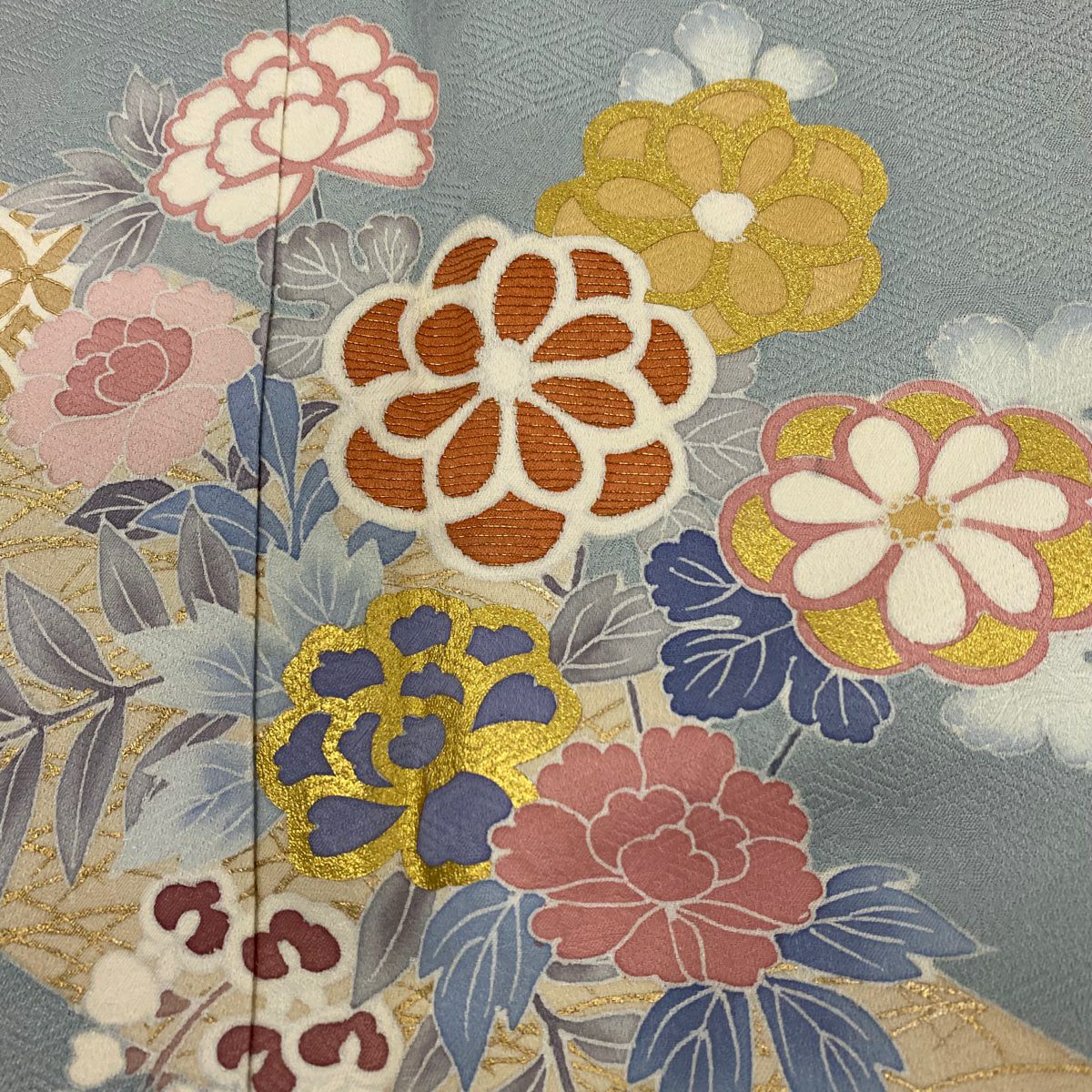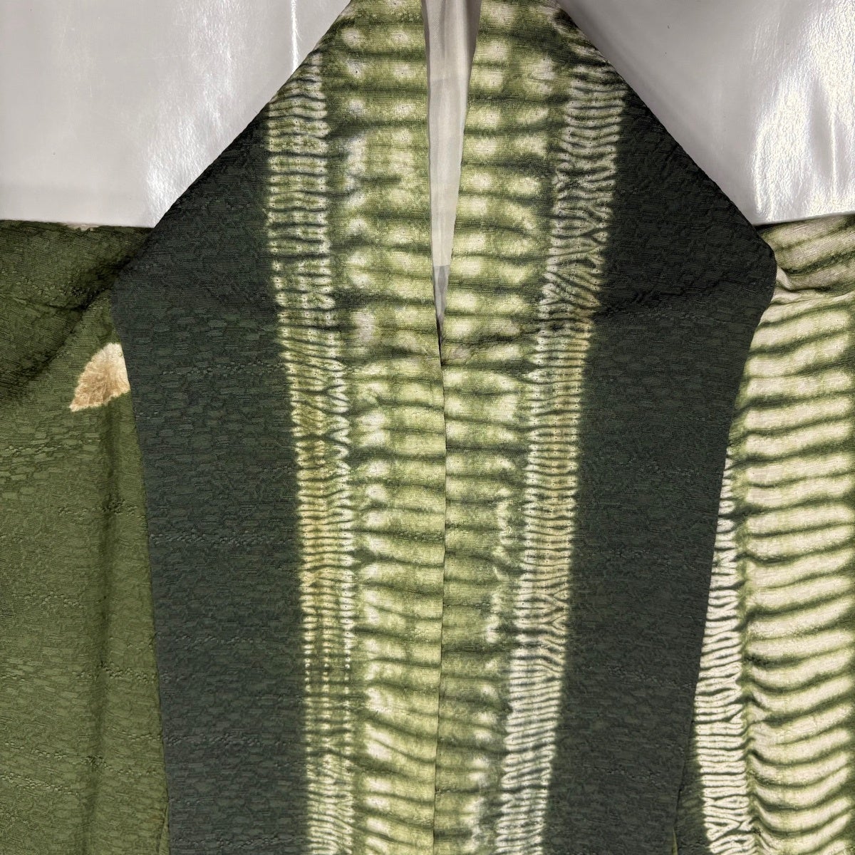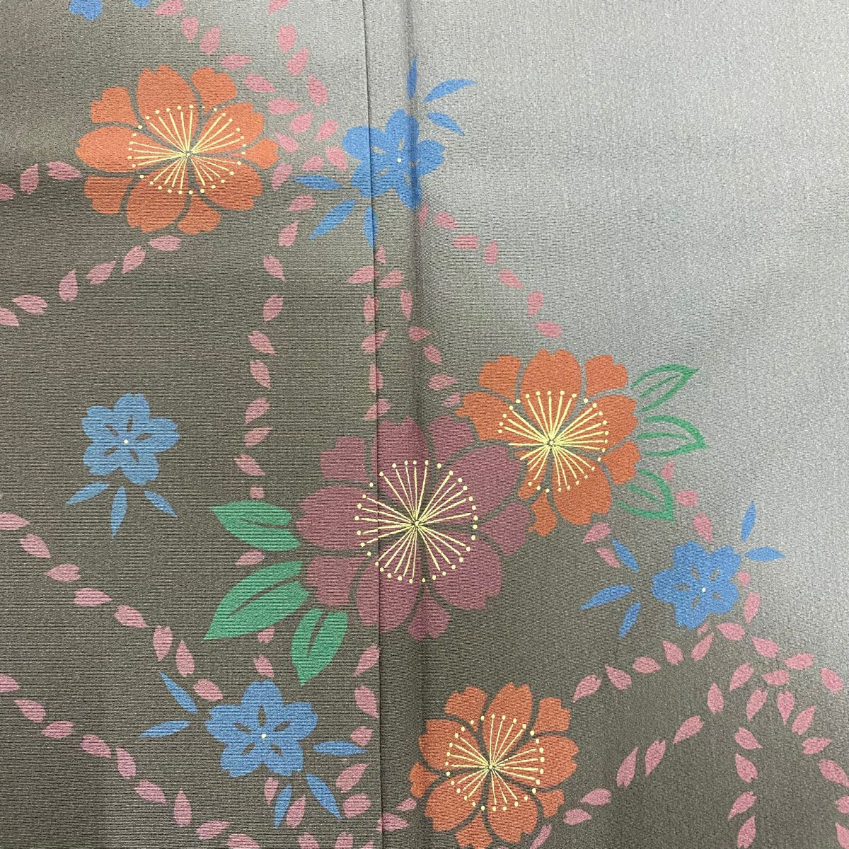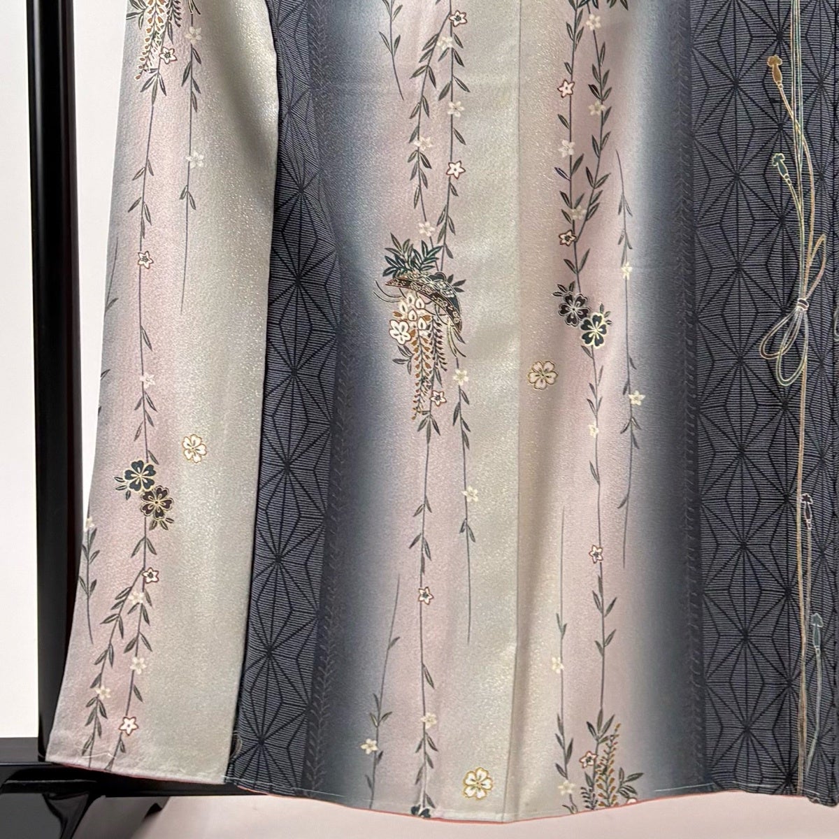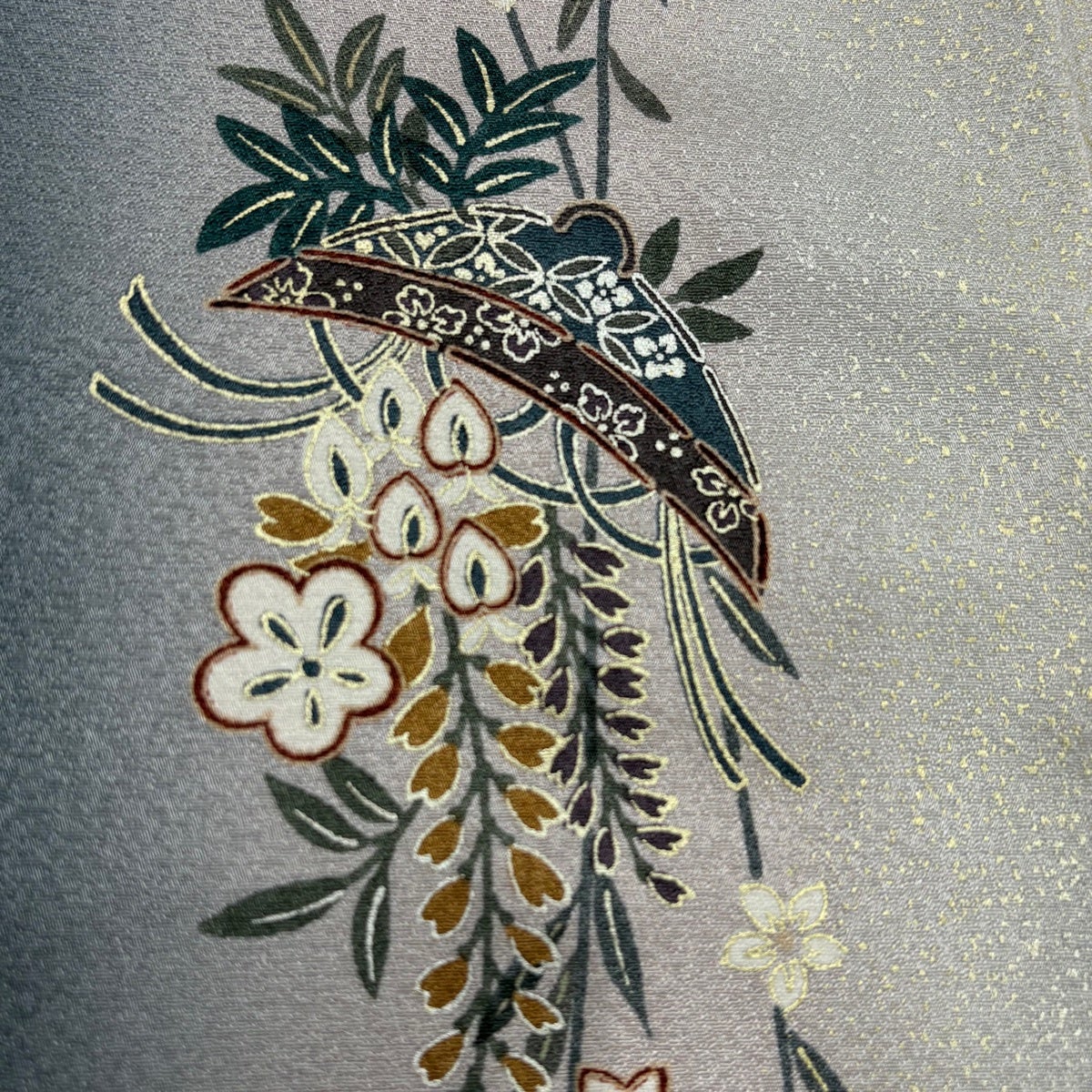 色留袖 身丈154.5cm 裄丈66cm M 袷 草花 幾何学模様 金彩 ぼかし 灰緑 正絹 秀品 一つ紋