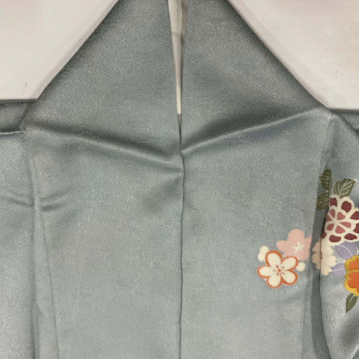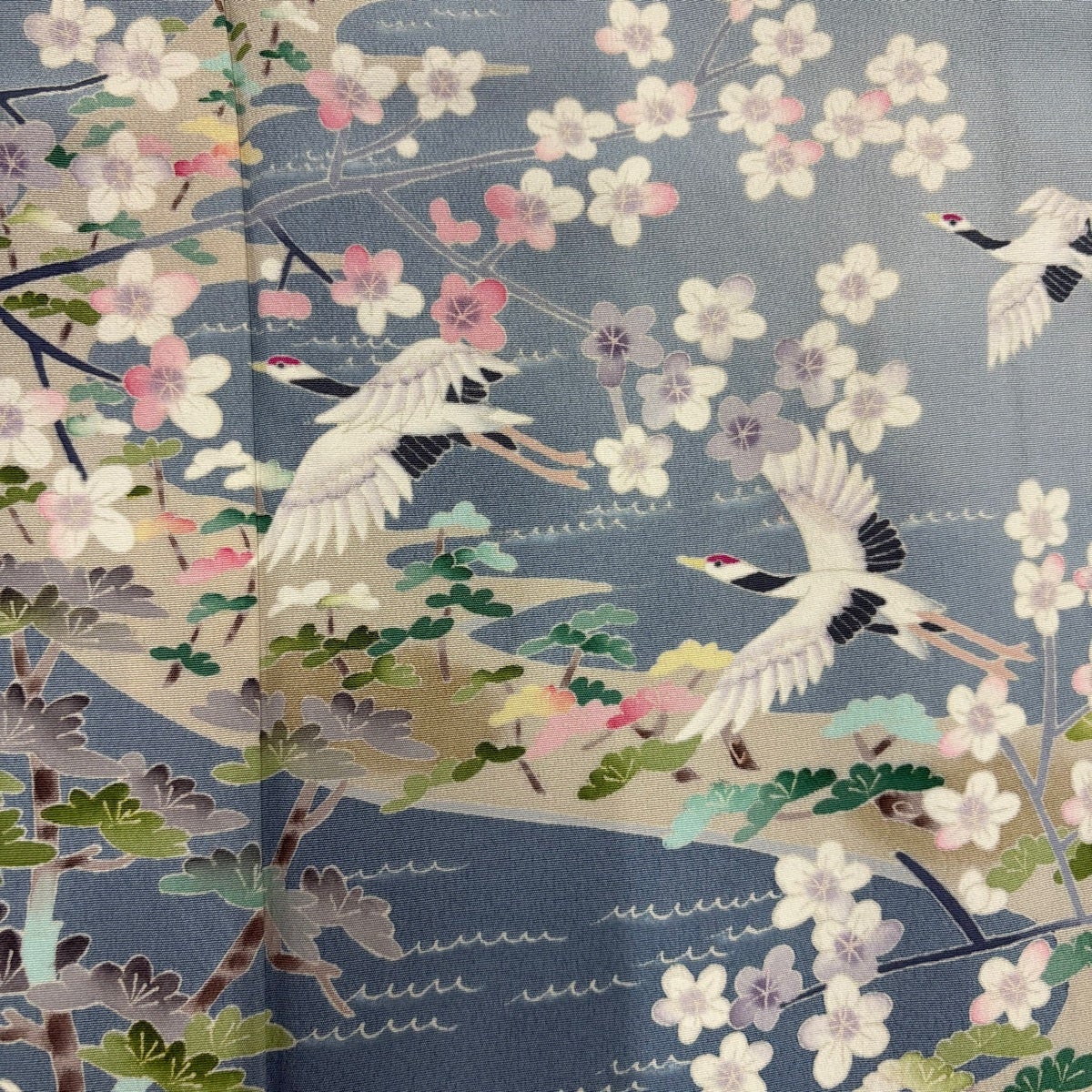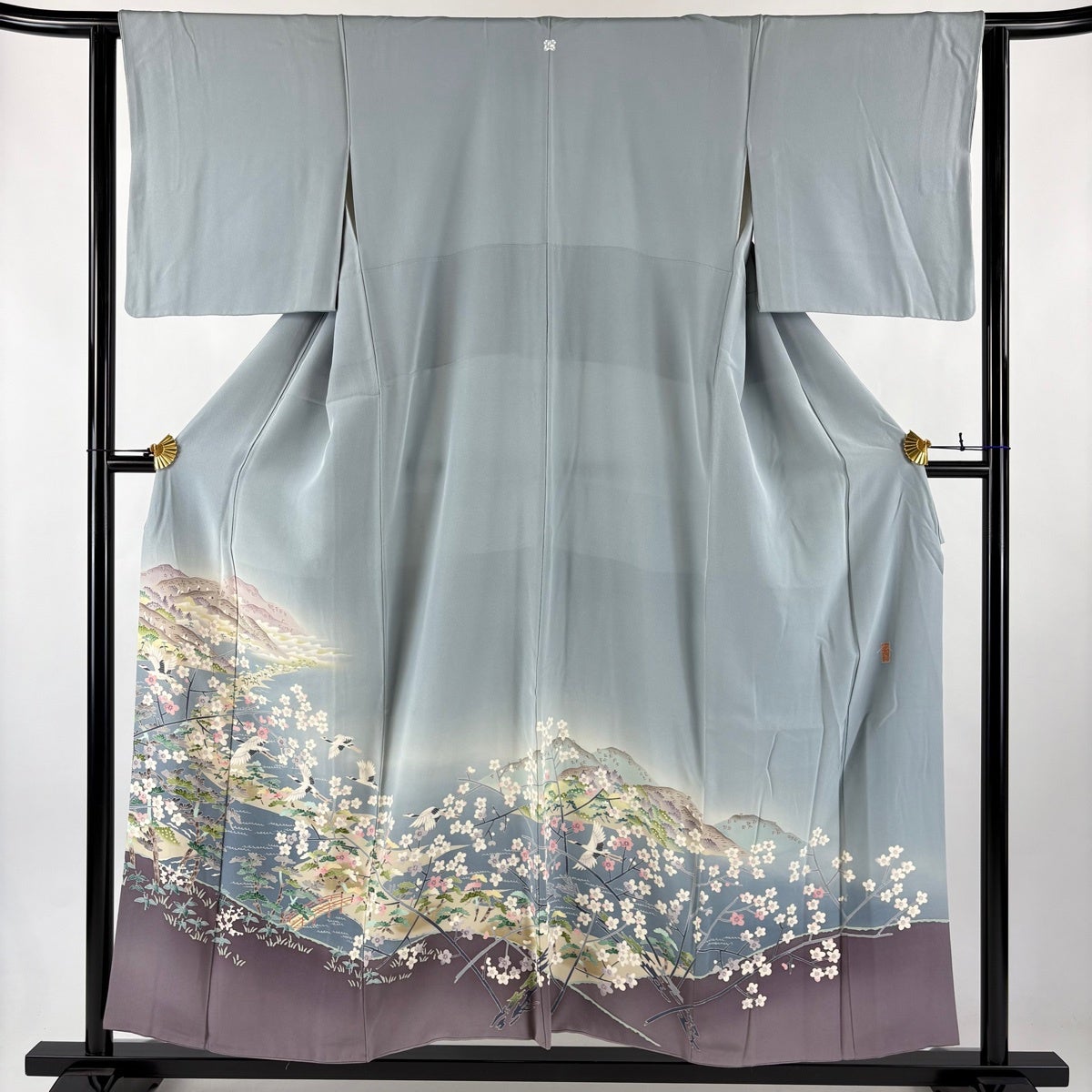 色留袖 身丈153.5cm 裄丈63cm S 袷 落款あり 松竹梅 鶴 ぼかし 青灰色 正絹 秀品 一つ紋