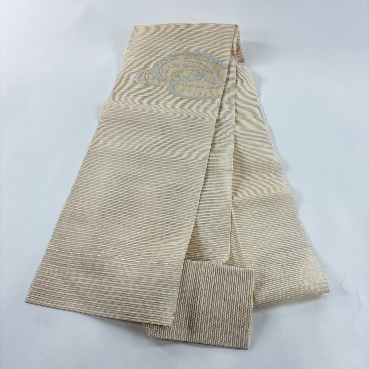 【美品】 名古屋帯 秀品 八寸名古屋帯 松葉仕立て やまと 雪輪 桜 金銀糸 刺繍 ピンクベージュ 正絹