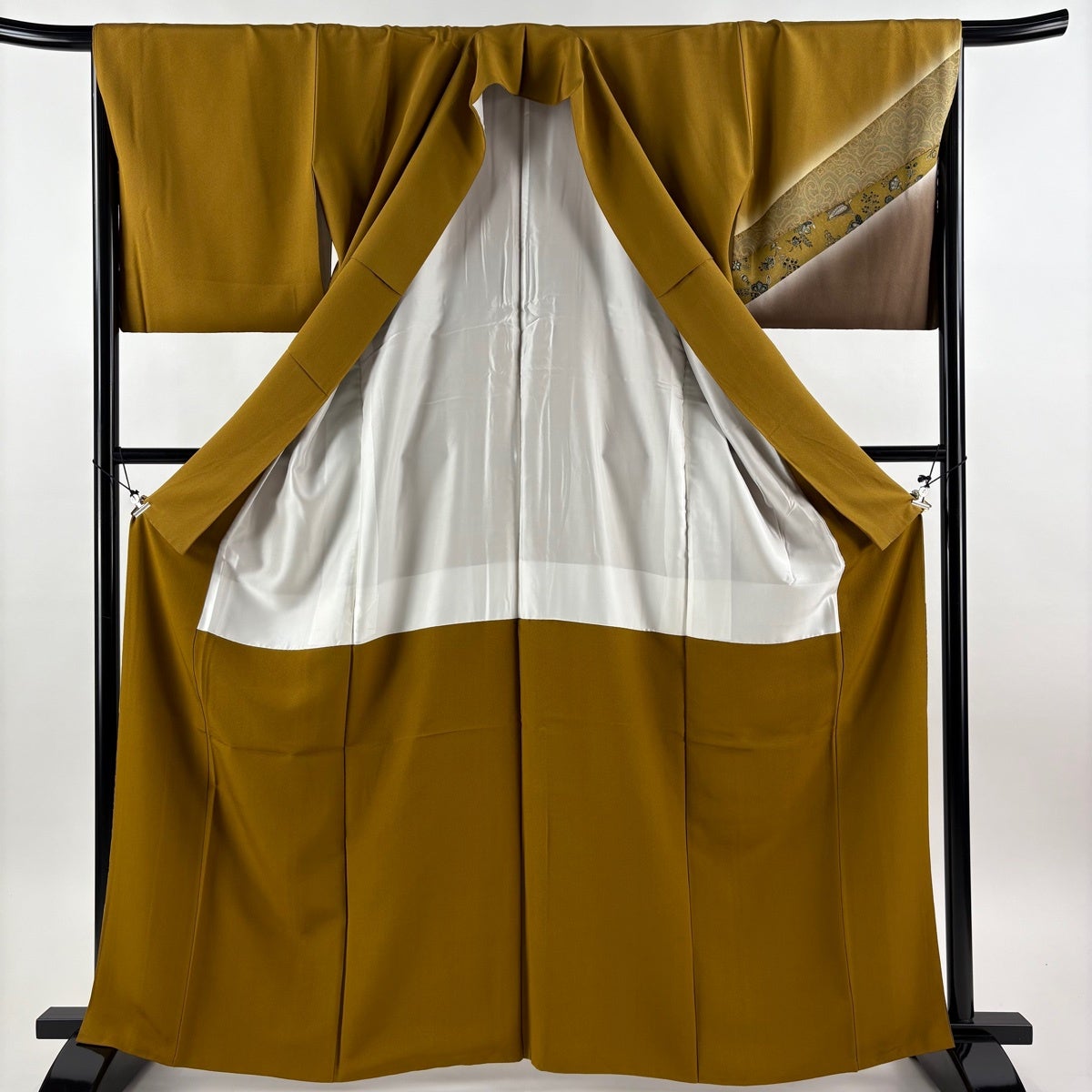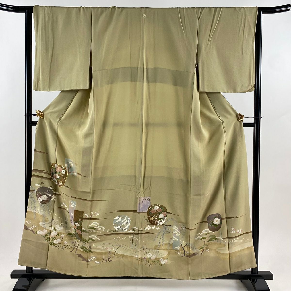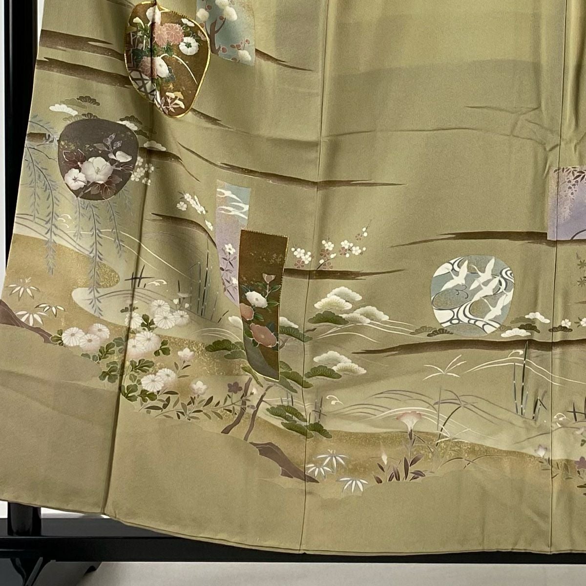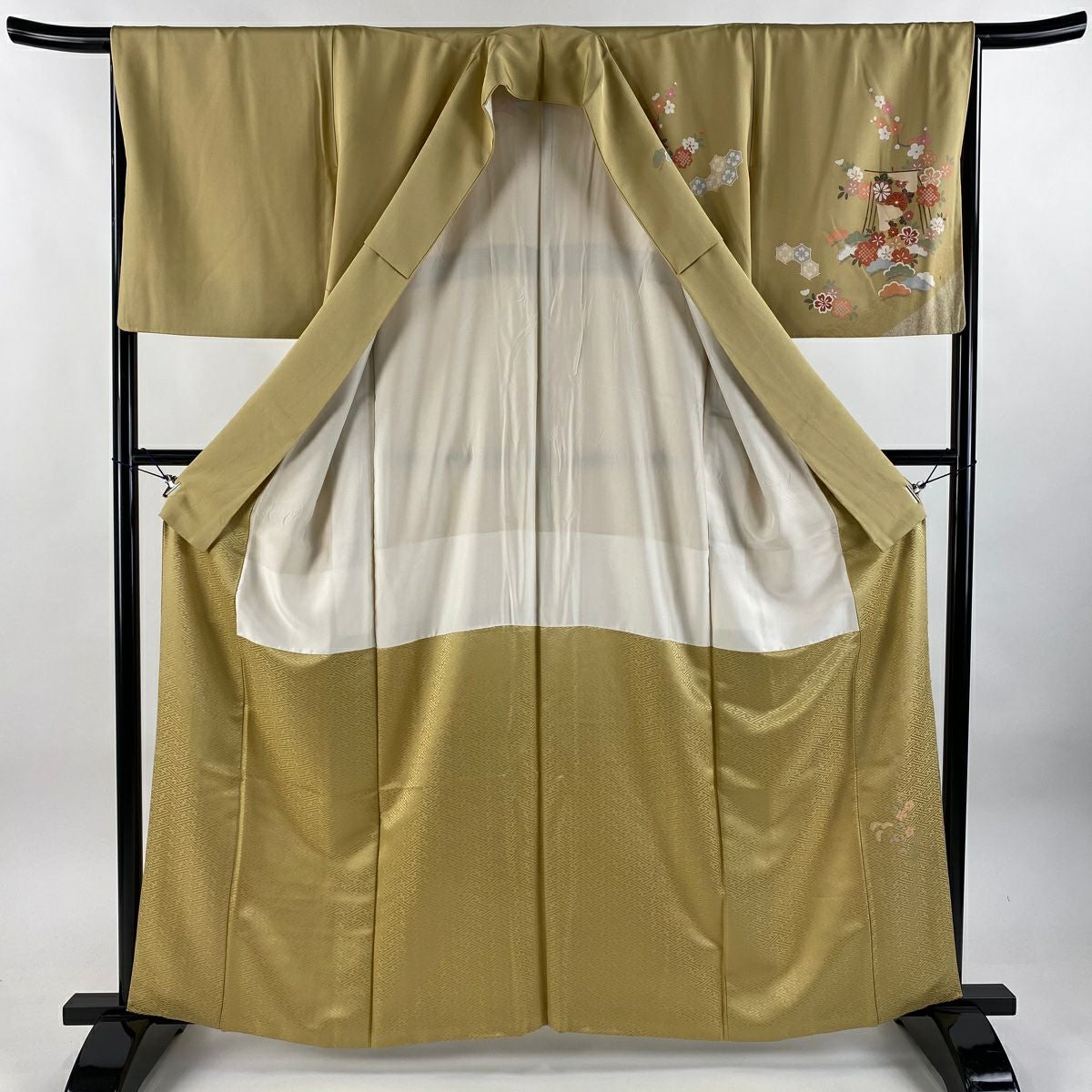 色留袖 身丈164.5cm 裄丈66cm M 袷 落款あり 華文 菱 金糸 金彩 茶緑色 正絹 秀品 三つ紋