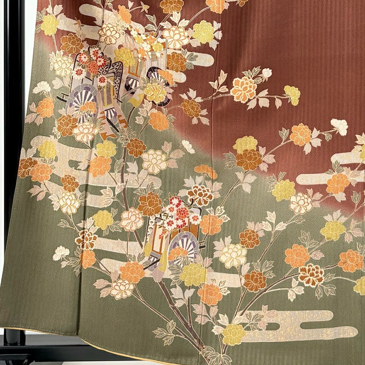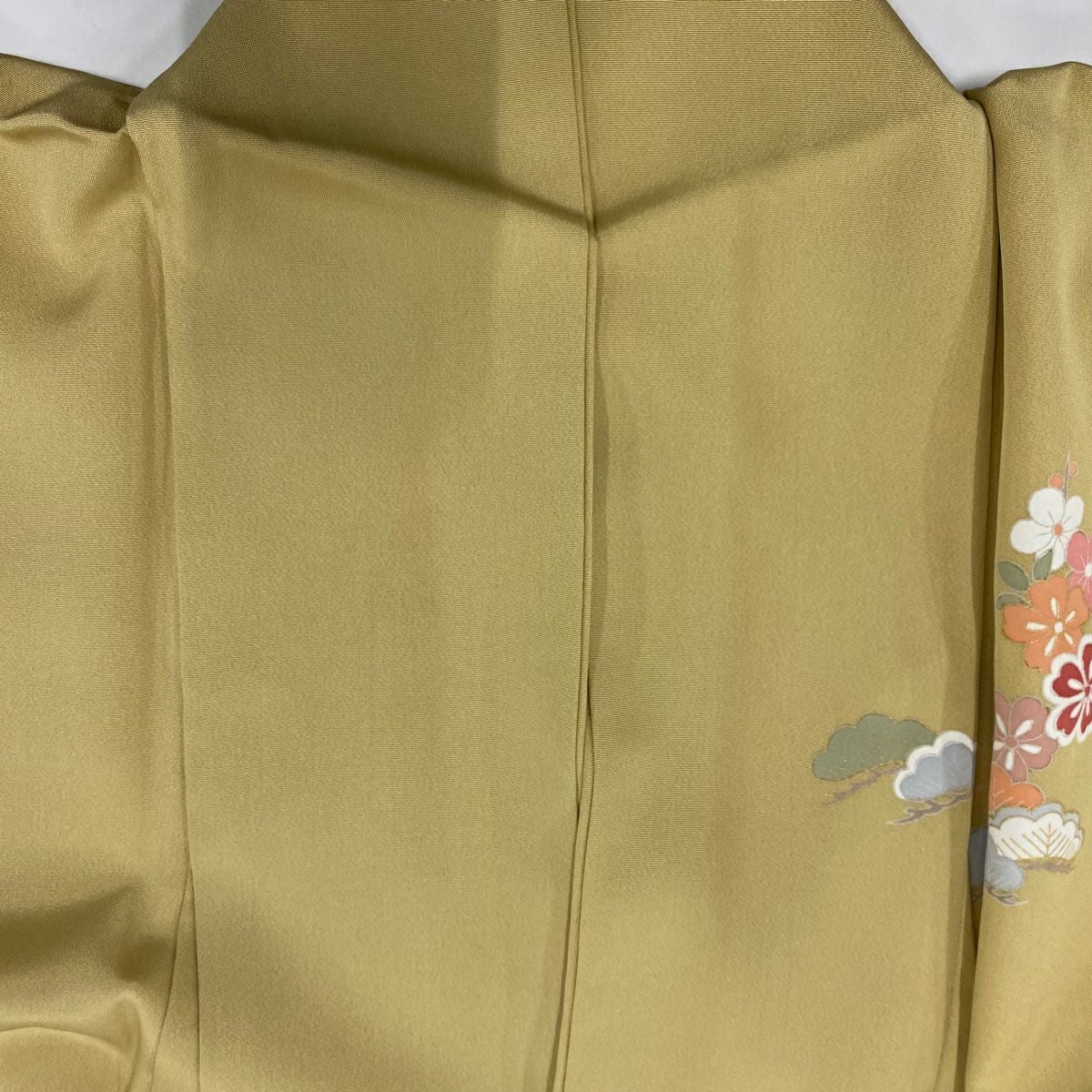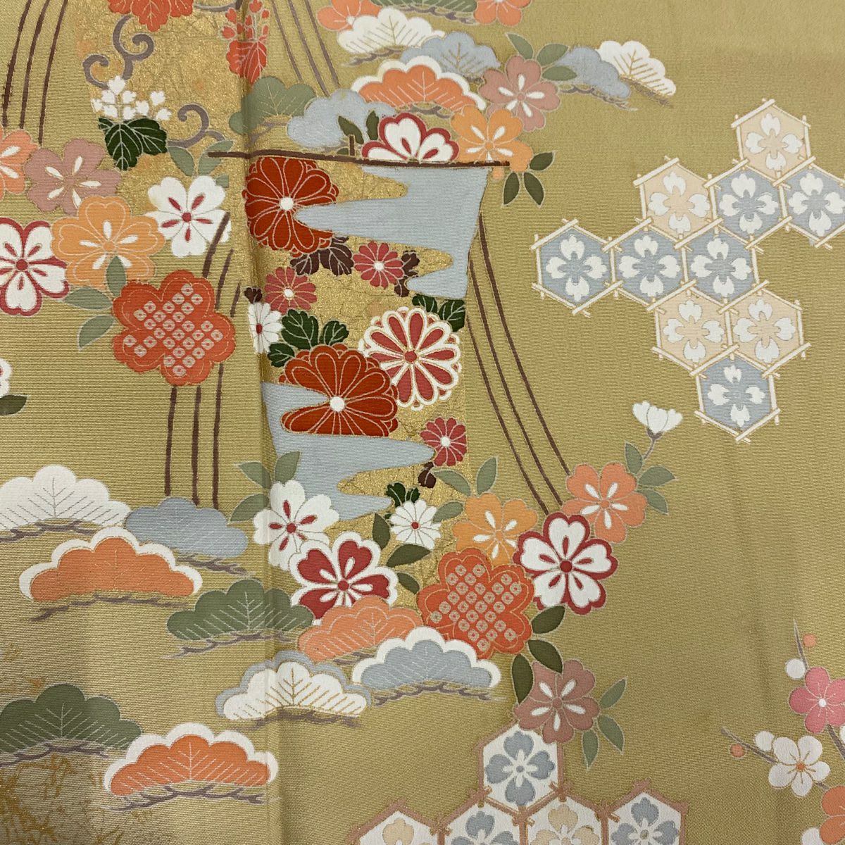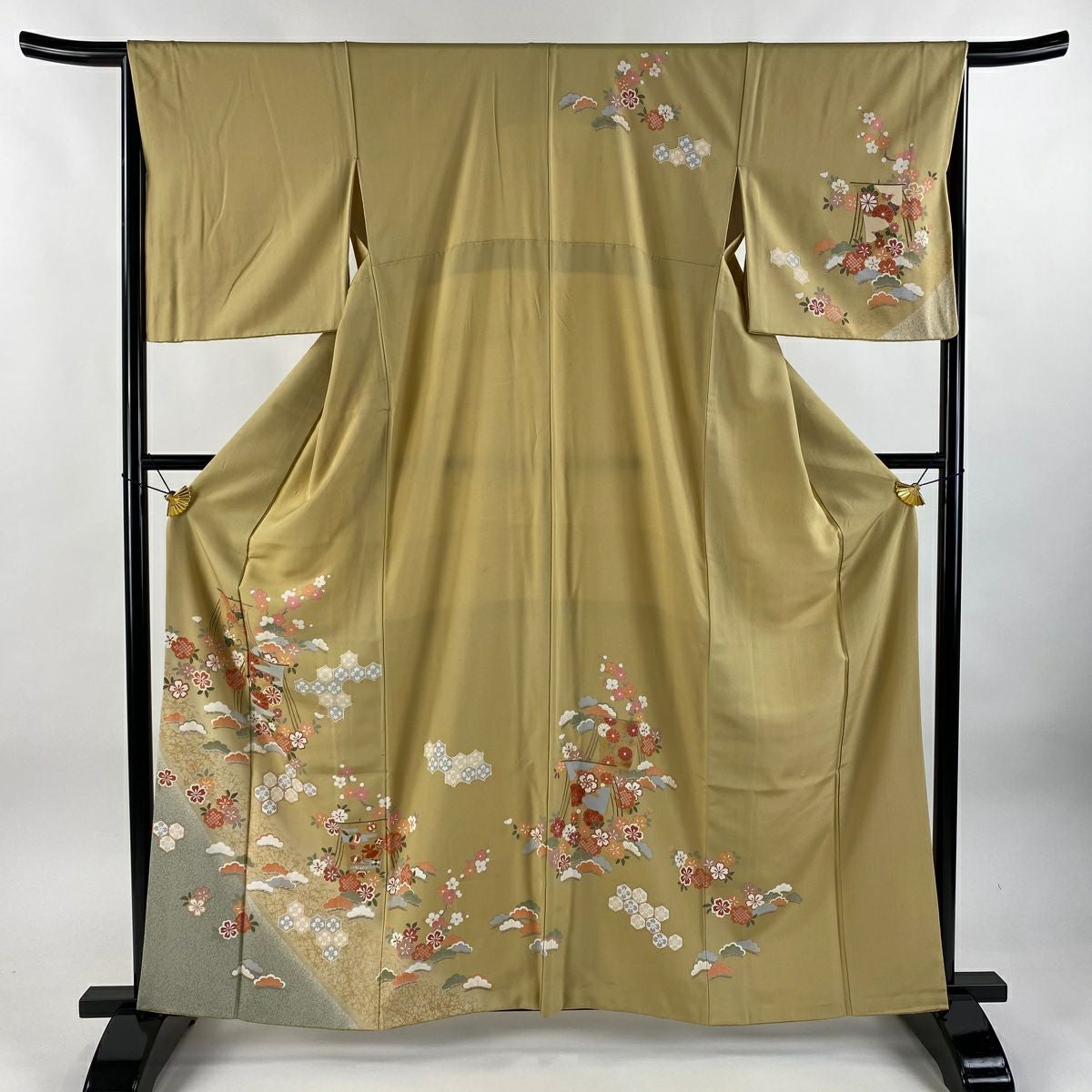 色留袖 身丈164.5cm 裄丈66cm M 袷 落款あり 華文 菱 金糸 金彩 茶緑色 正絹 秀品 三つ紋
