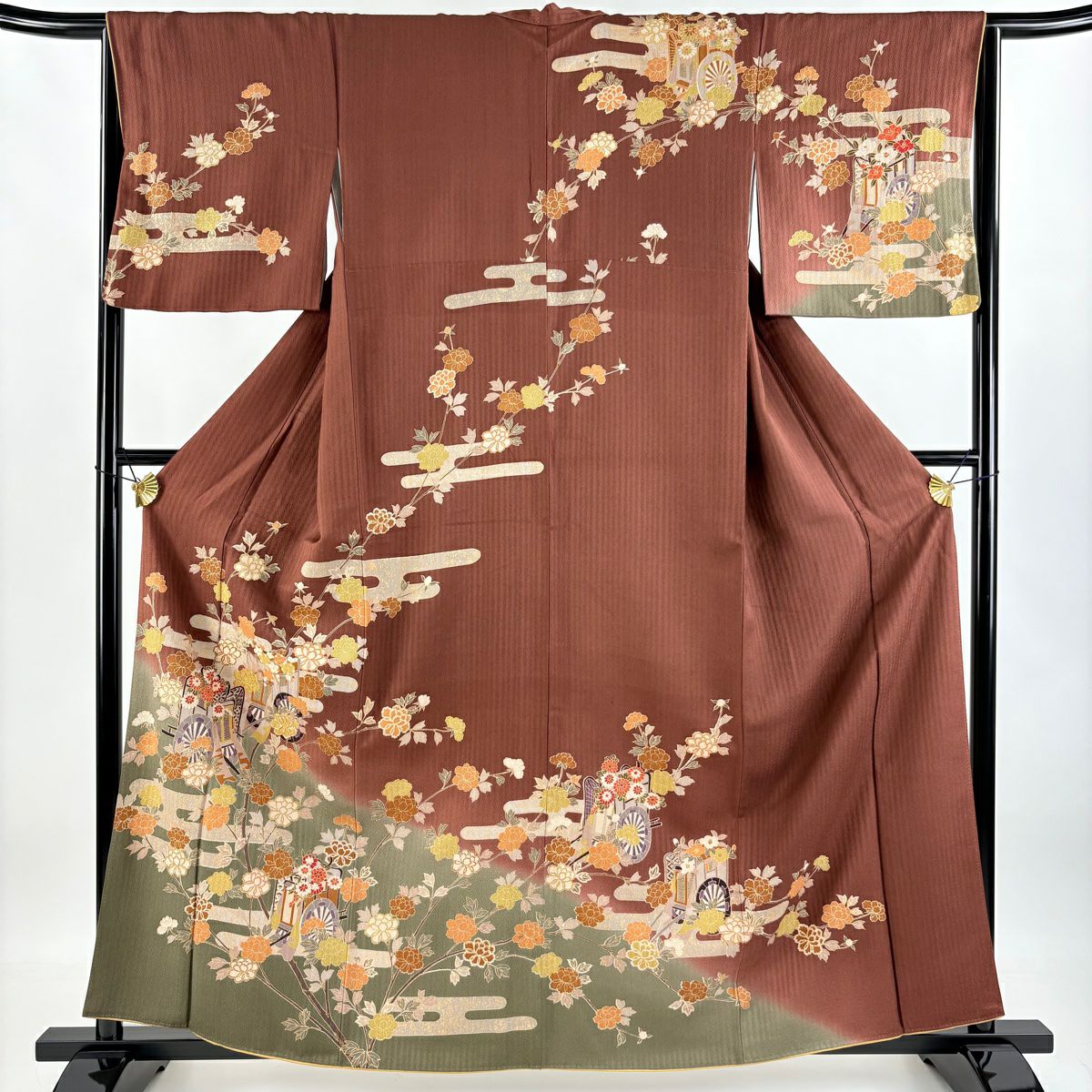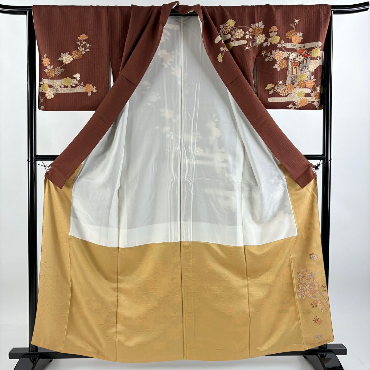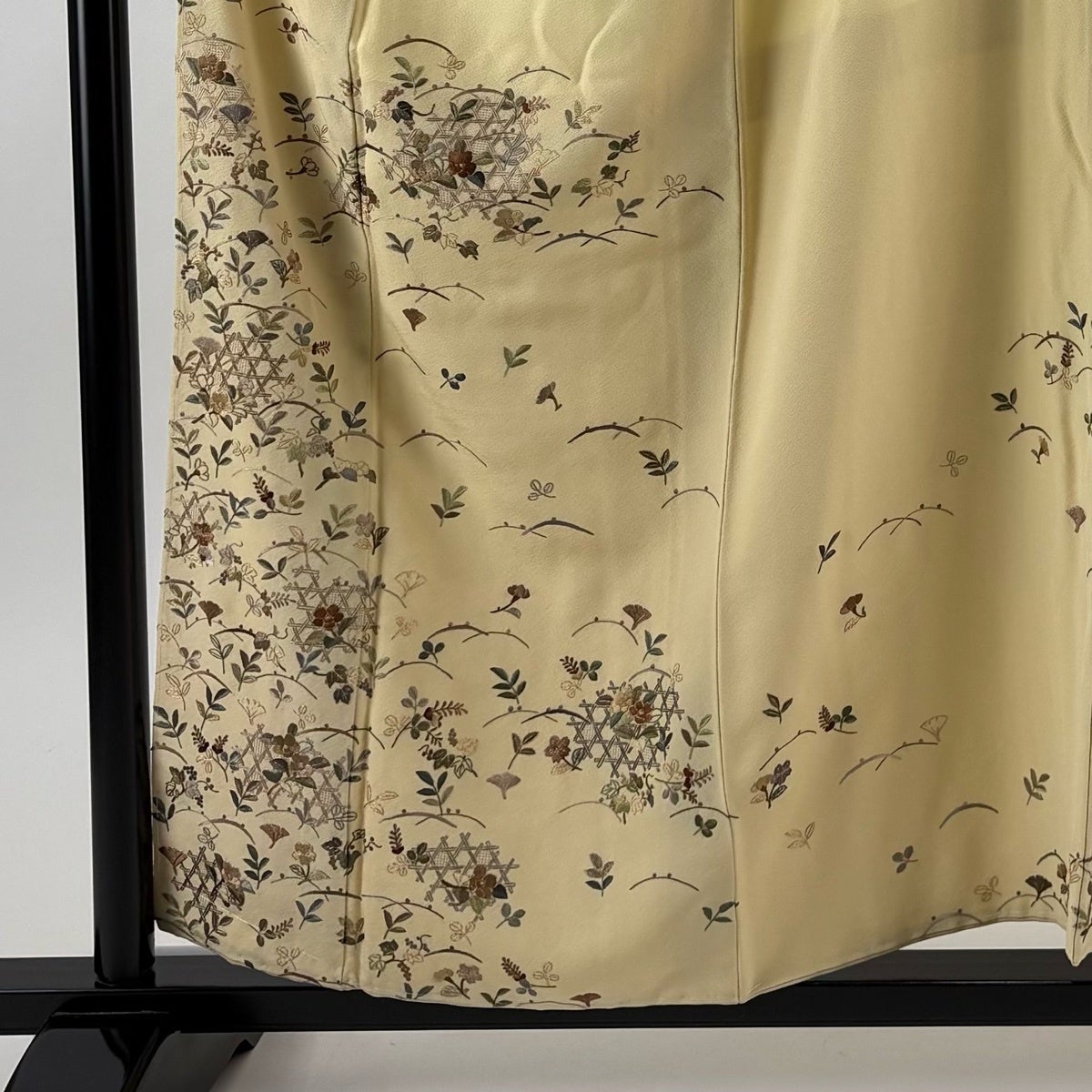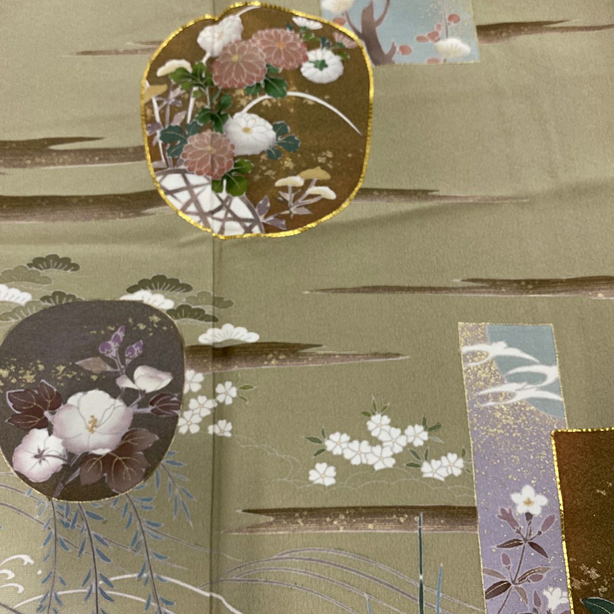 色留袖 身丈164.5cm 裄丈66cm M 袷 落款あり 華文 菱 金糸 金彩 茶緑色 正絹 秀品 三つ紋