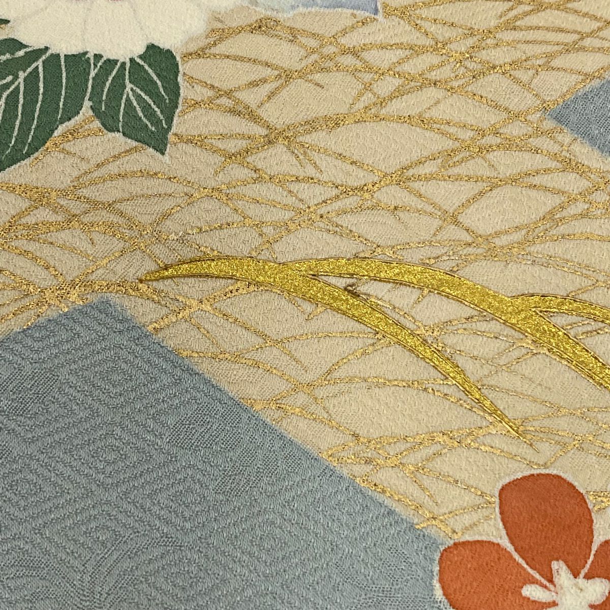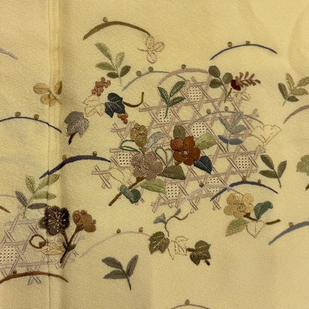 【美品】 訪問着 身丈156.5cm 裄丈64cm M 袷 椿 露芝 刺繍 金糸 ベージュ 正絹 秀品