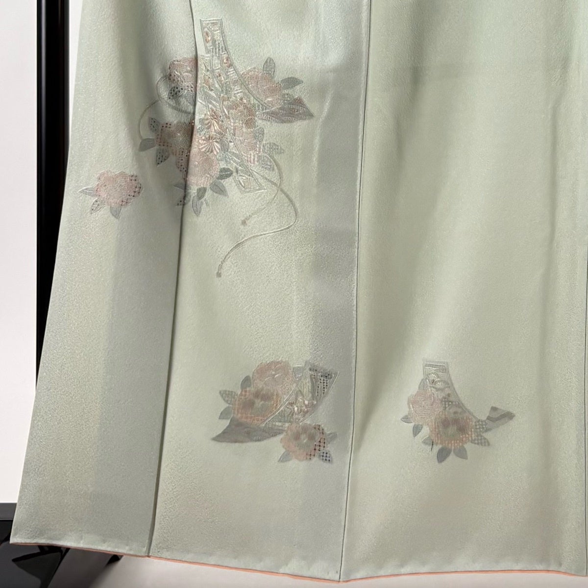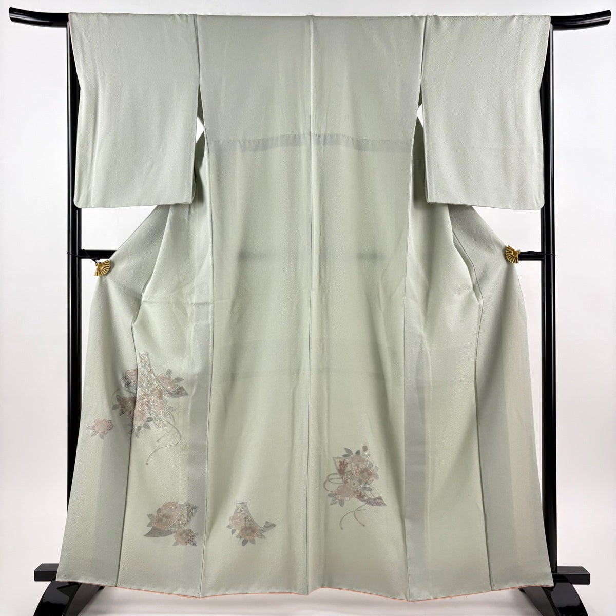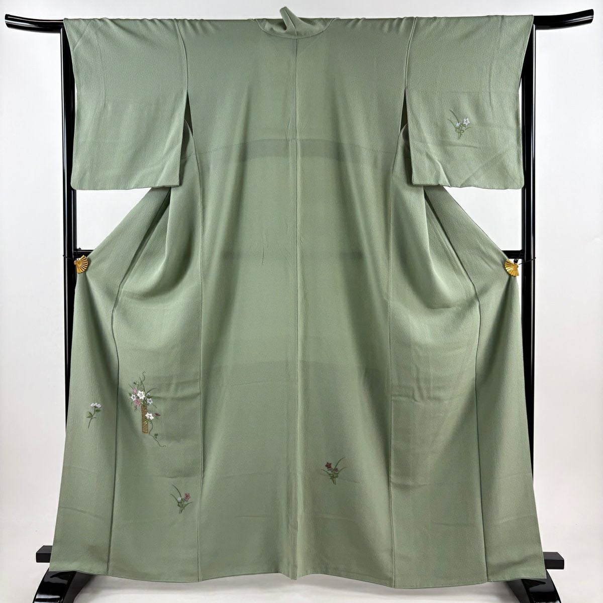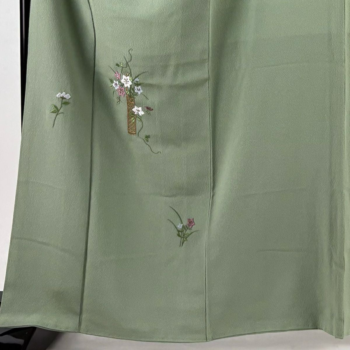 【美品】 付下げ 身丈162cm 裄丈66.5cm M 袷 短冊 草花 汕頭刺繍 相良刺繍 薄緑 正絹 秀品