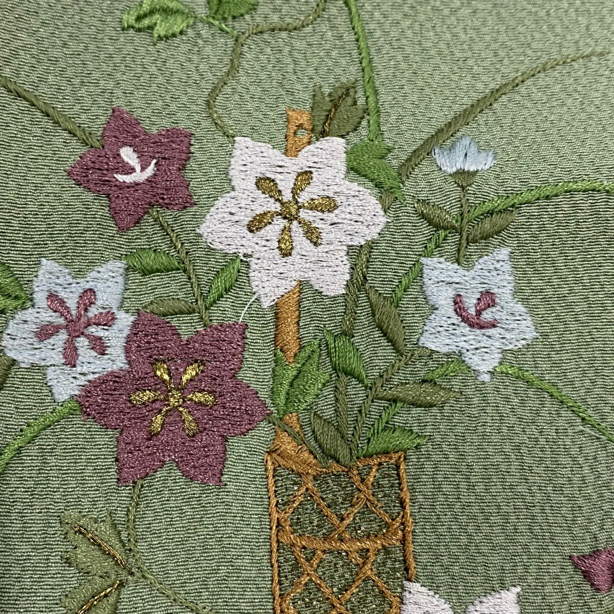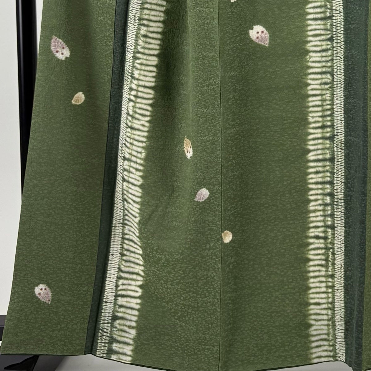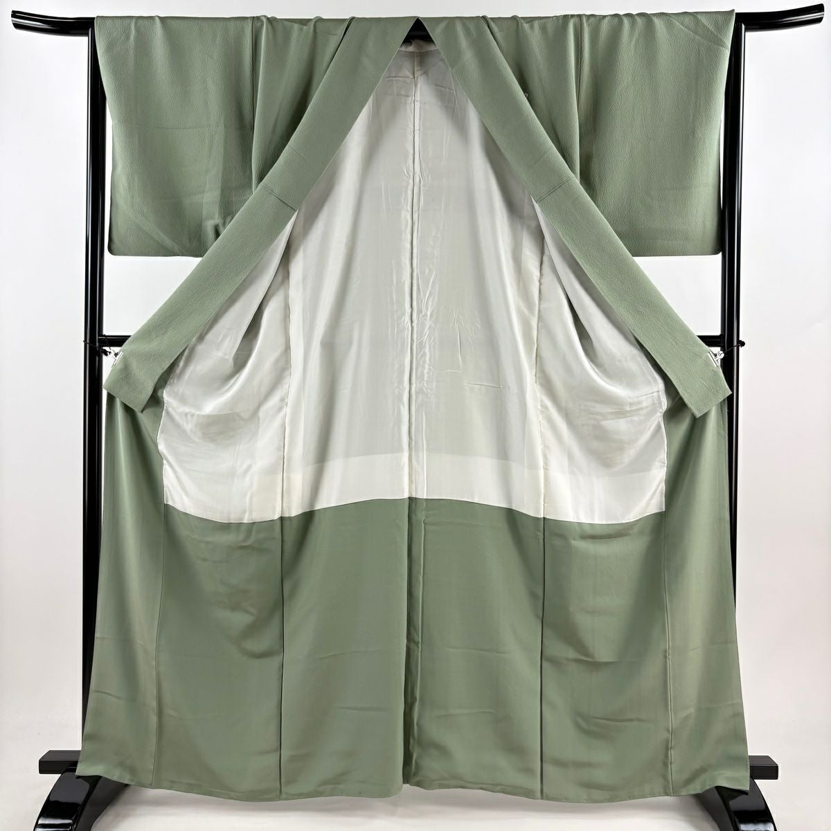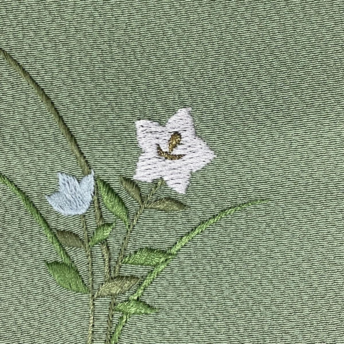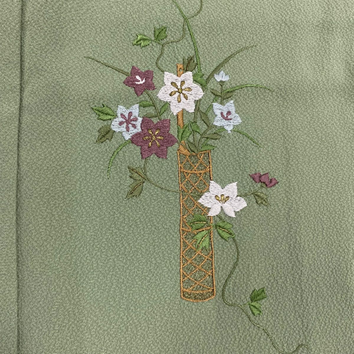 【美品】 付下げ 身丈162cm 裄丈66.5cm M 袷 短冊 草花 汕頭刺繍 相良刺繍 薄緑 正絹 秀品