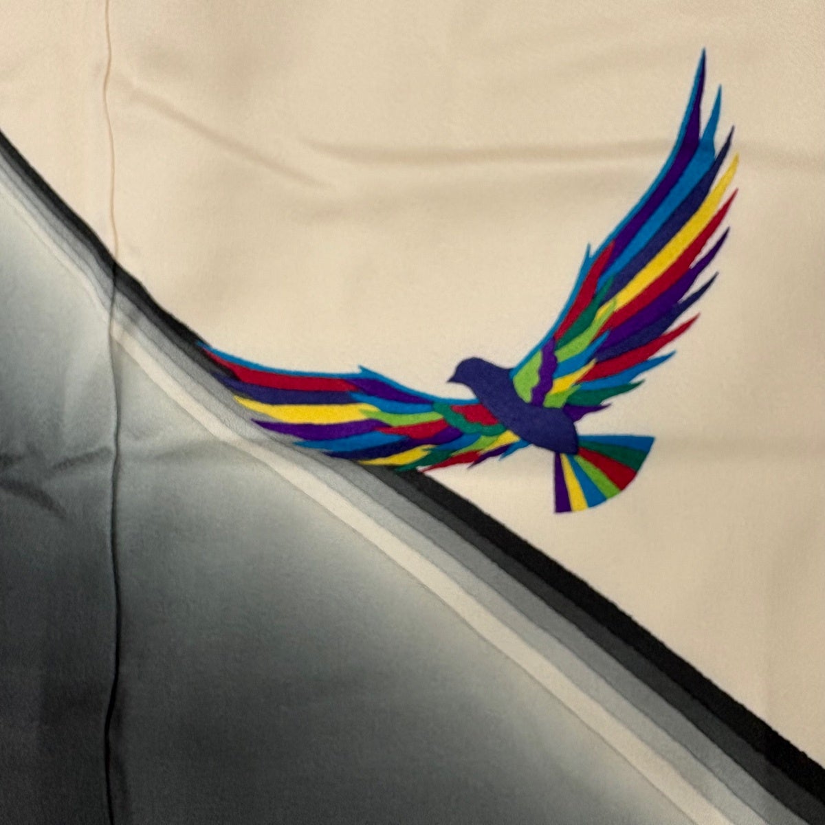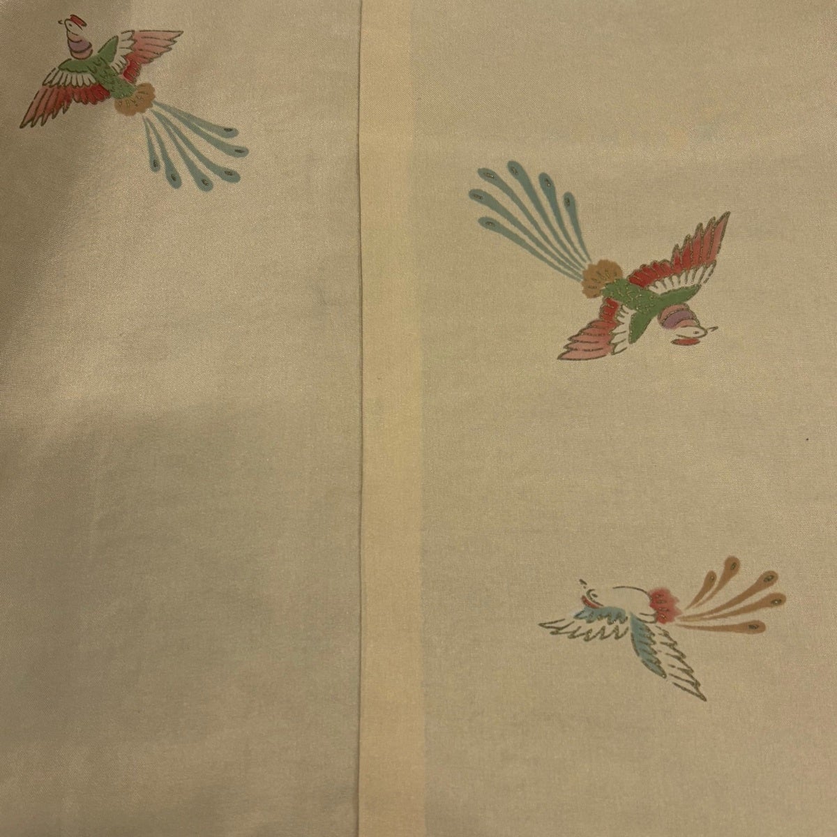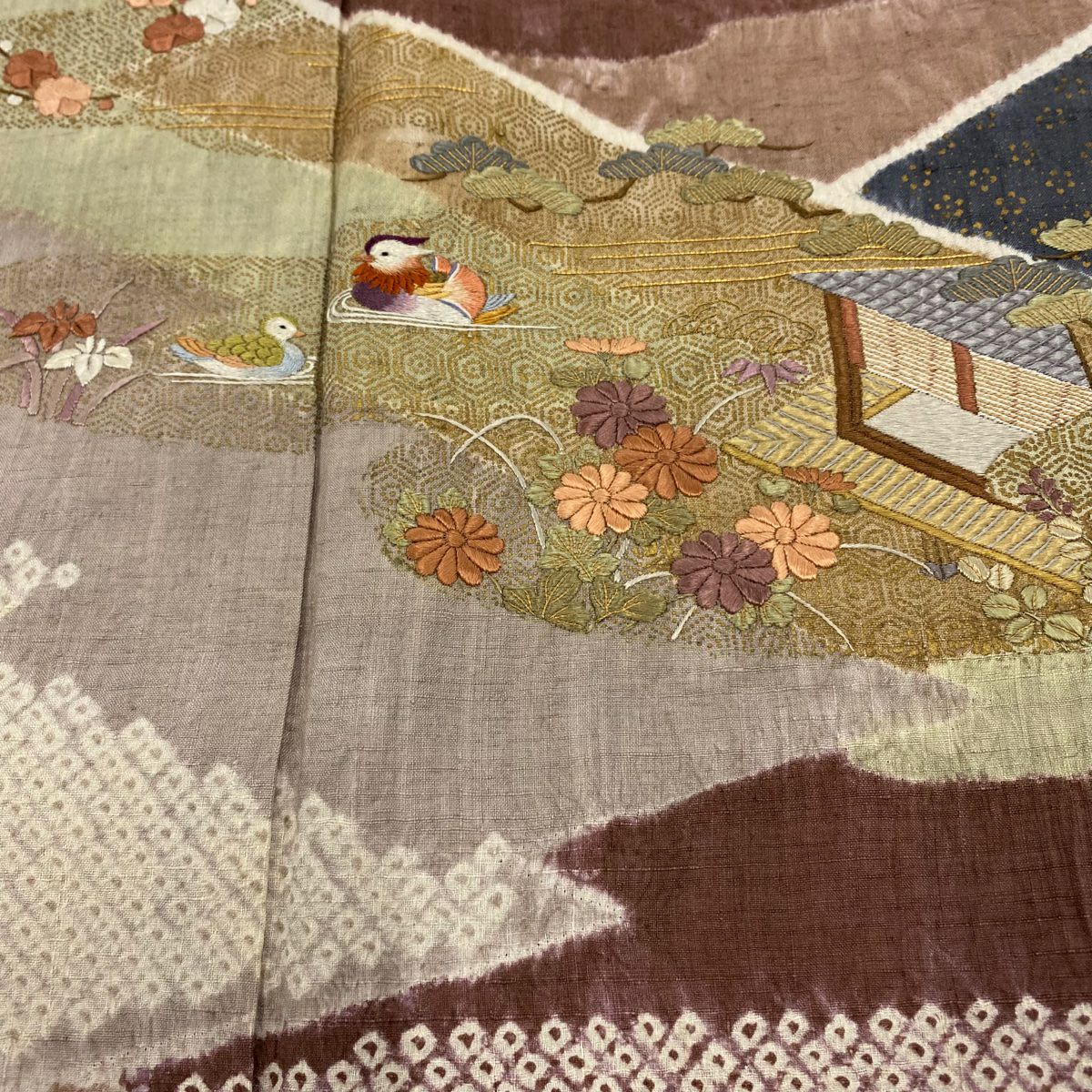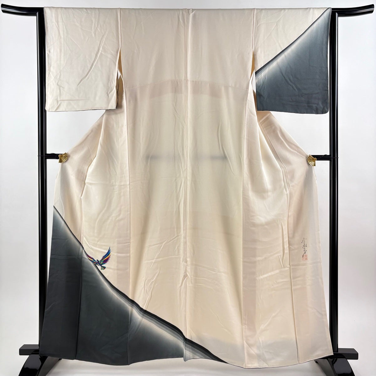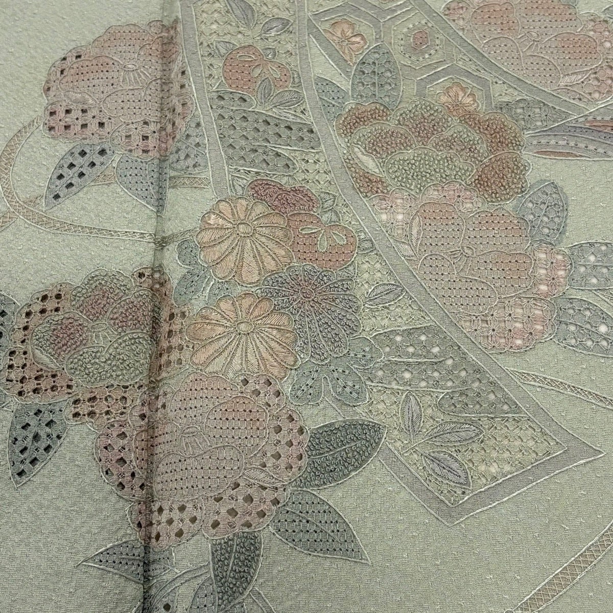 付下げ 身丈157.5cm 裄丈64.5cm M 単衣 落款あり 向い鳥 華文 刺繍 金銀糸 灰緑 正絹 秀品