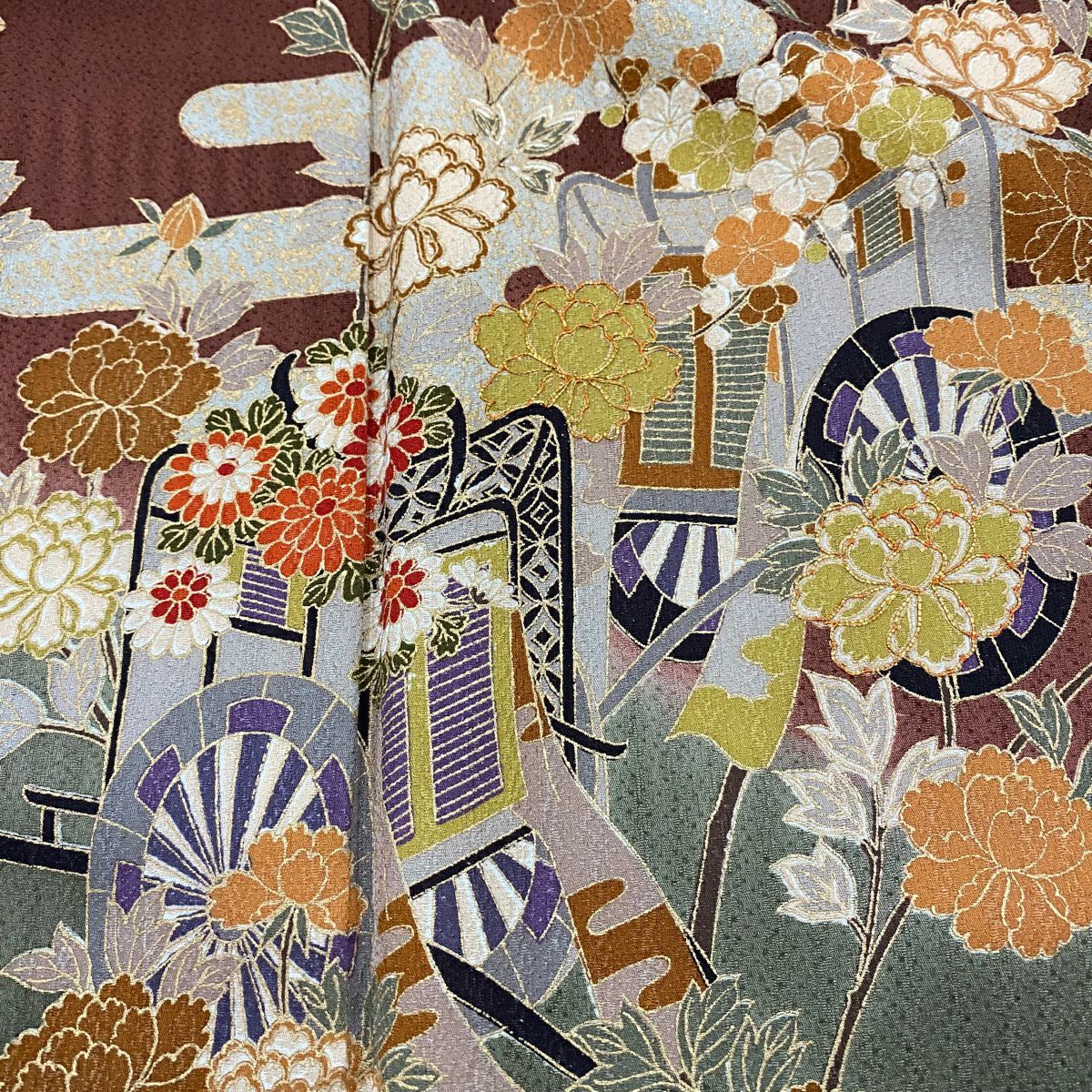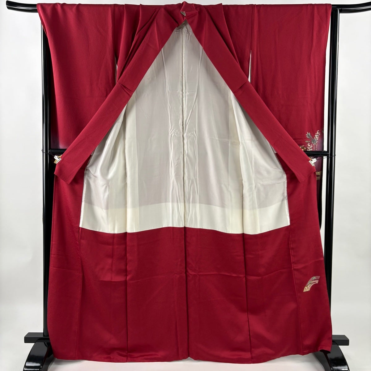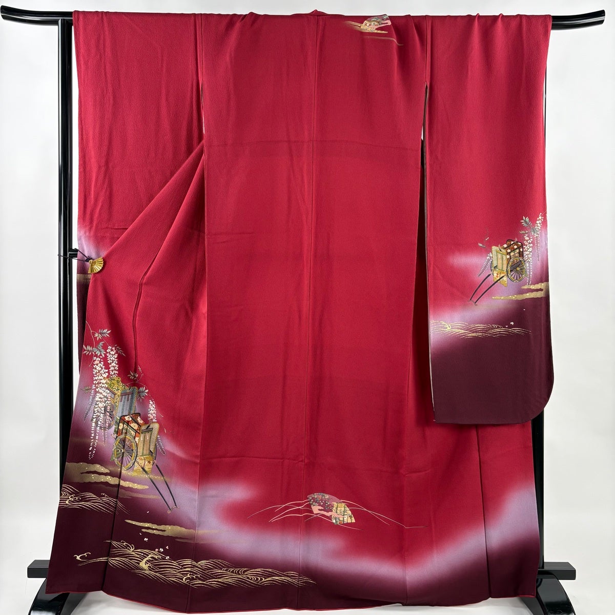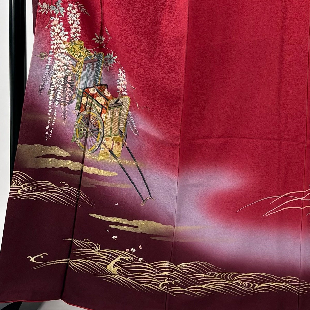 振袖 身丈165cm 裄丈68.5cm L 袷 手描友禅 落款あり 御所車 波 金彩 ぼかし 赤 正絹 秀品
