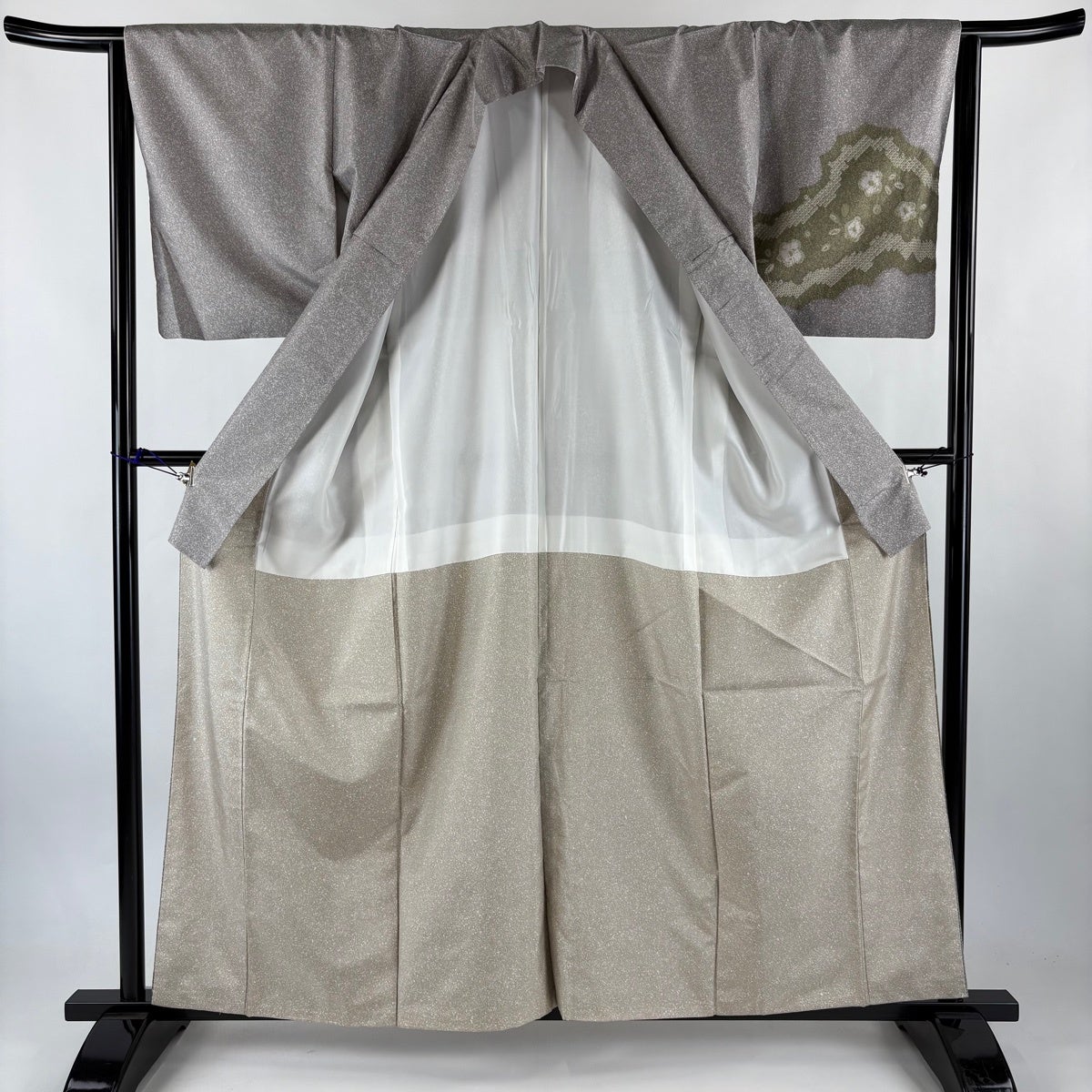 訪問着 身丈161.5cm 裄丈66cm M 袷 草花 幾何学模様 金銀彩 絞り ベージュ 正絹 秀品