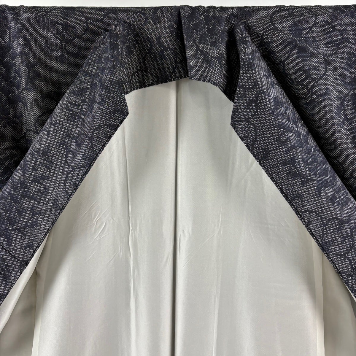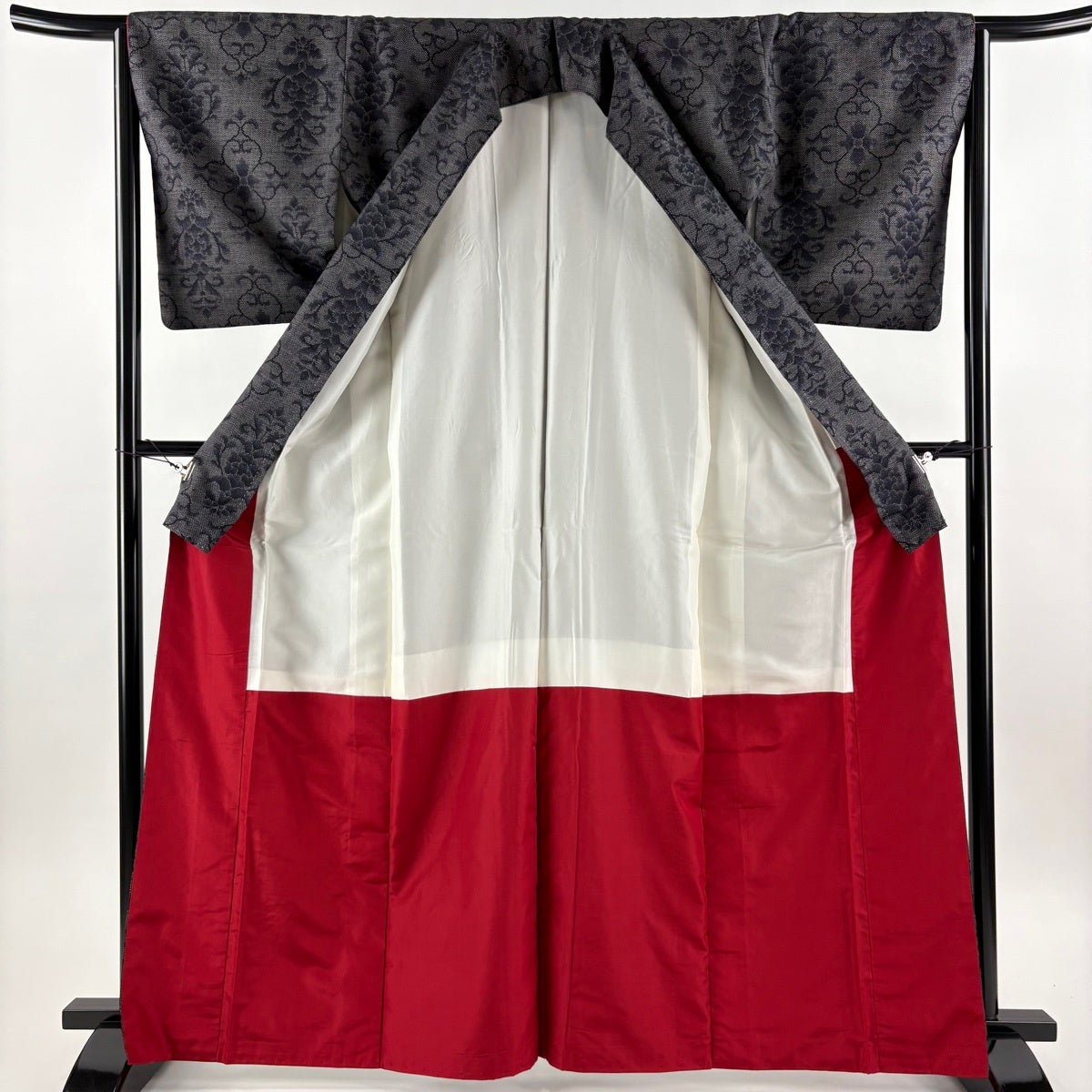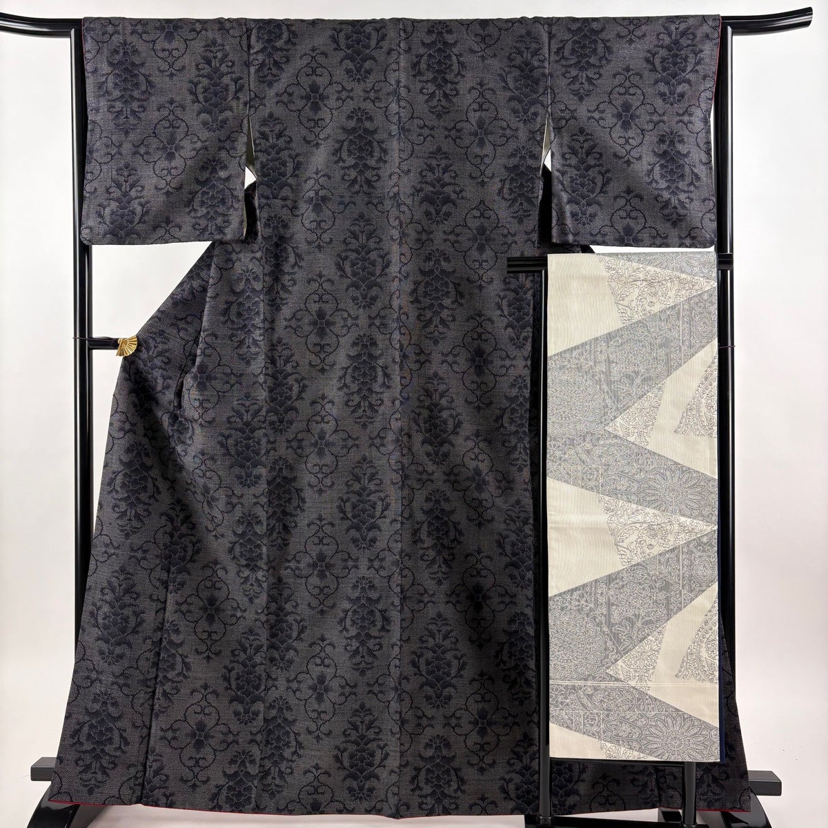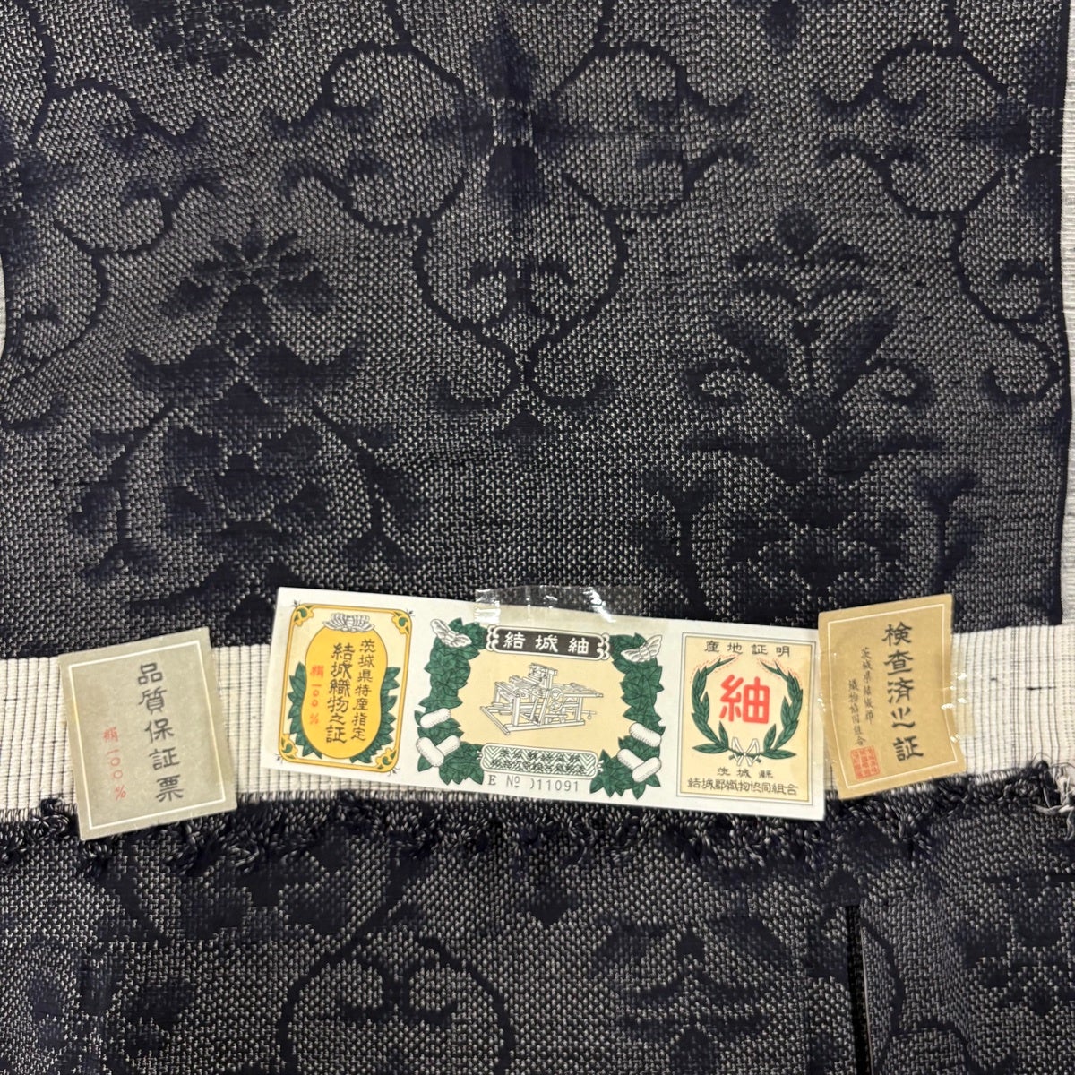 【美品】 紬 身丈165.5cm 裄丈65cm M 袷 袋名古屋帯セット 証紙あり 花唐草 墨色 正絹 秀品