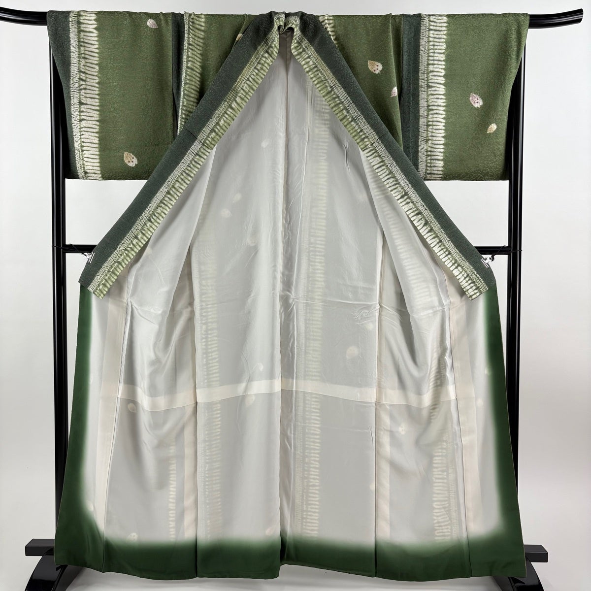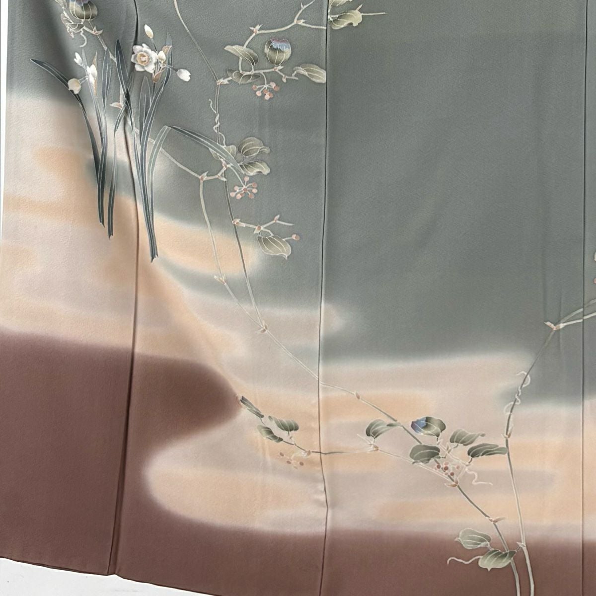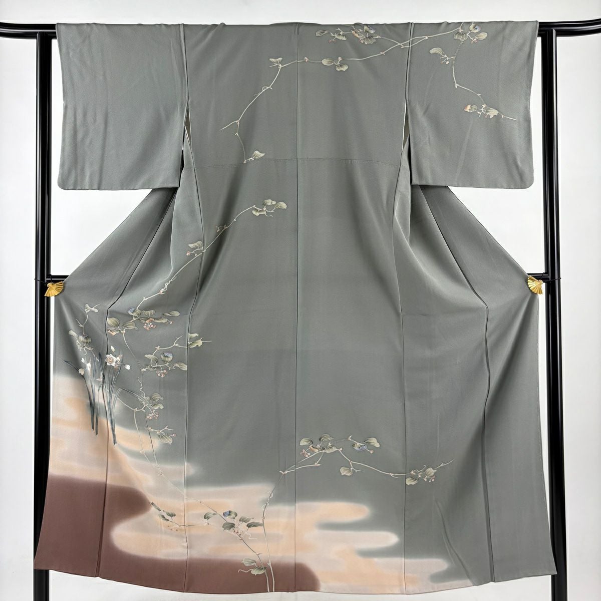 付下げ 身丈158.5cm 裄丈64cm M 袷 落款あり 葡萄 草花 染め分け ぼかし 灰緑 正絹 秀品