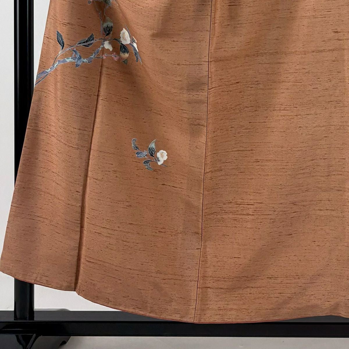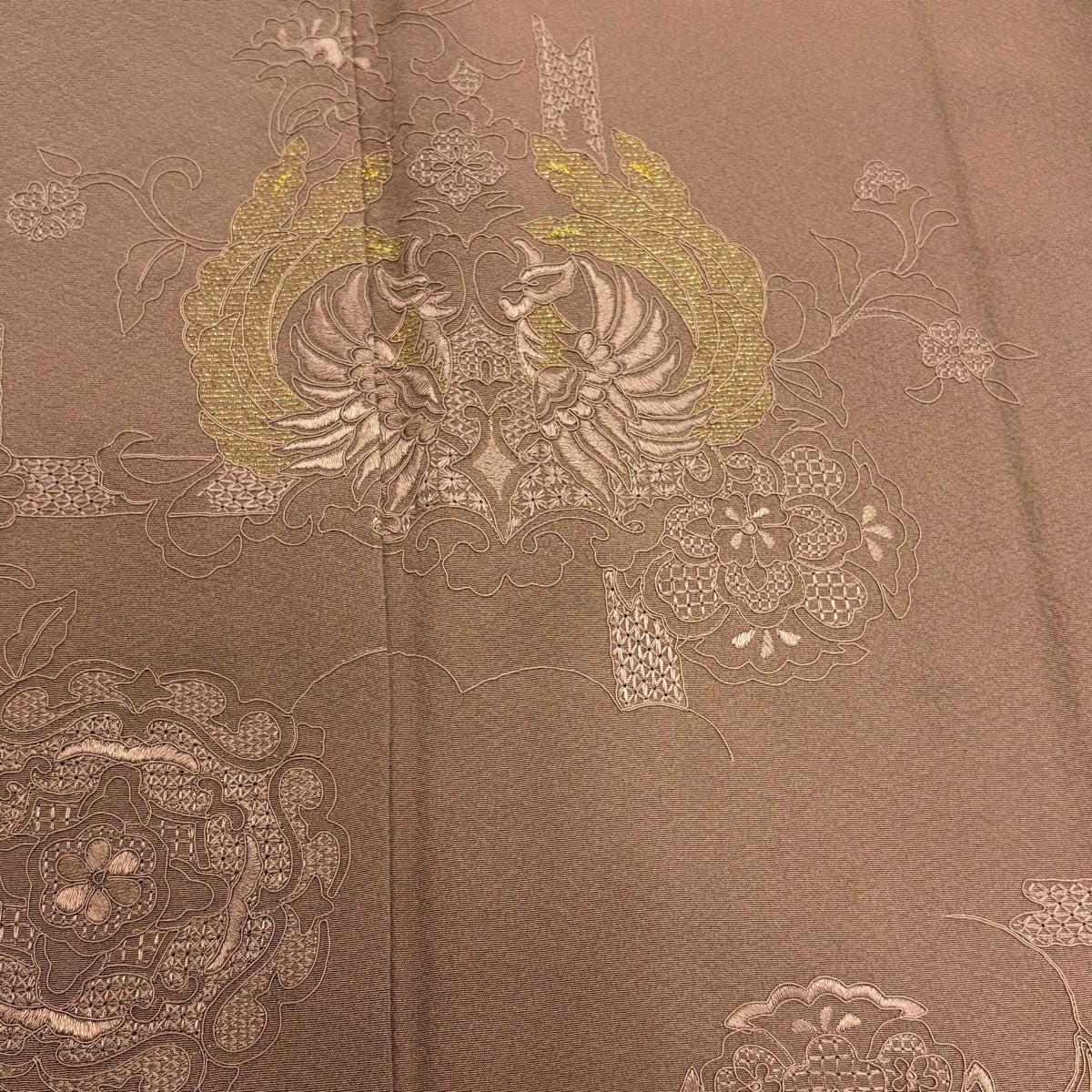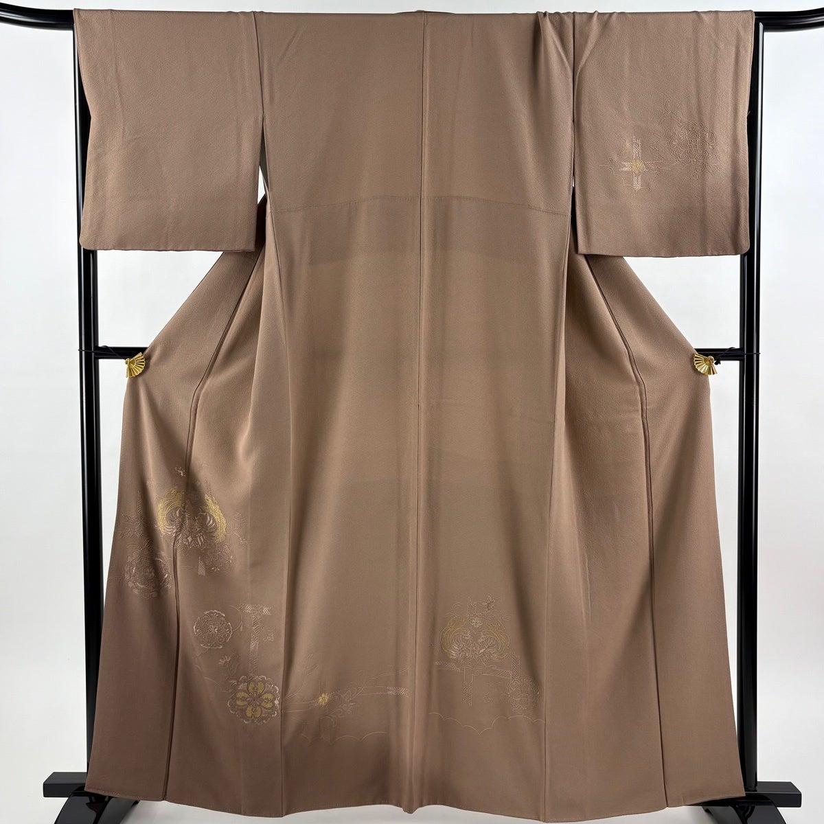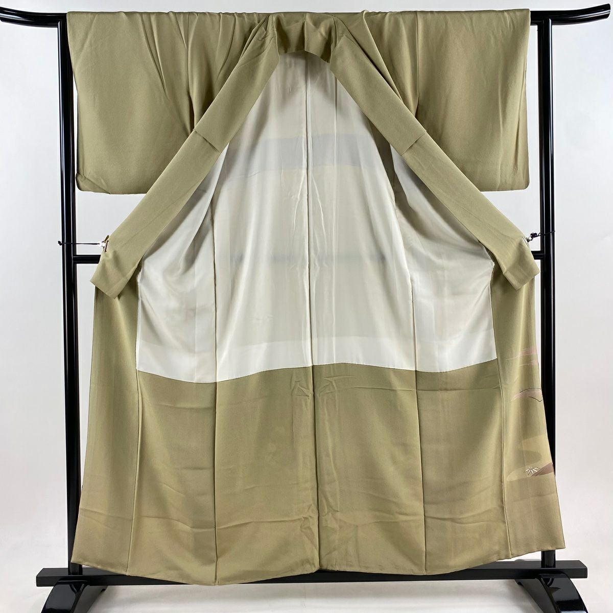色留袖 身丈165cm 裄丈66.5cm M 袷 落款あり 鶴 松竹梅 金糸 金彩 薄茶色 正絹 秀品 三つ紋