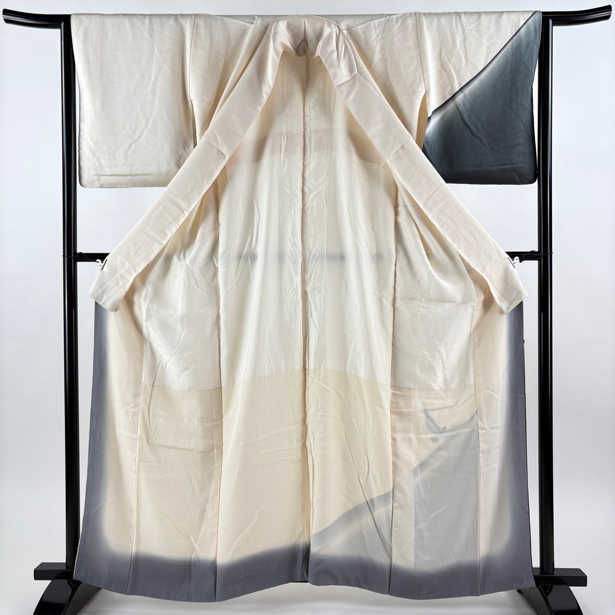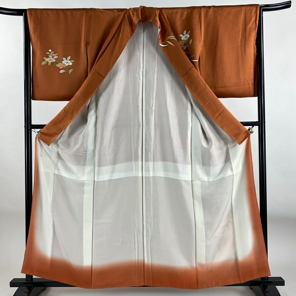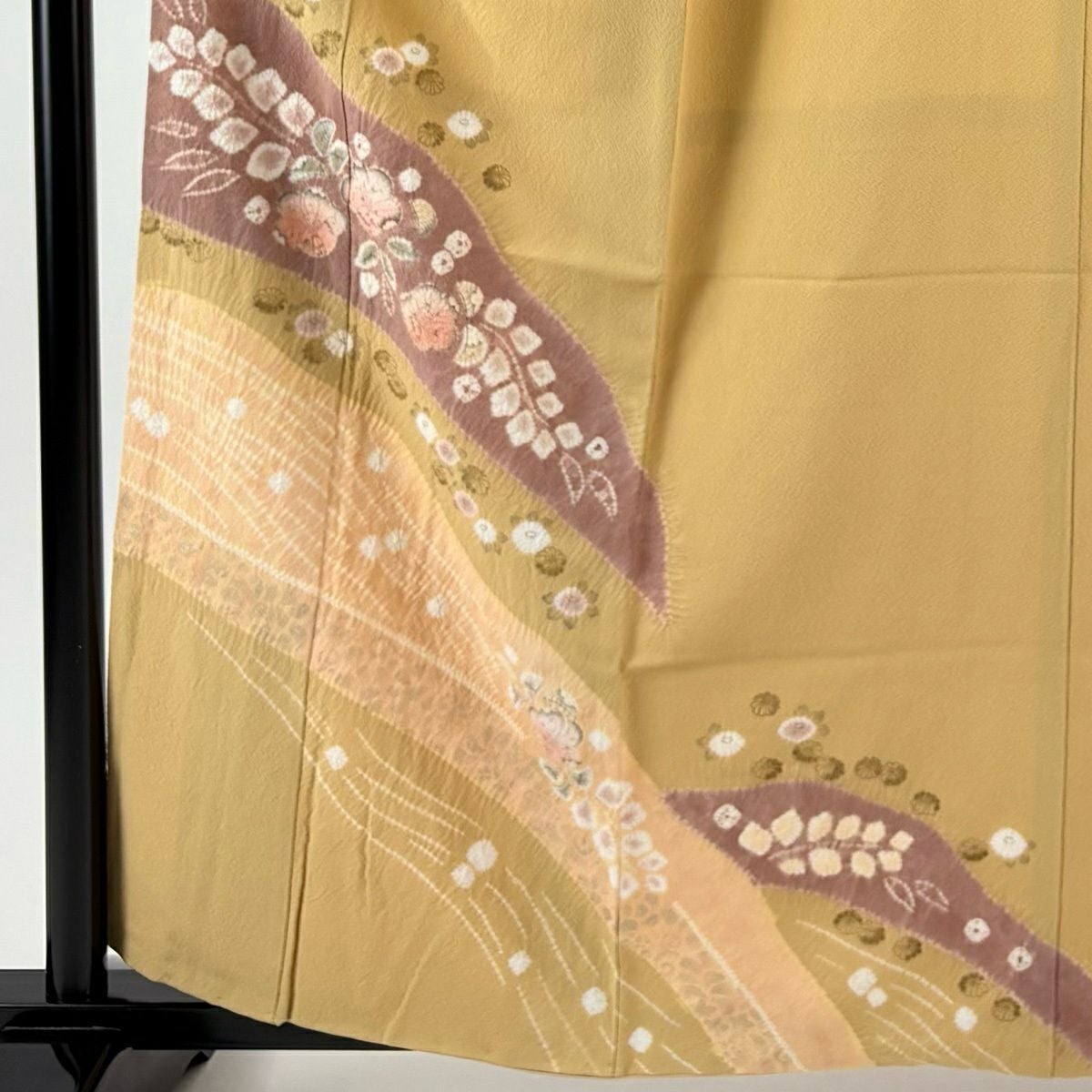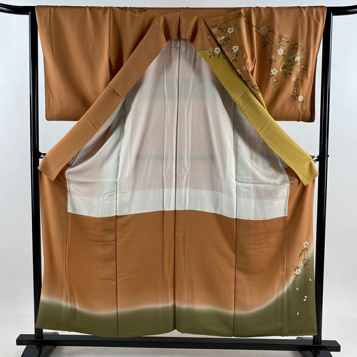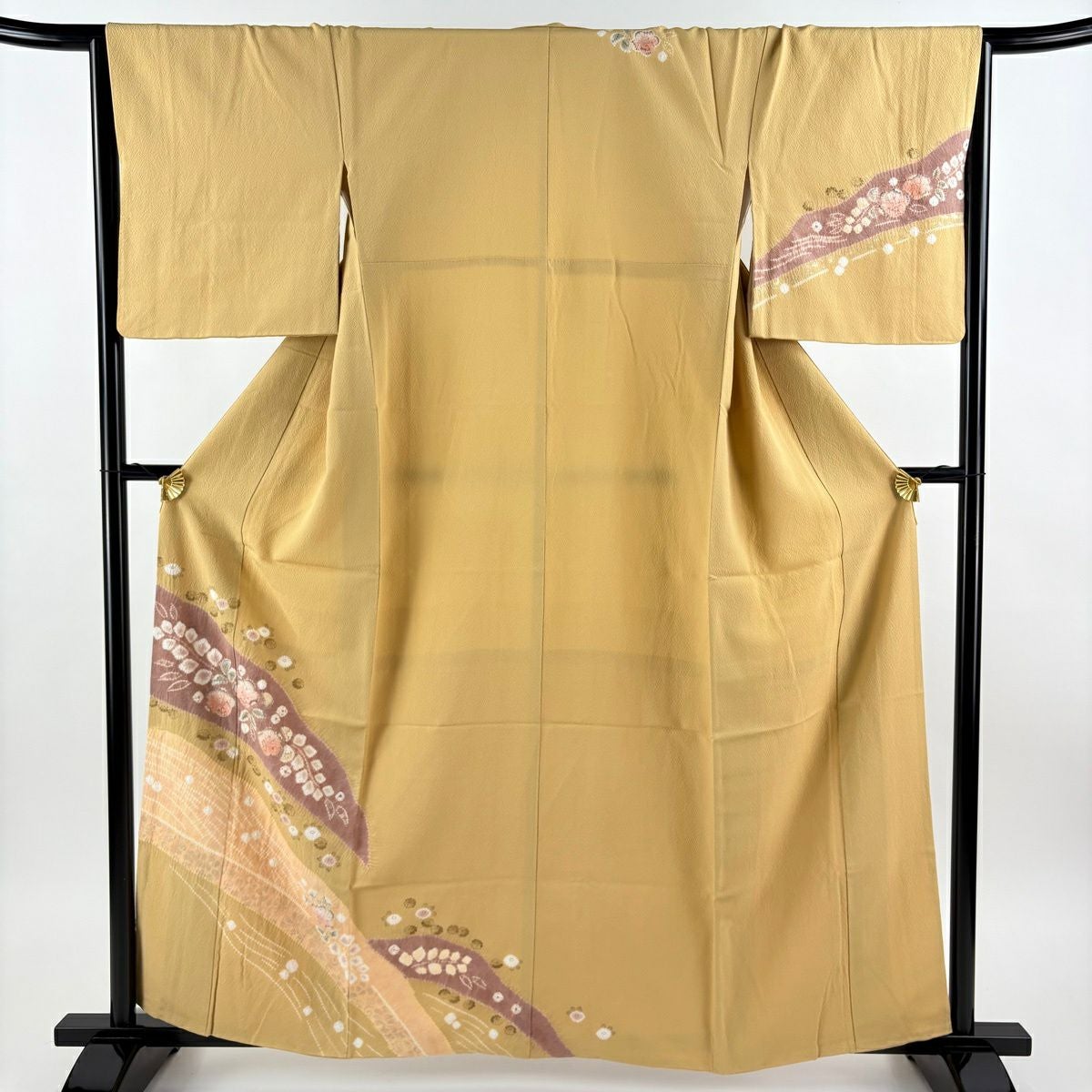 【美品】 訪問着 身丈164.5cm 裄丈64cm M 袷 紬地 草花 染め分け ベージュ 正絹 秀品