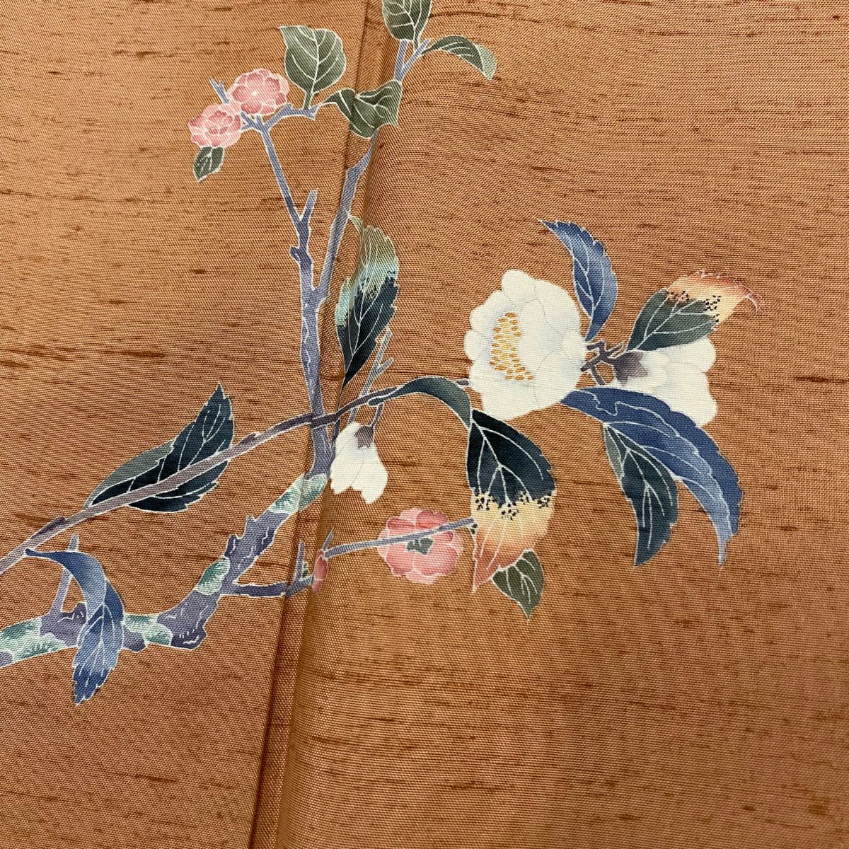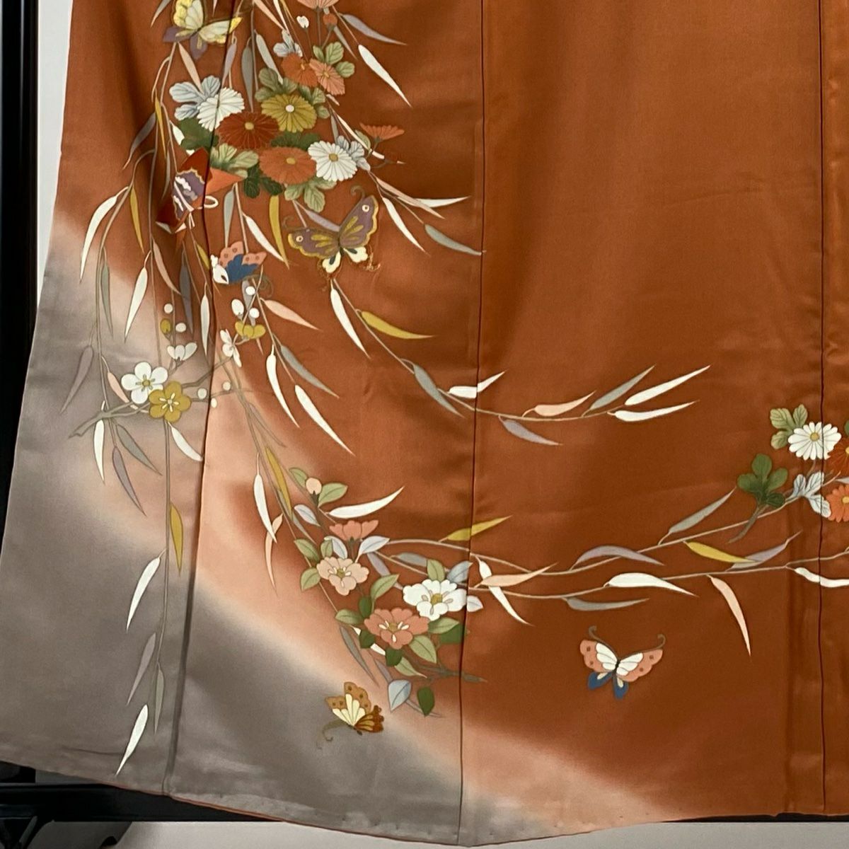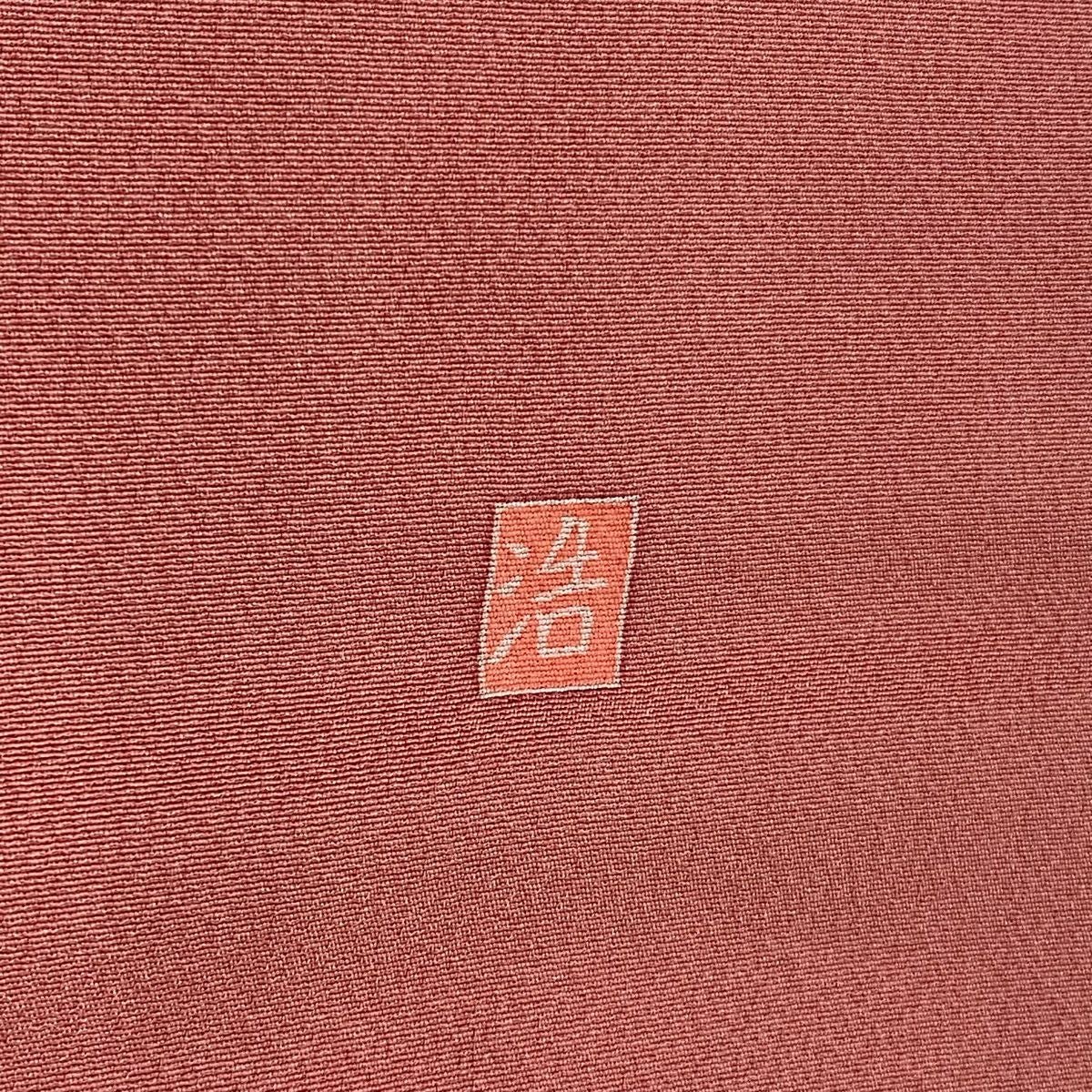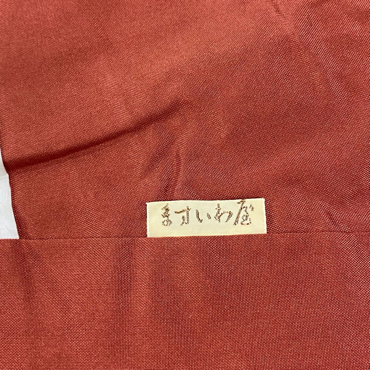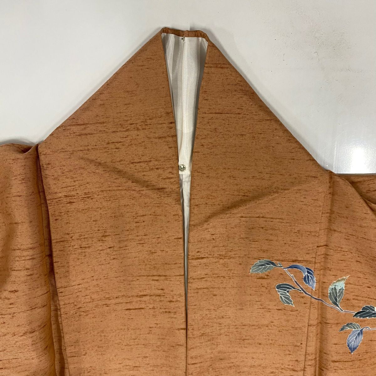 色無地 身丈156.5cm 裄丈62cm S 袷 毎田仁郎 落款あり 地紋 オレンジ 正絹 秀品 一つ紋