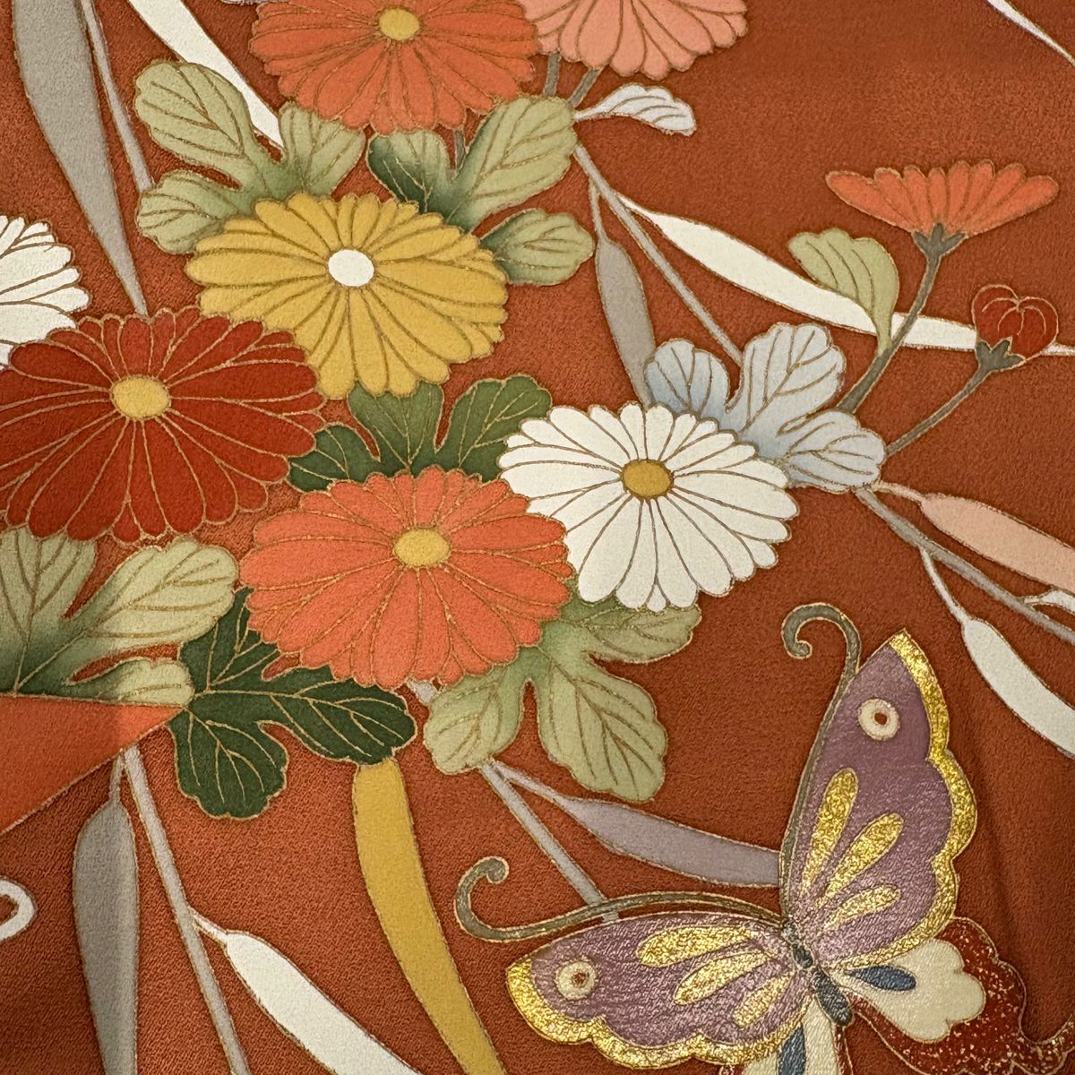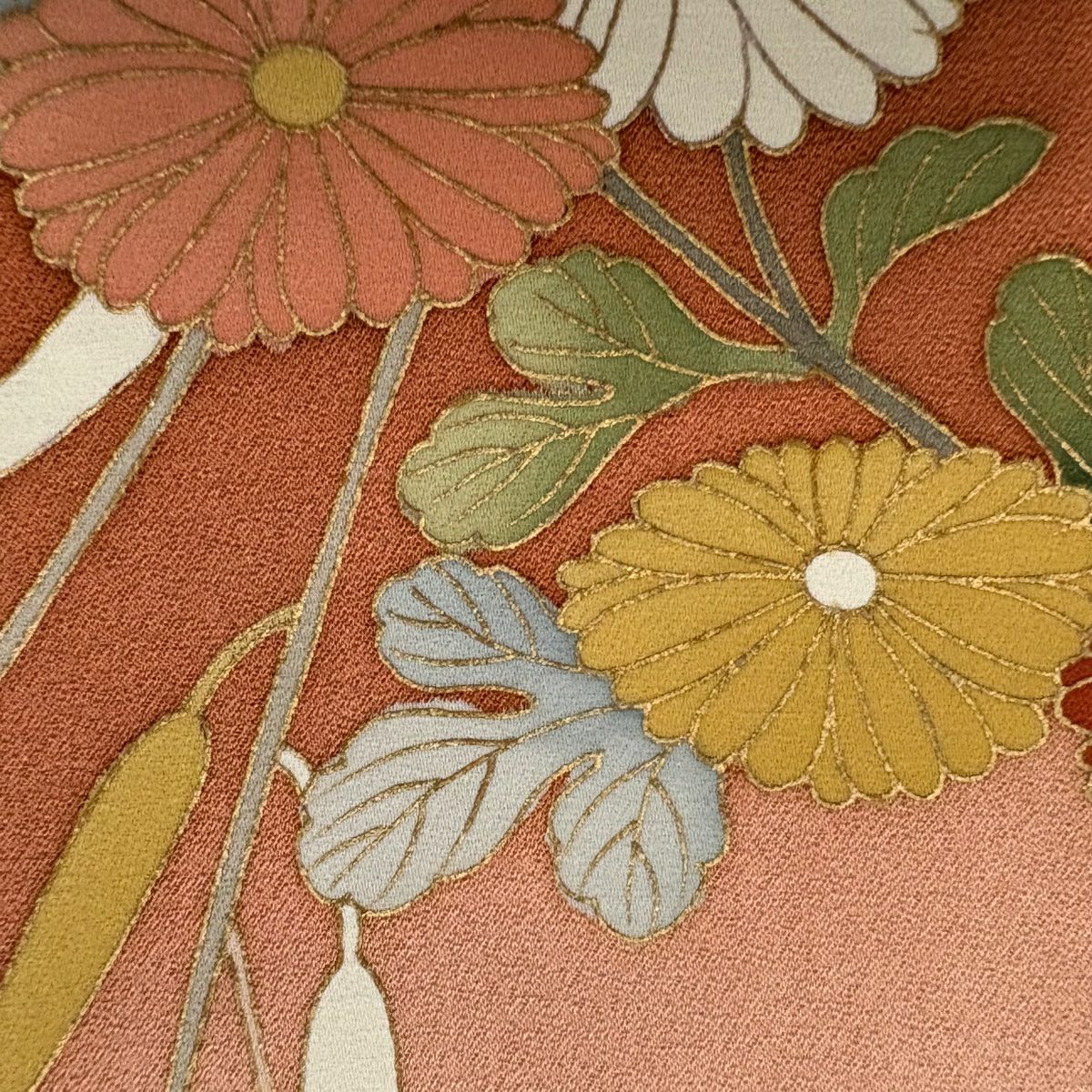 【美品】 訪問着 身丈168.5cm 裄丈66cm M 袷 秋草 鴛鴦 金糸 金彩 薄オレンジ 正絹 秀品