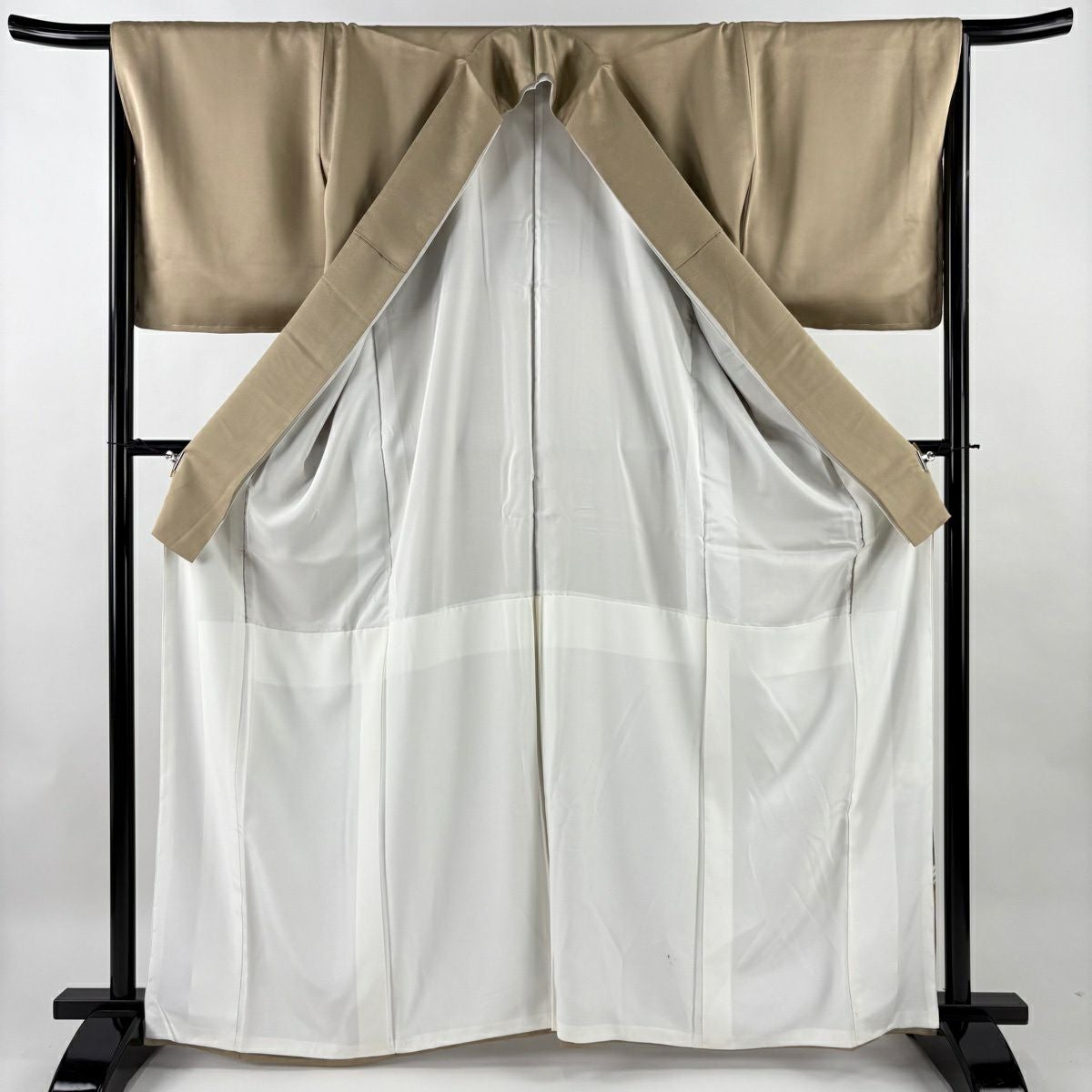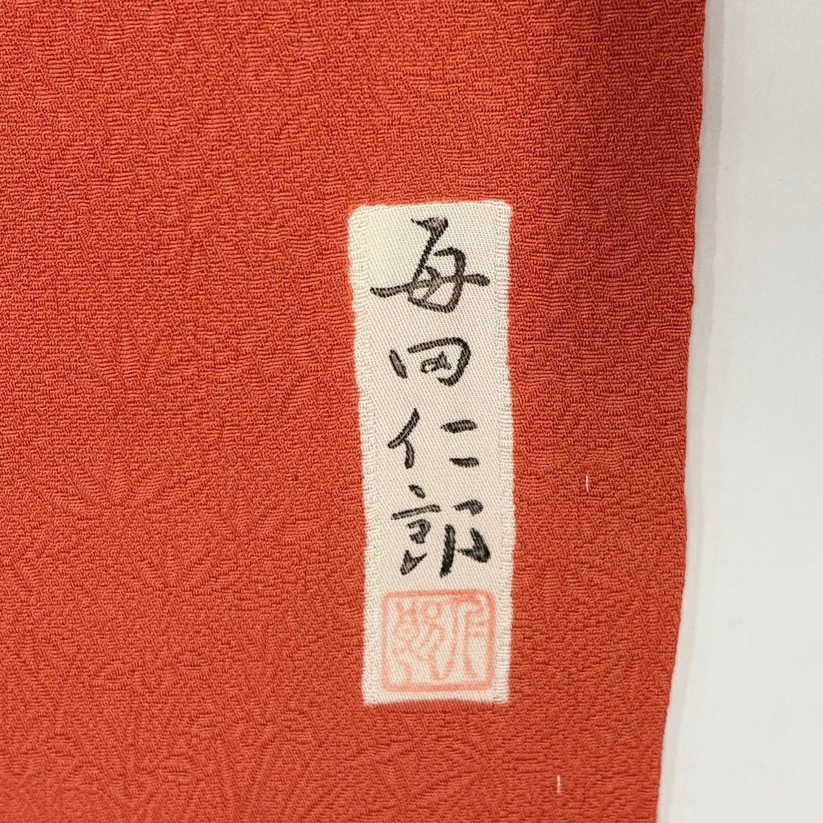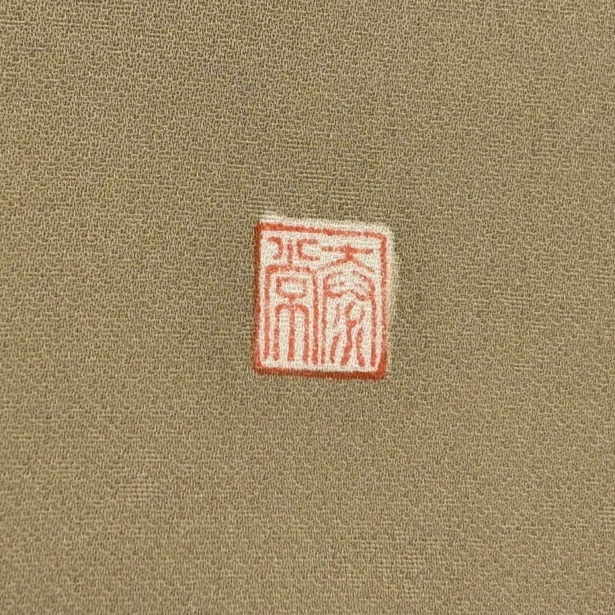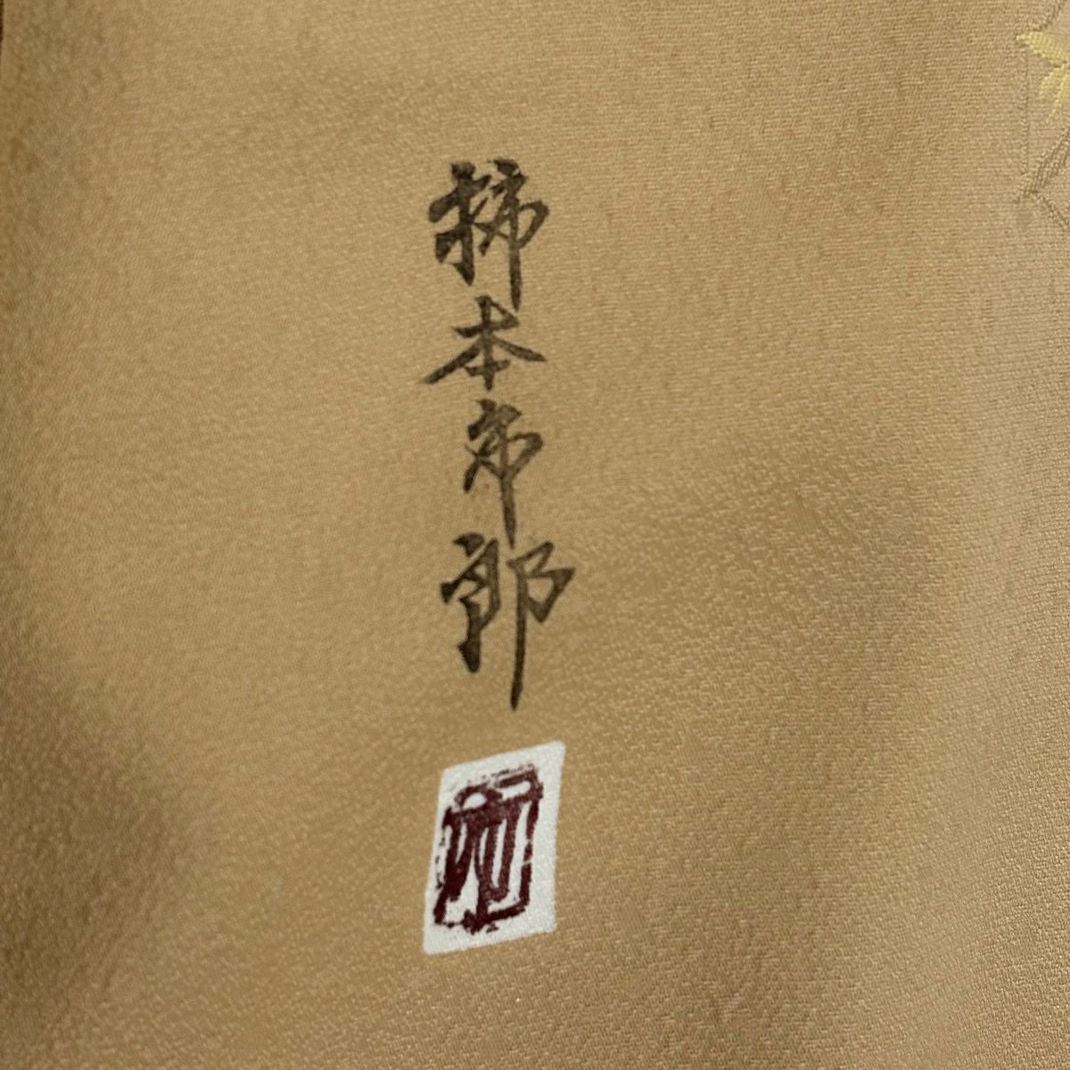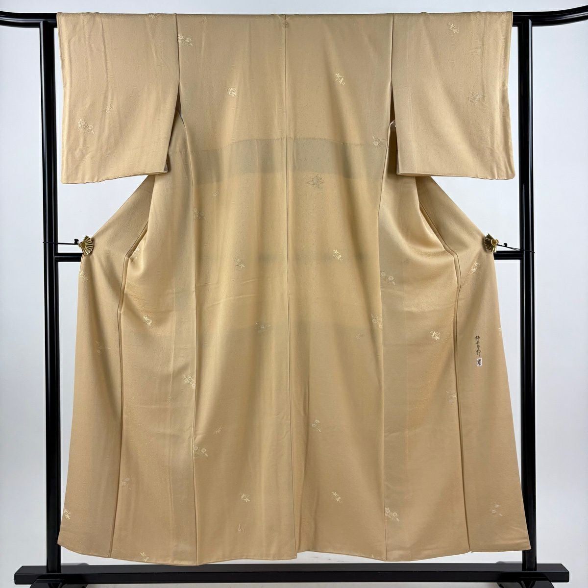 【美品】小紋 身丈154.5cm 裄丈62cm S 袷 柿本市郎 落款あり 草花 地紋 薄茶色 正絹 秀品