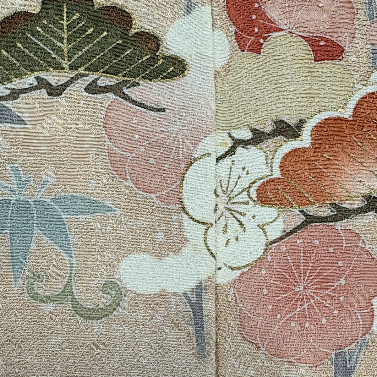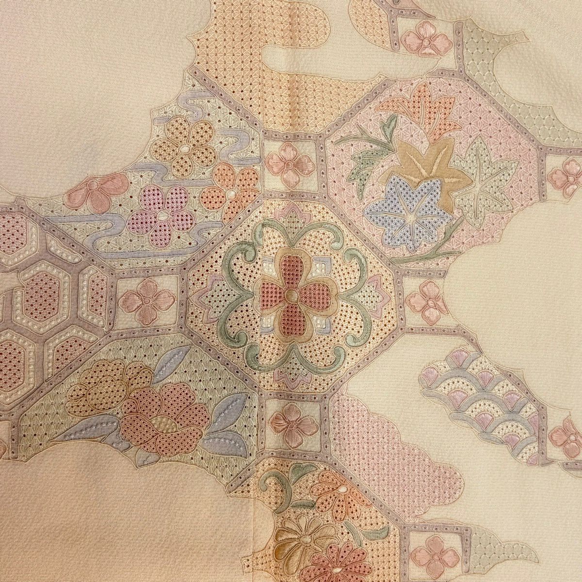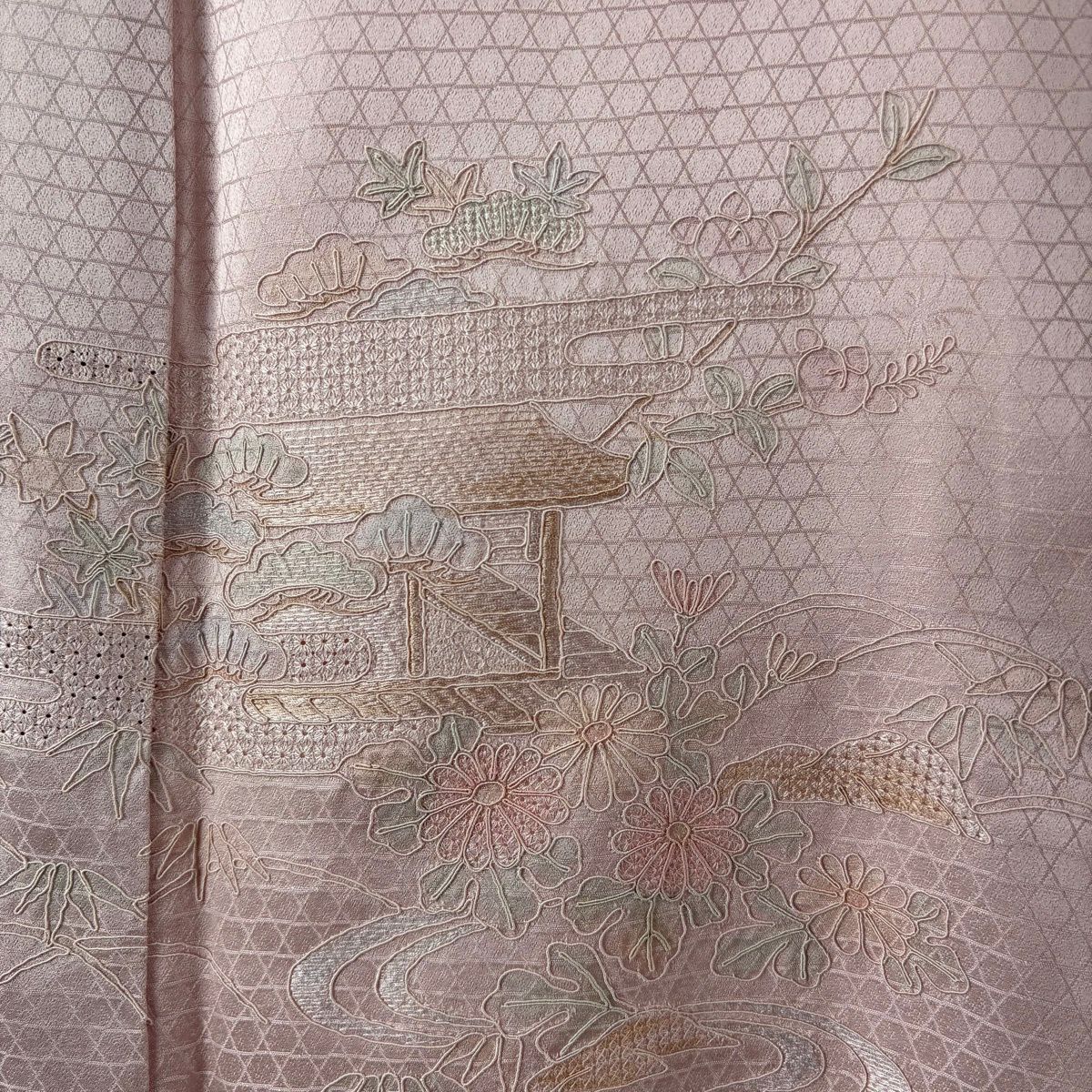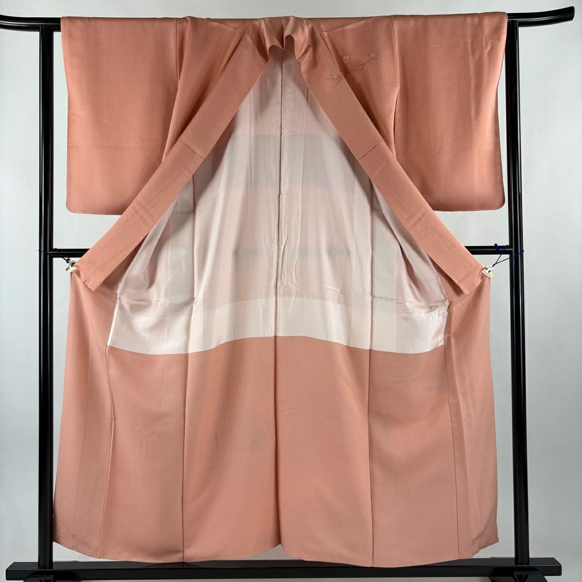訪問着 身丈163.5cm 裄丈64cm M 袷 草花 丸紋 刺繍 金彩 ピンクベージュ 正絹 秀品