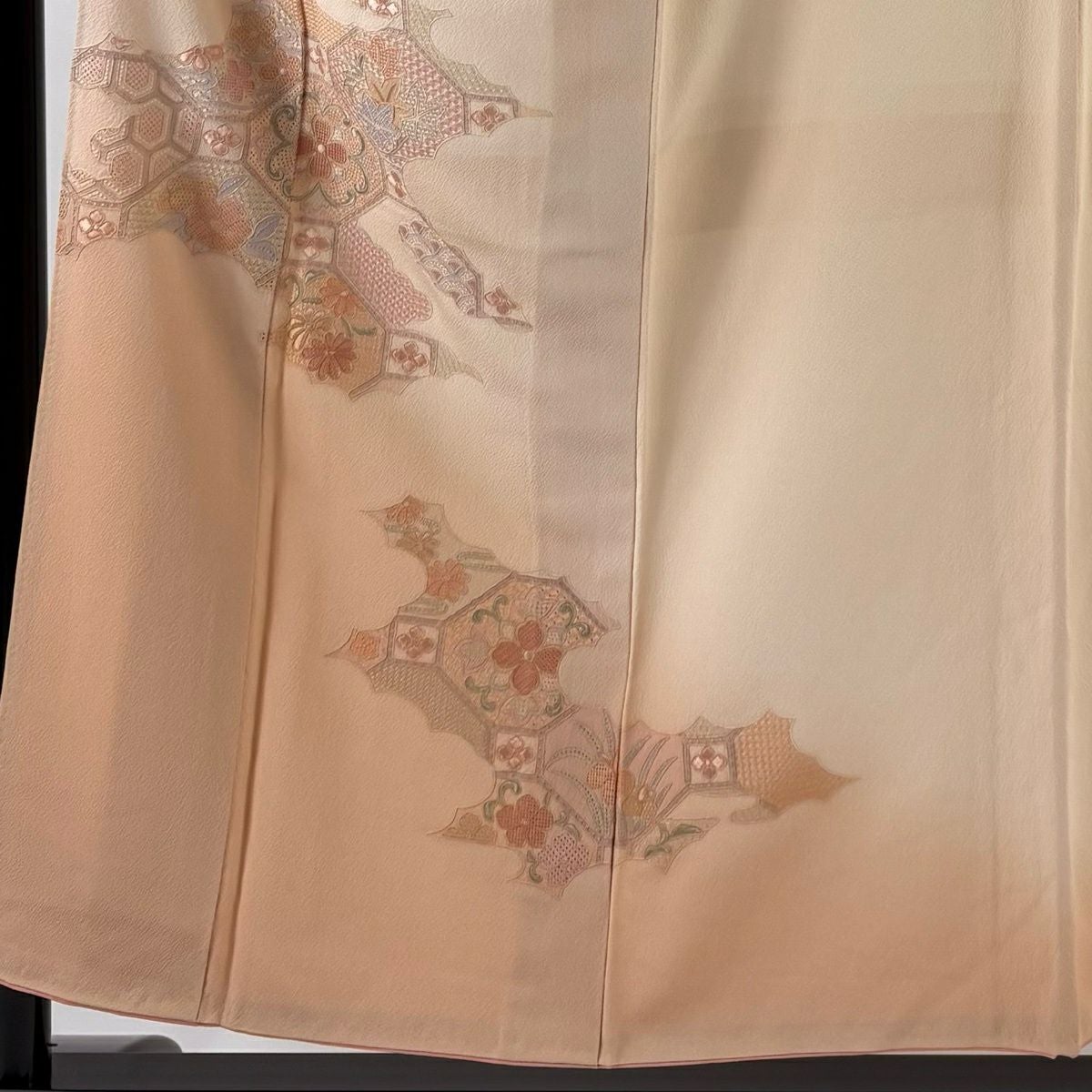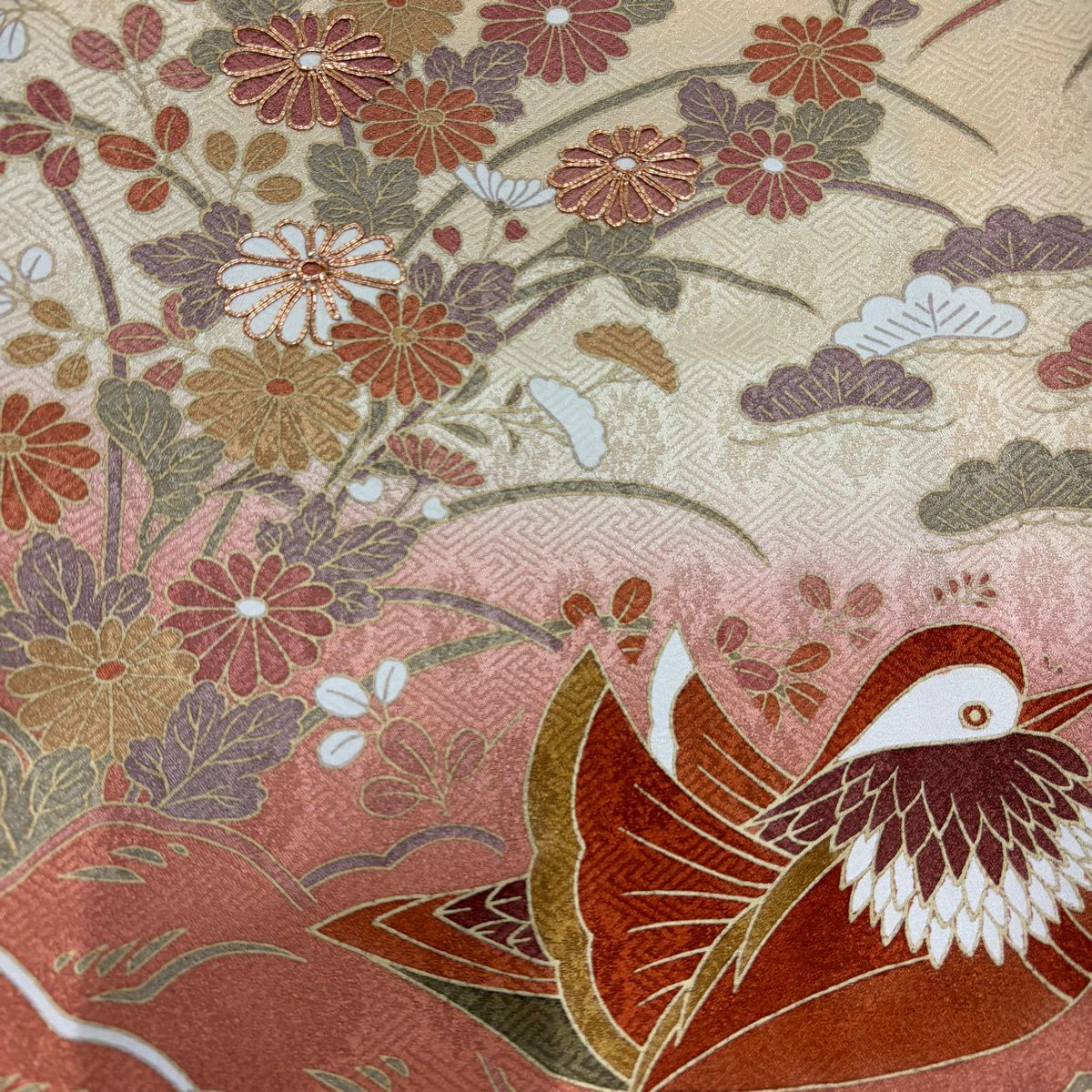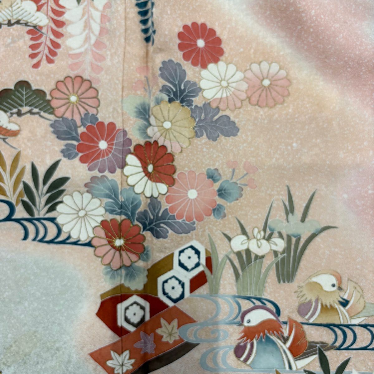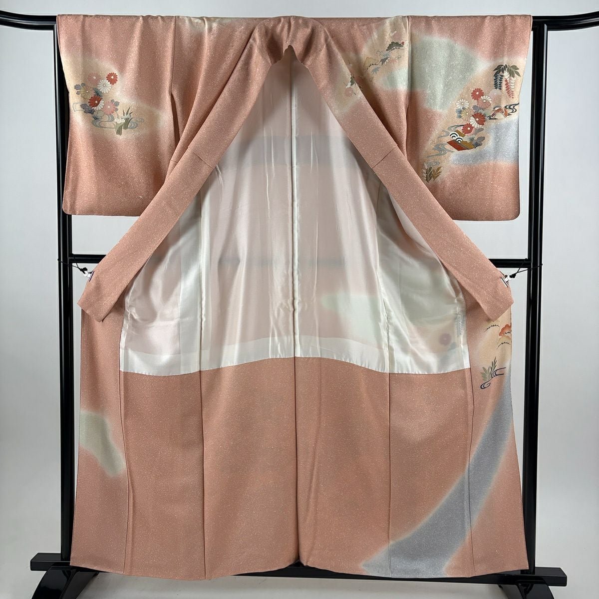 訪問着 身丈160.5cm 裄丈64cm M 袷 菊 鴛鴦 金彩 ぼかし ピンクベージュ 正絹 秀品