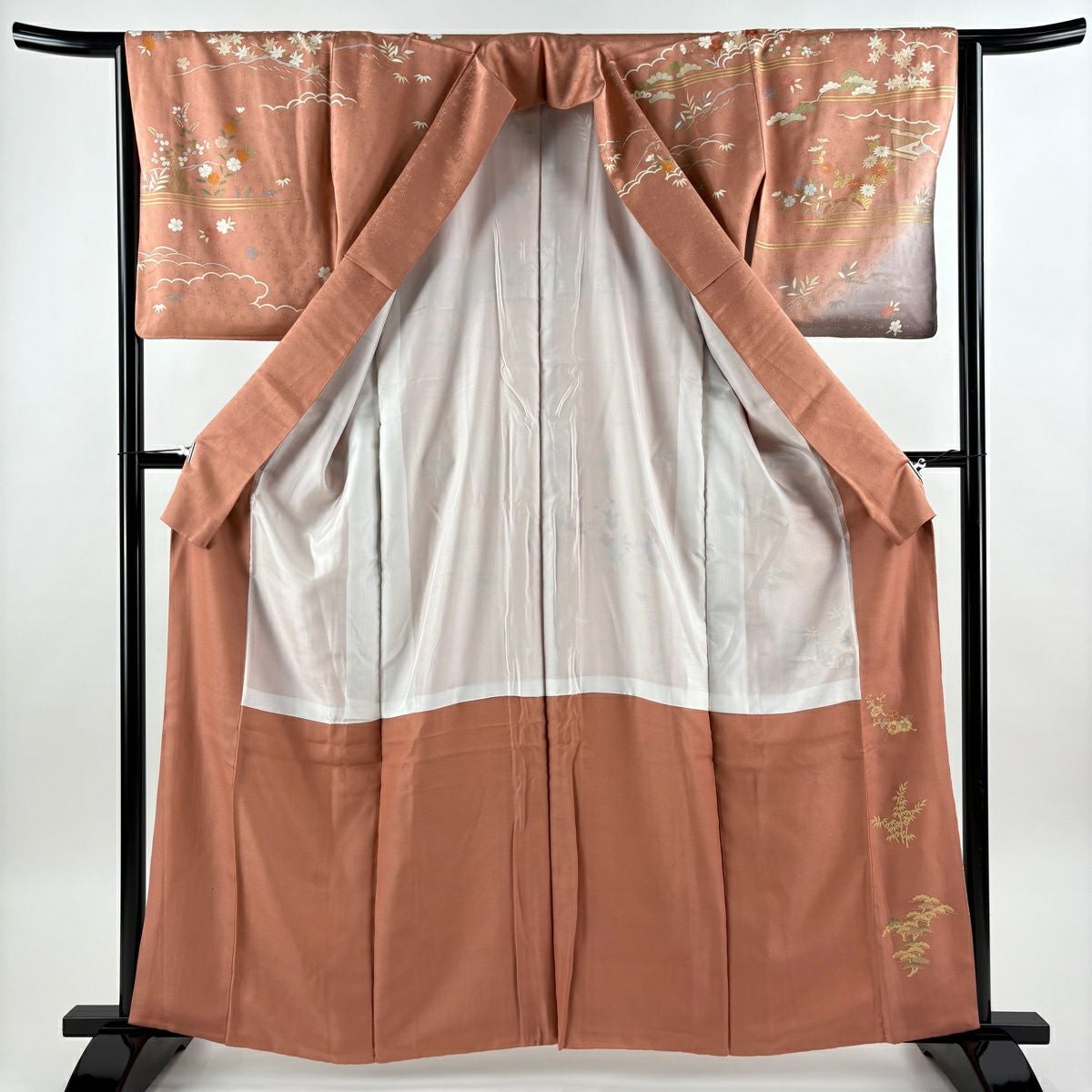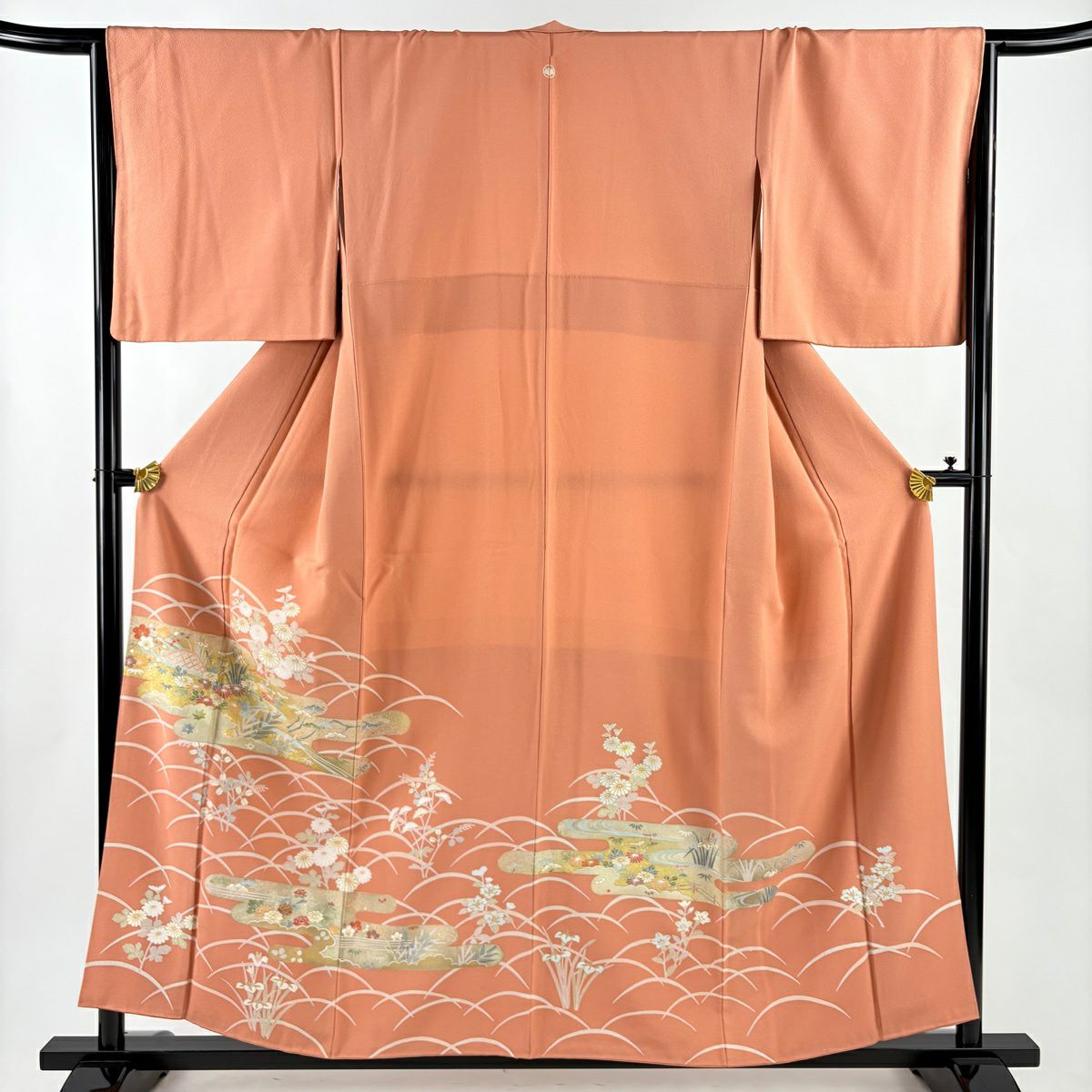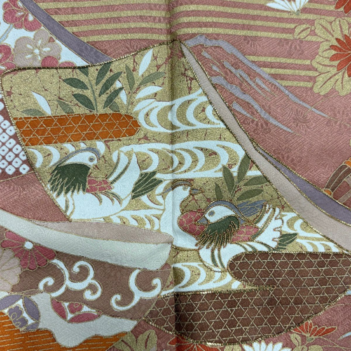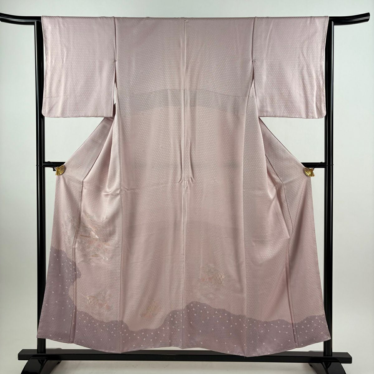 訪問着 身丈160.5cm 裄丈64cm M 袷 菊 鴛鴦 金彩 ぼかし ピンクベージュ 正絹 秀品