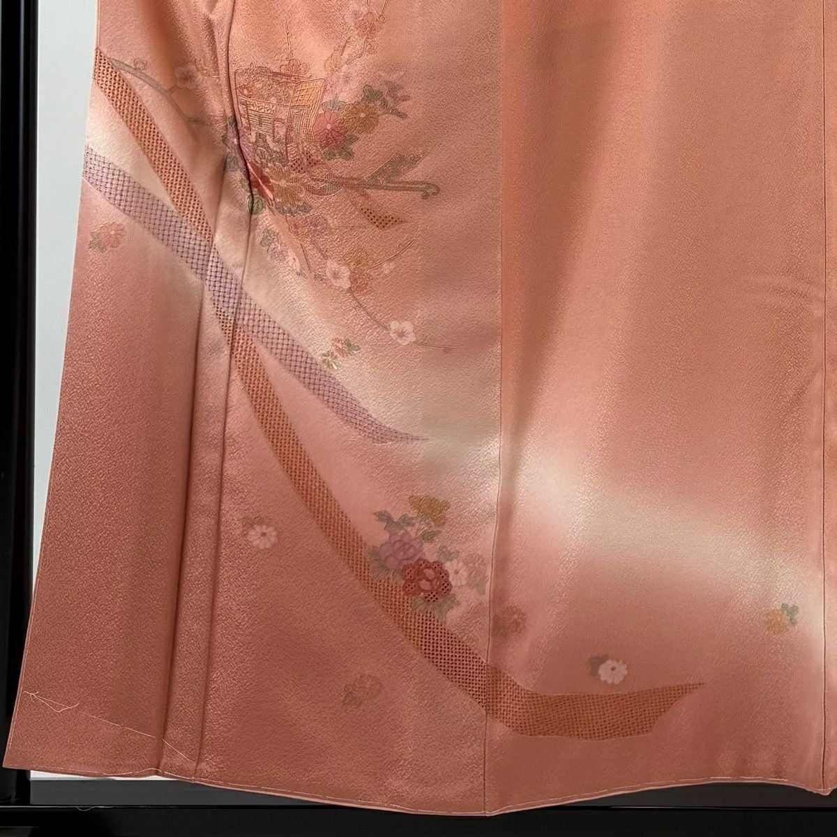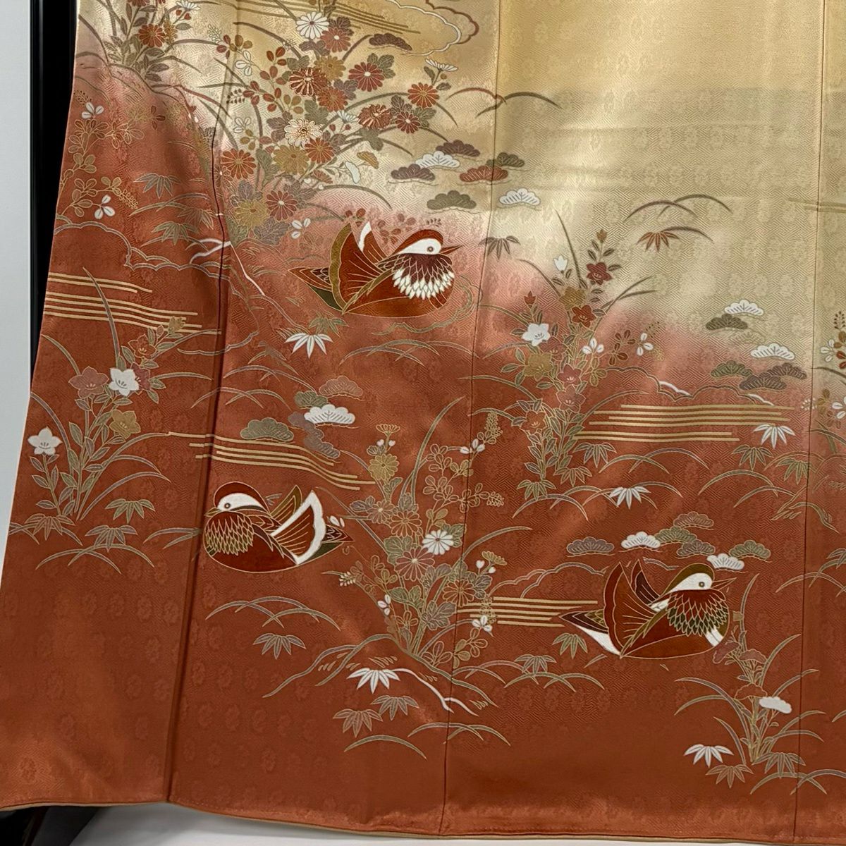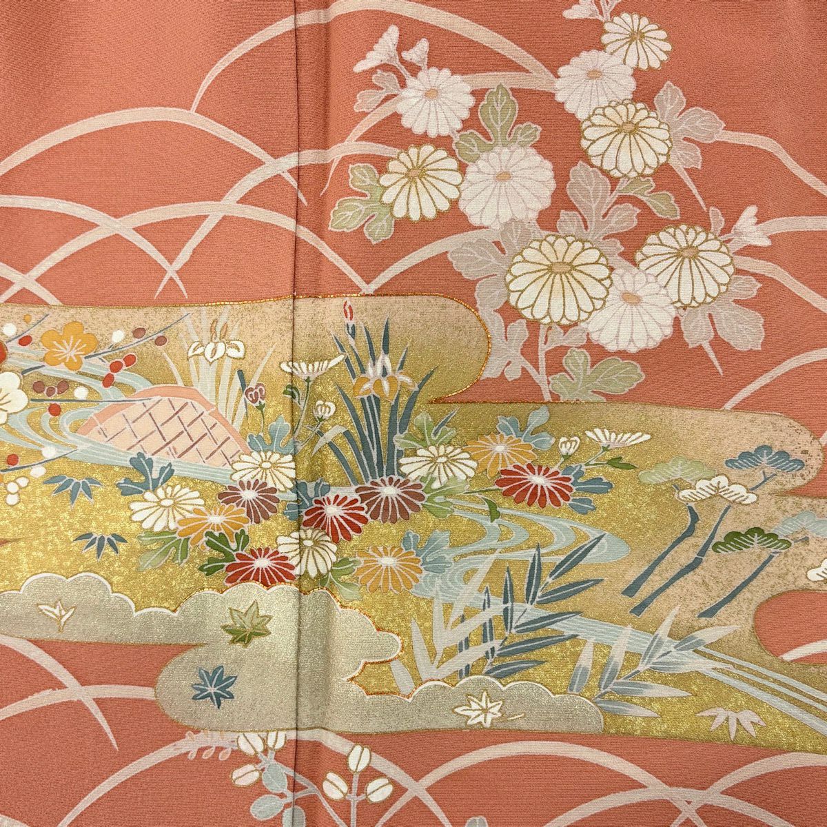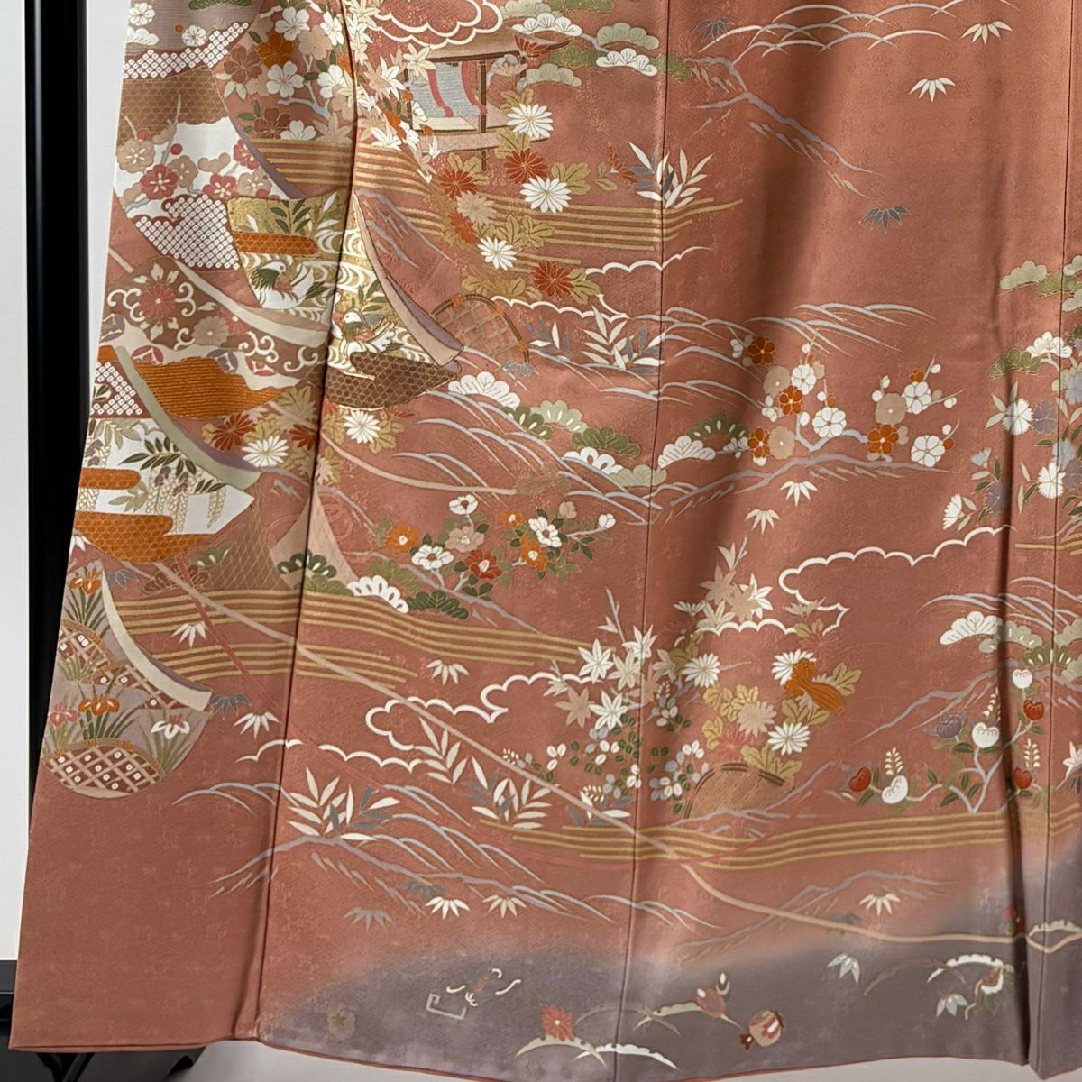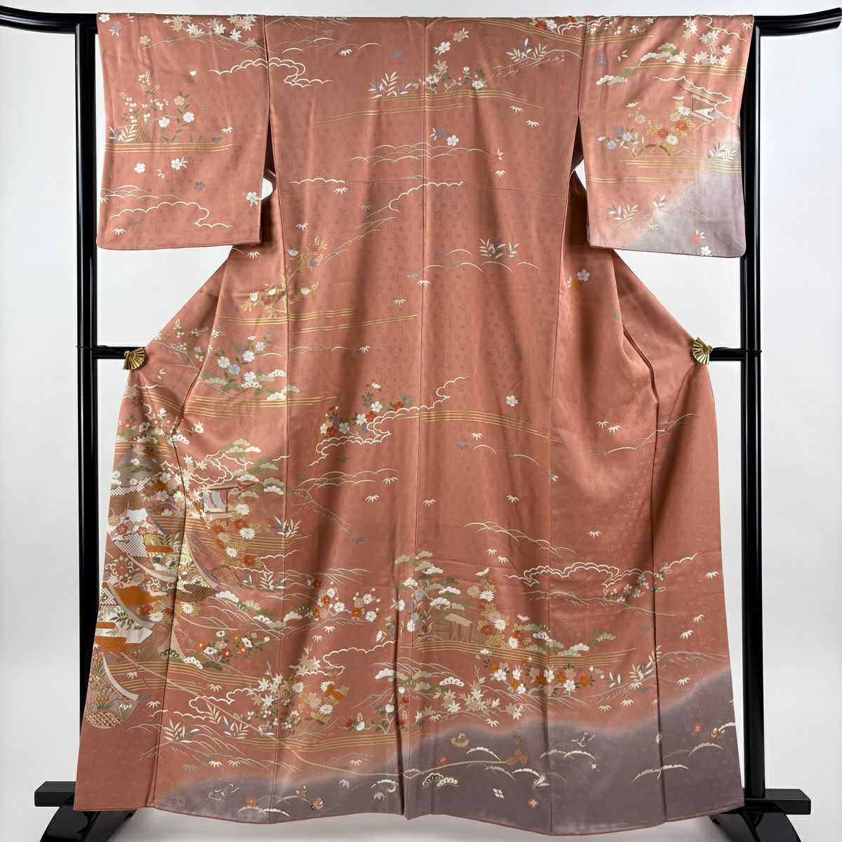 訪問着 身丈160.5cm 裄丈64cm M 袷 菊 鴛鴦 金彩 ぼかし ピンクベージュ 正絹 秀品