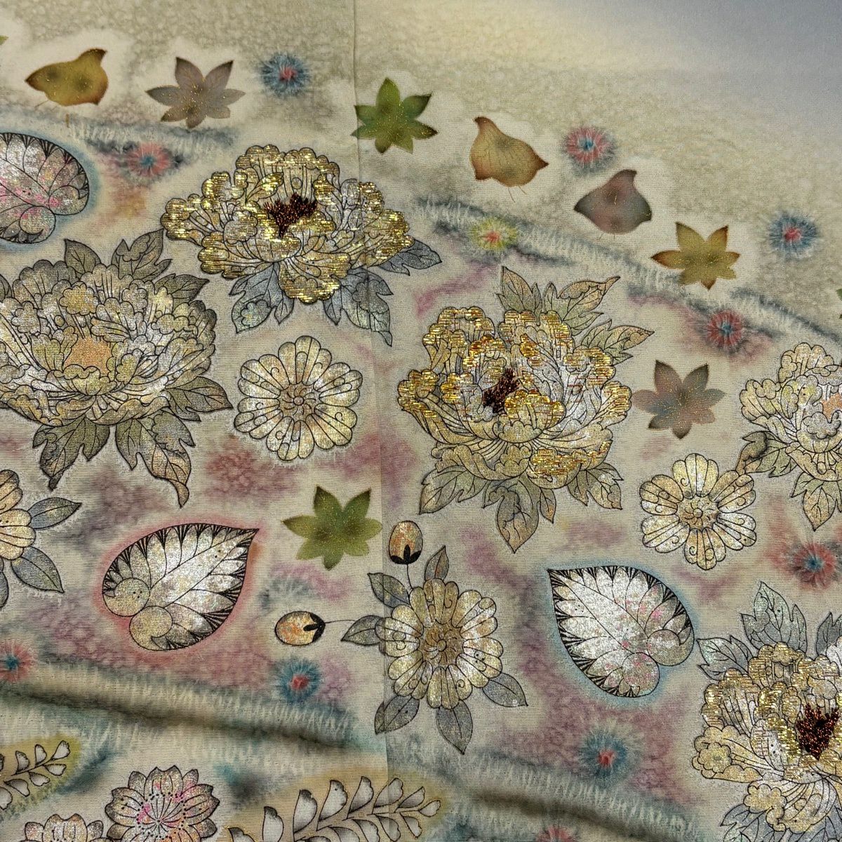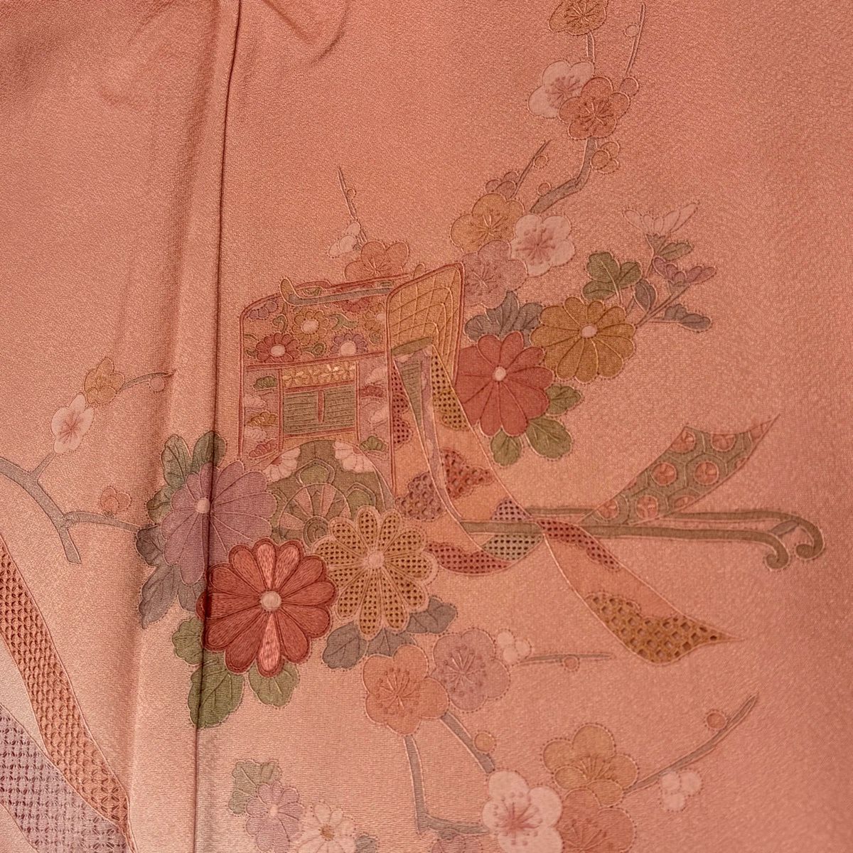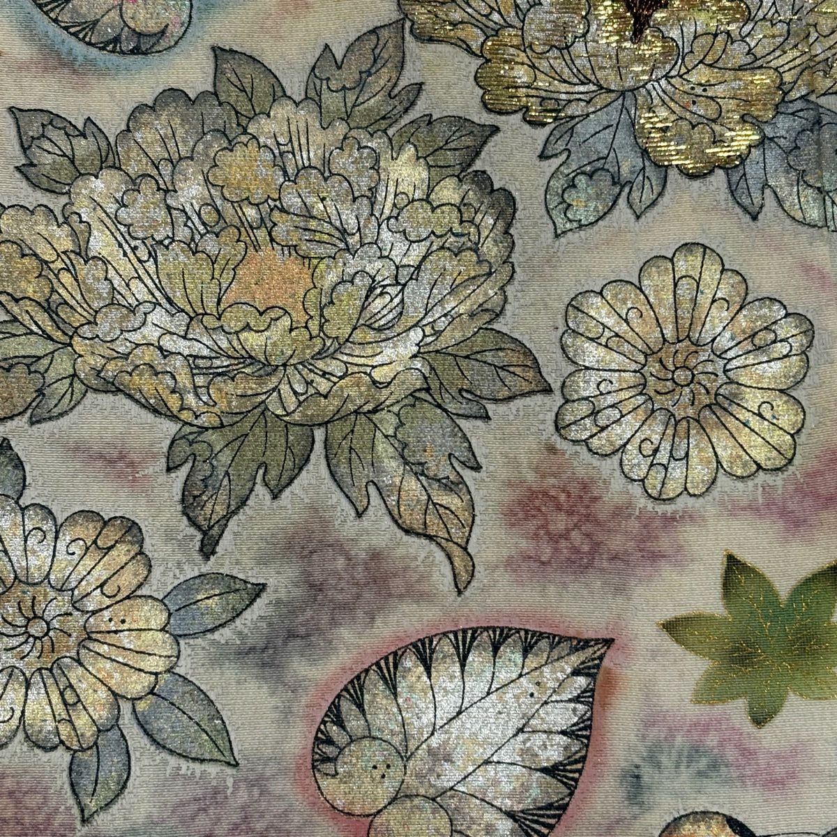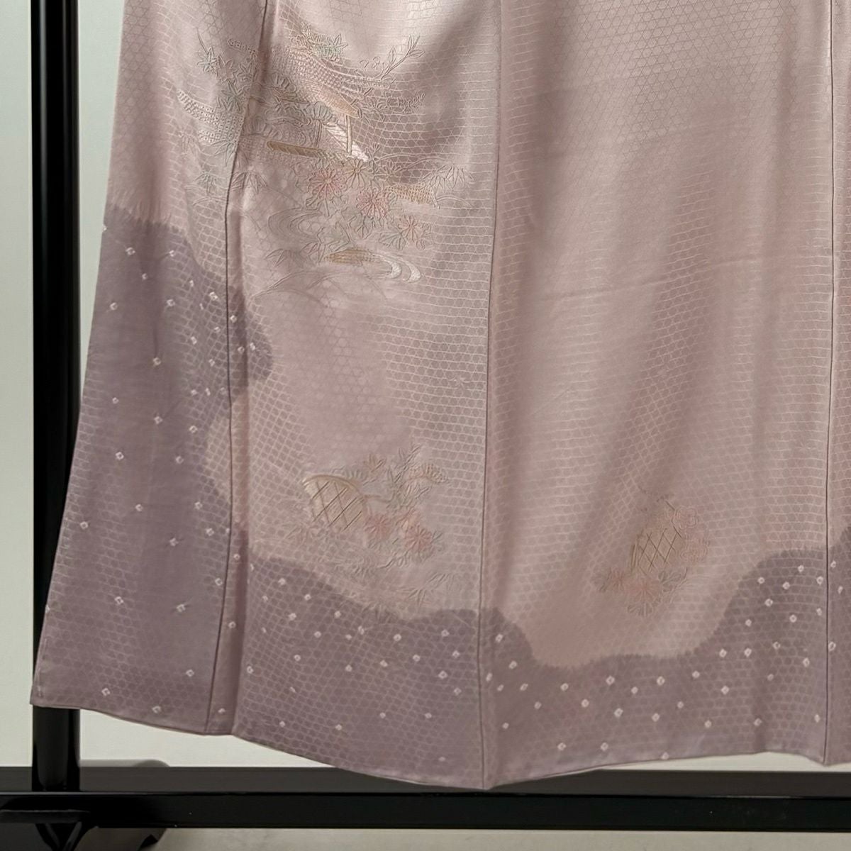 訪問着 身丈160.5cm 裄丈64cm M 袷 菊 鴛鴦 金彩 ぼかし ピンクベージュ 正絹 秀品