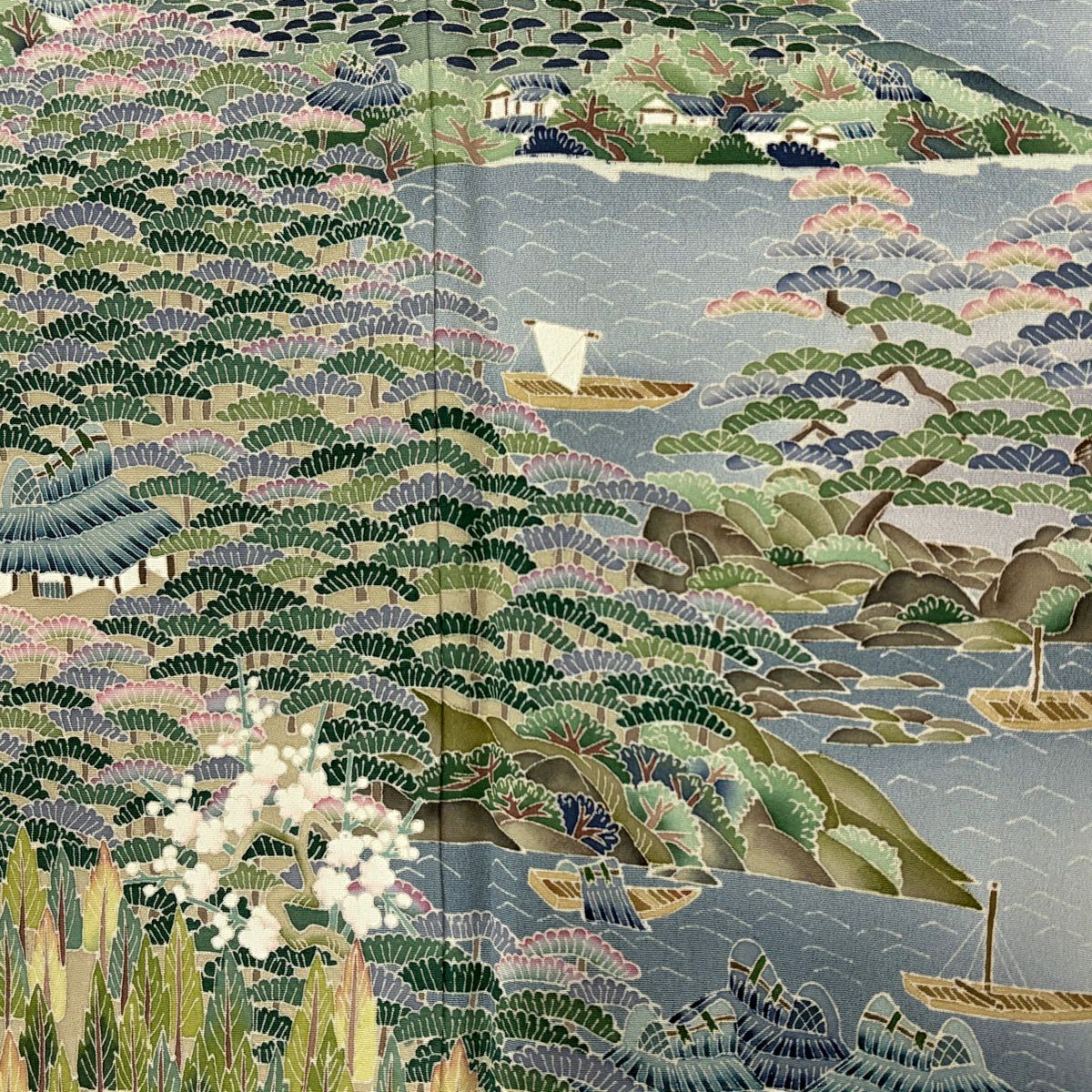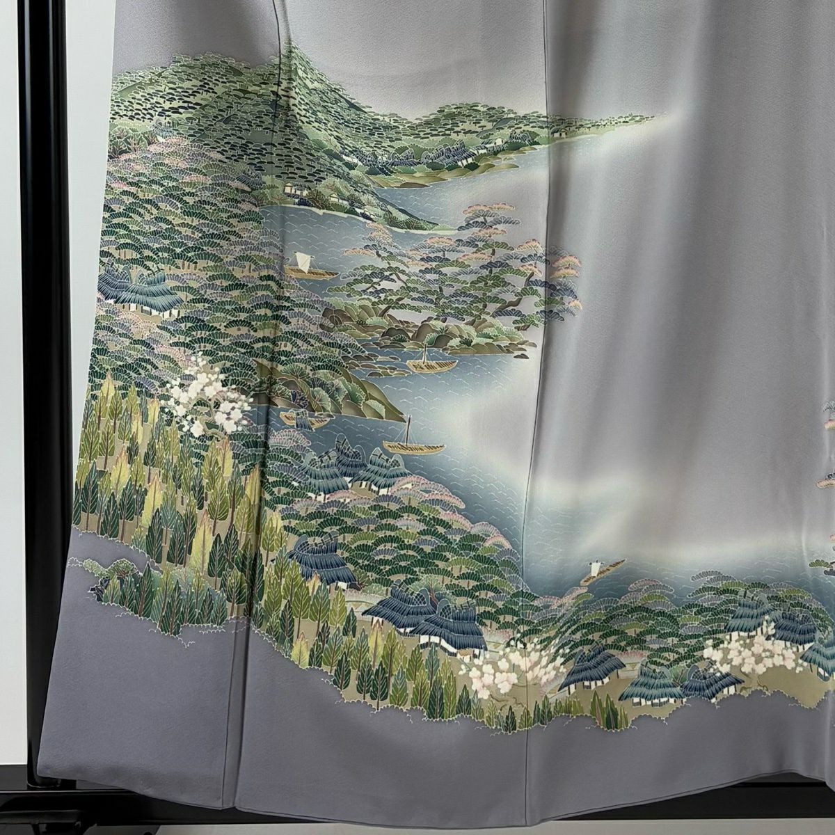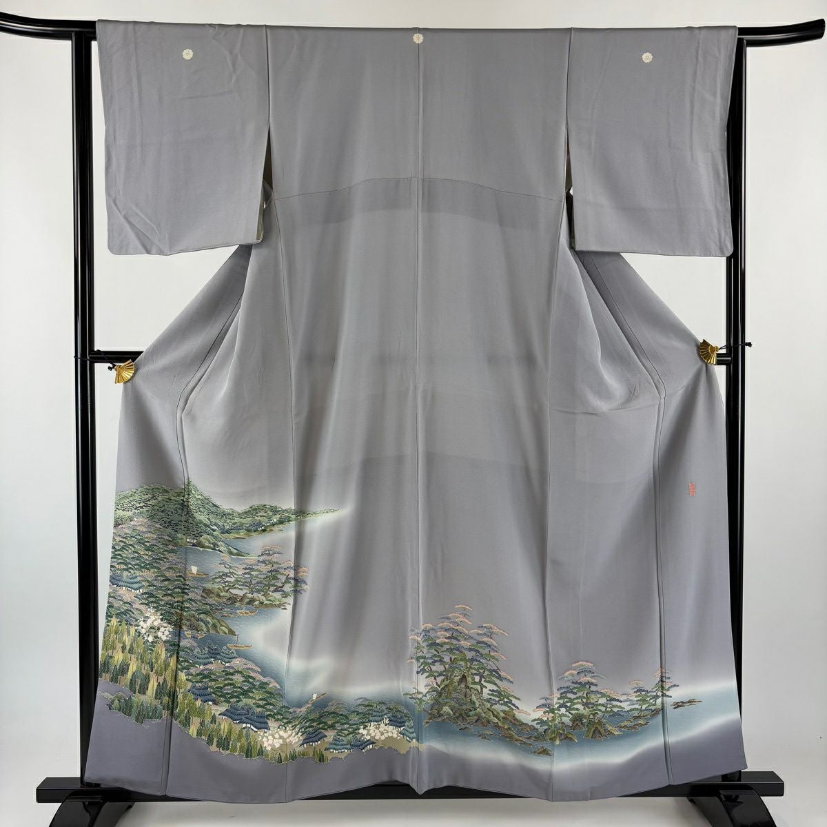 色留袖 身丈159cm 裄丈63cm S 袷 落款あり 水辺の風景 松梅 ぼかし 灰色 正絹 秀品 五つ紋