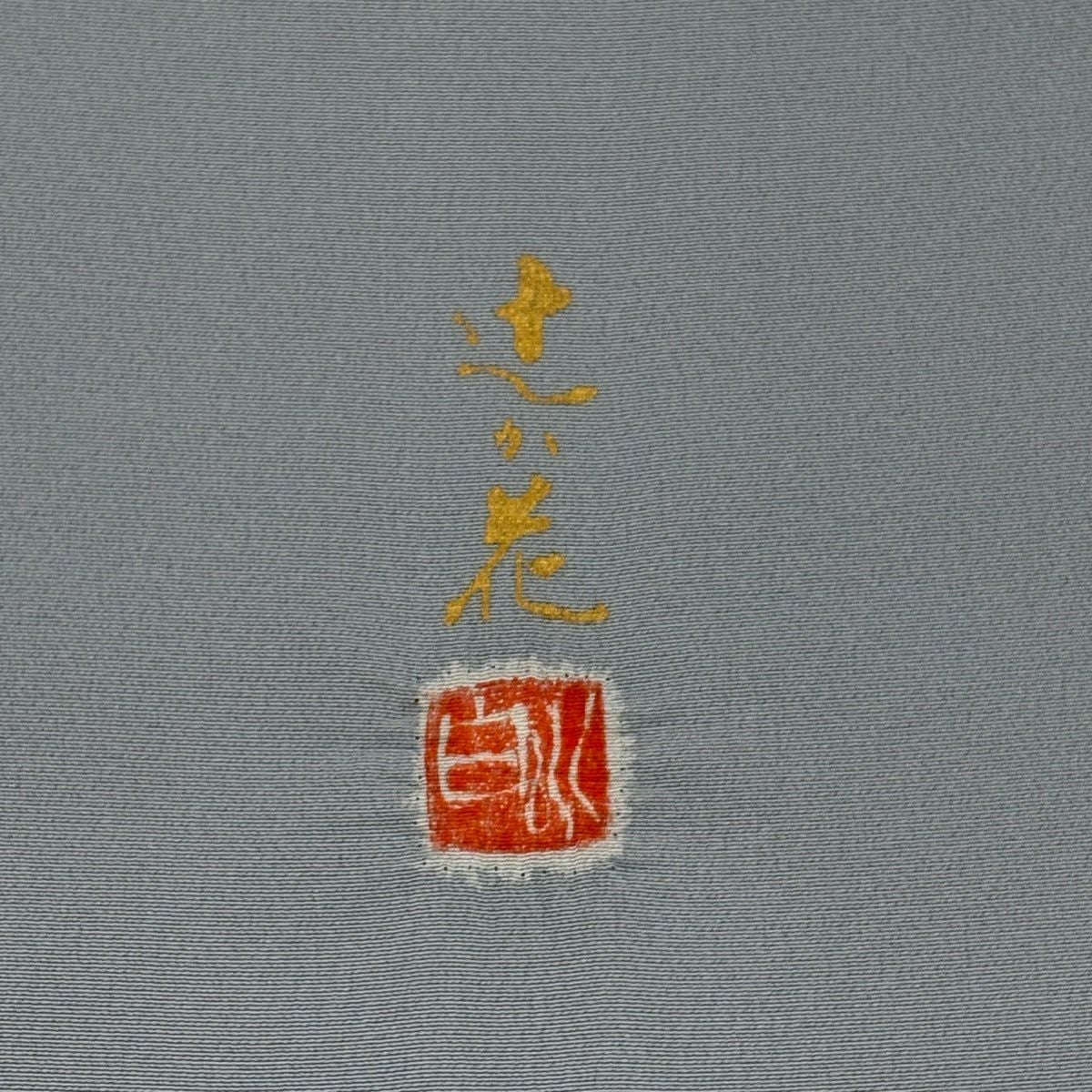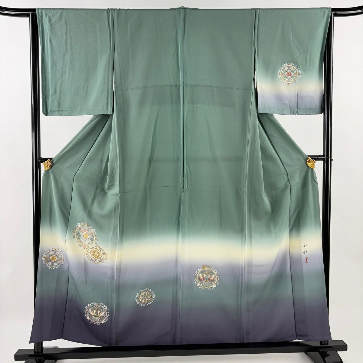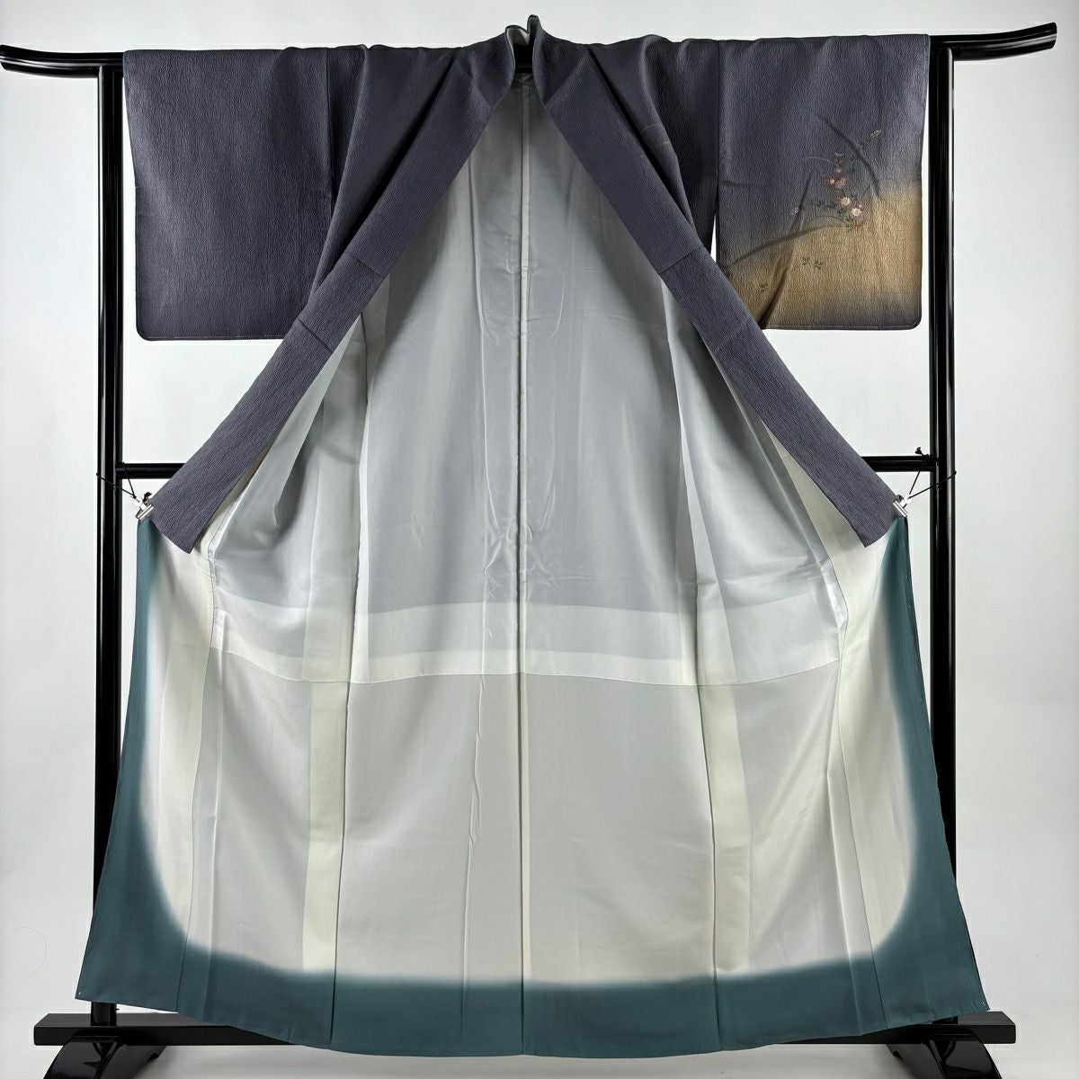 訪問着 身丈161cm 裄丈65.5cm M 袷 落款あり 鴛鴦 枝花 ぼかし 染分け 青灰色 正絹 秀品