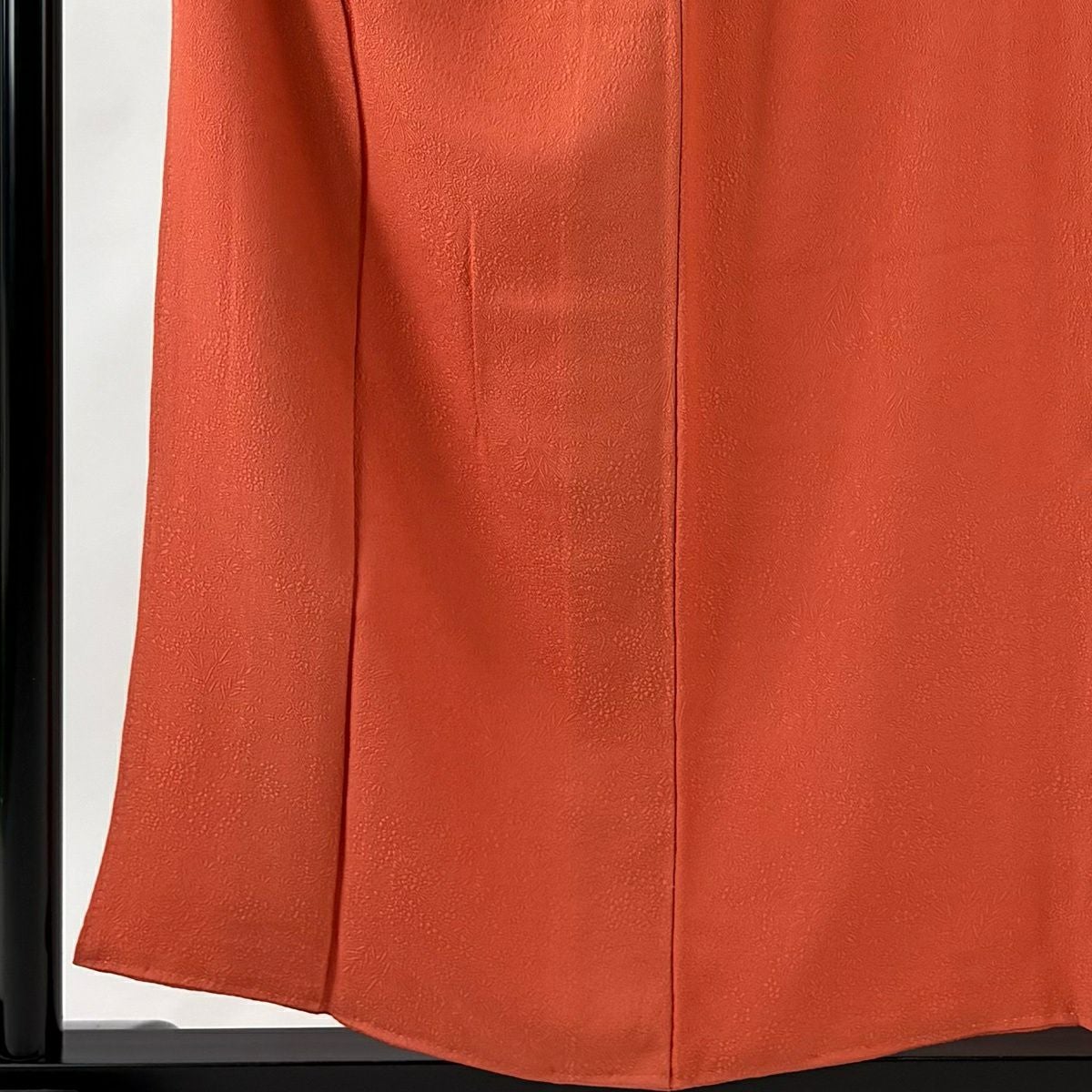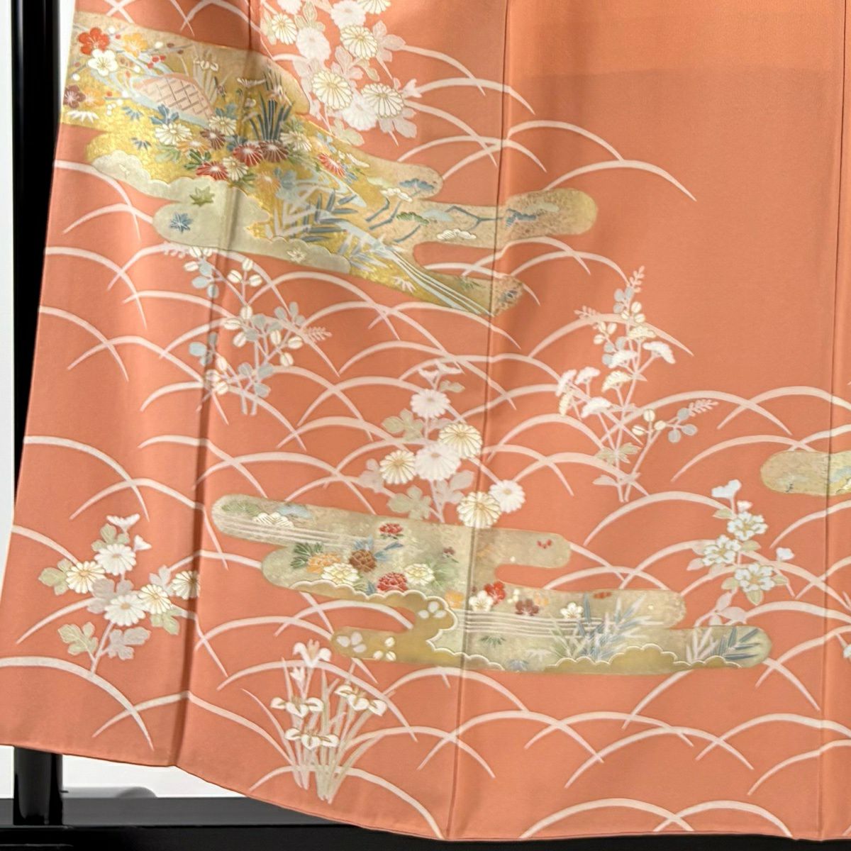 訪問着 身丈157.5cm 裄丈66cm M 袷 鈴乃屋 椿 笹 金彩 染め分け 薄オレンジ 正絹 秀品