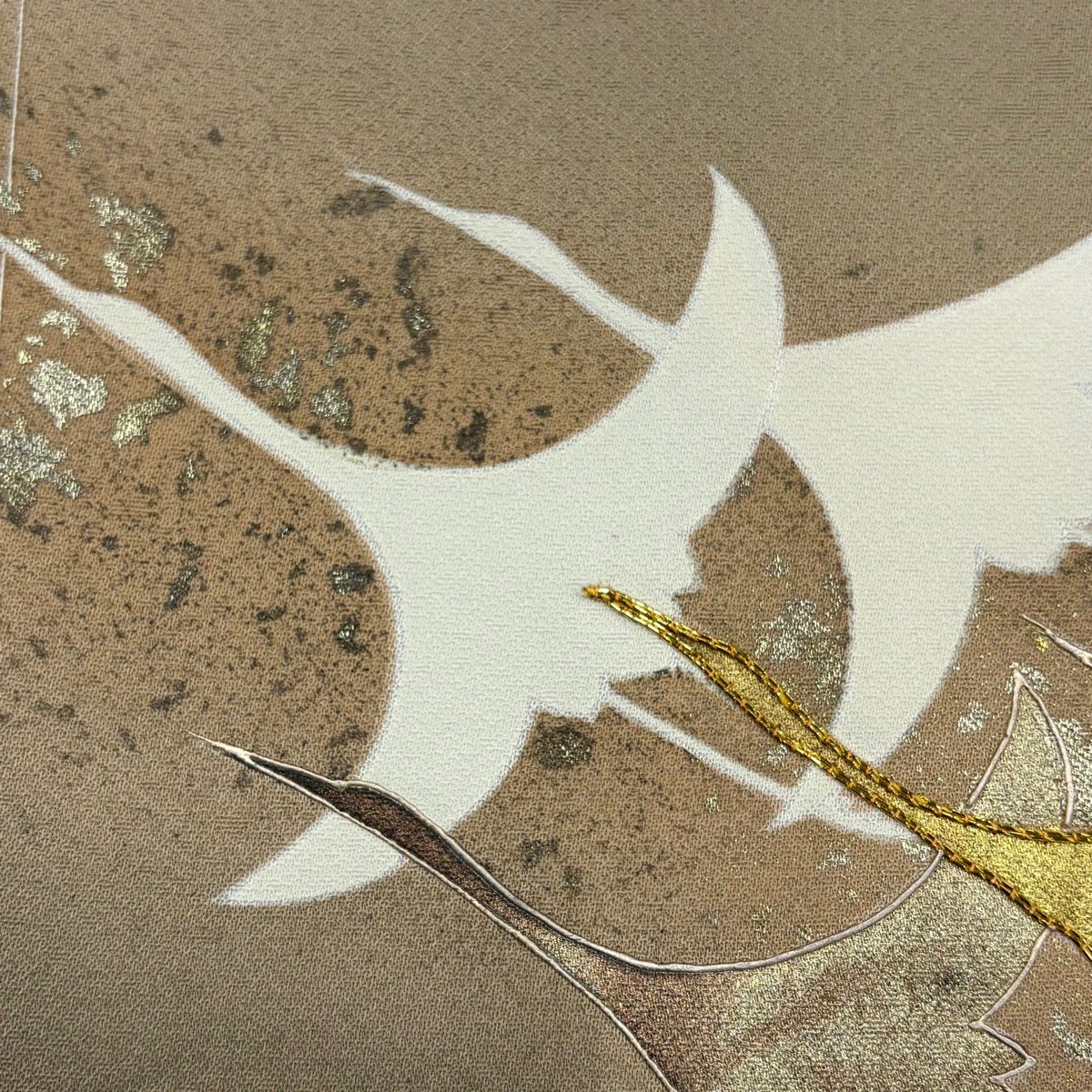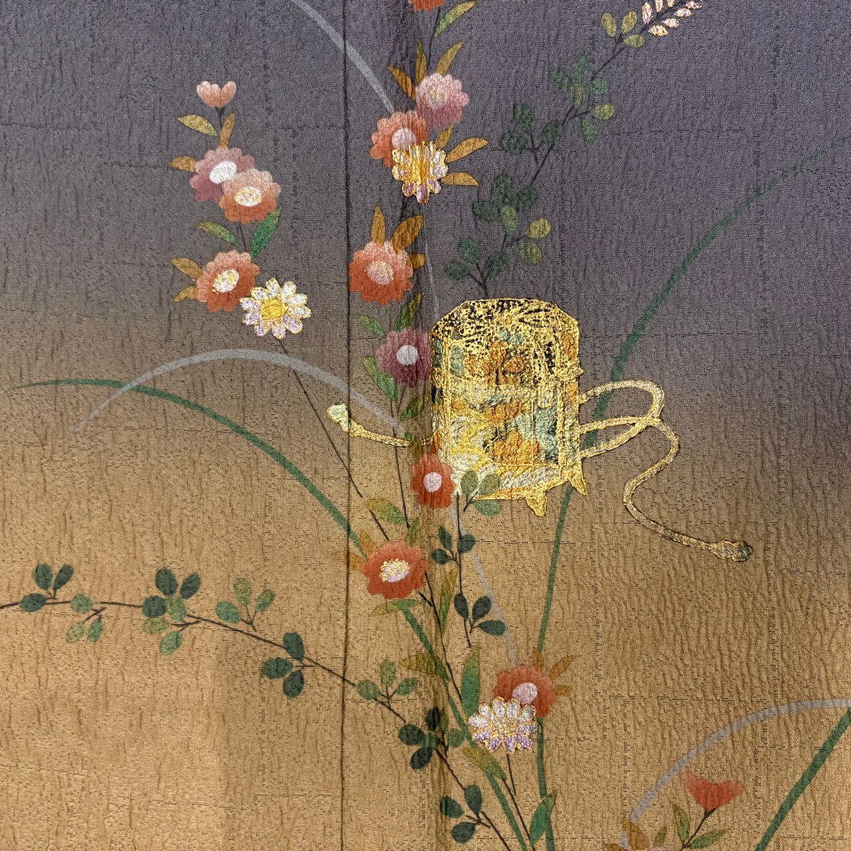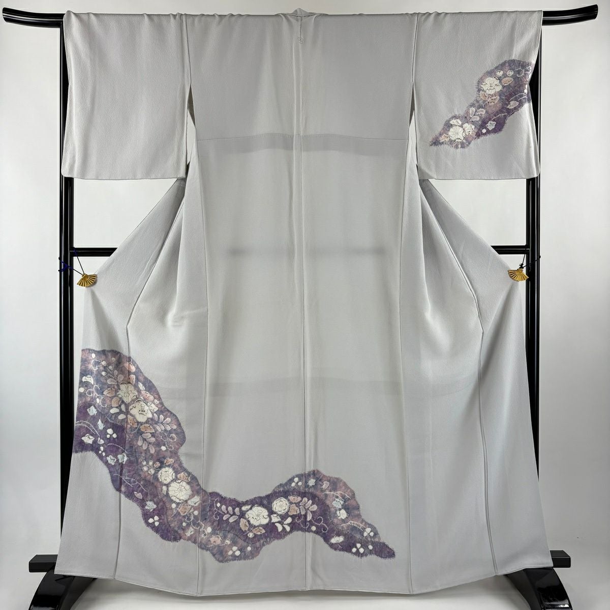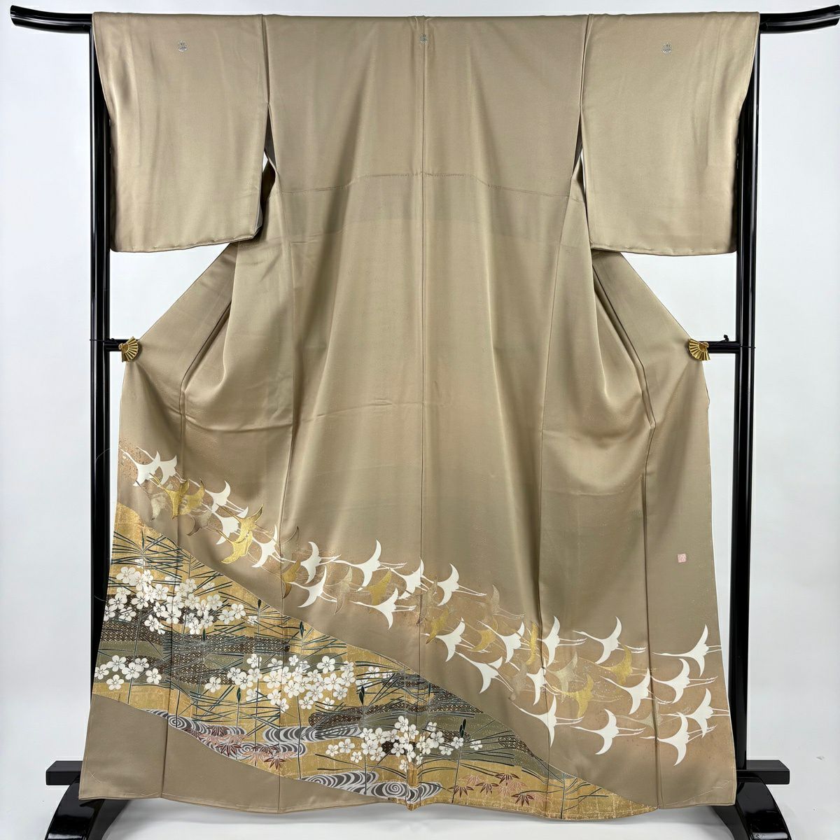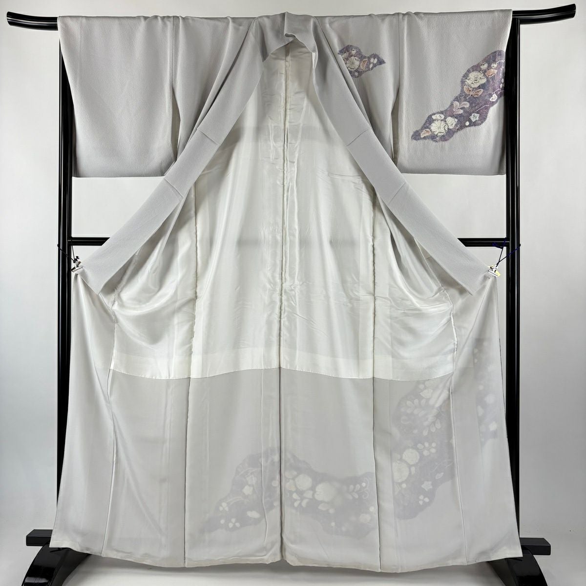 付下げ 身丈152.5cm 裄丈61.5cm S 袷 松尾光琳 落款あり お仕覆 器物 銀糸 灰茶 正絹 秀品